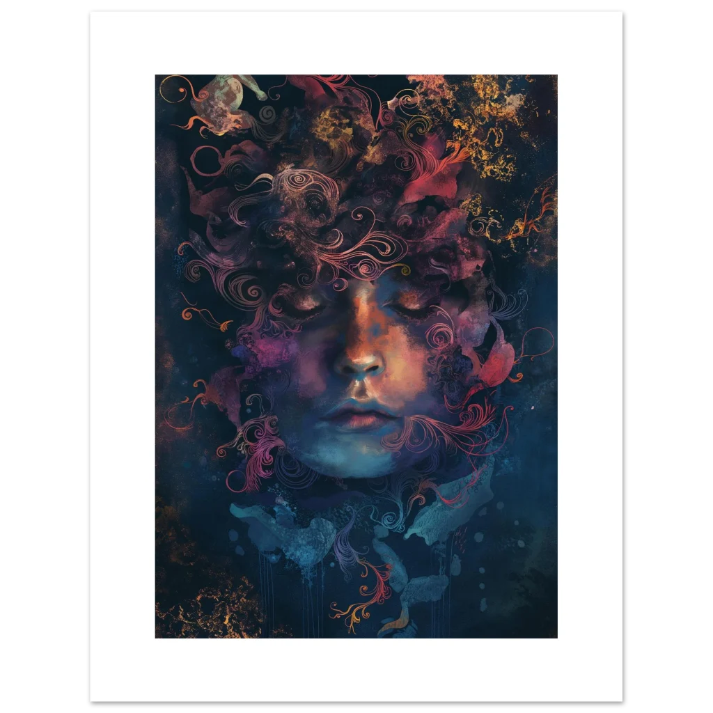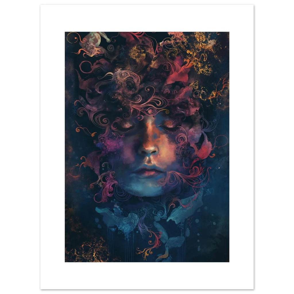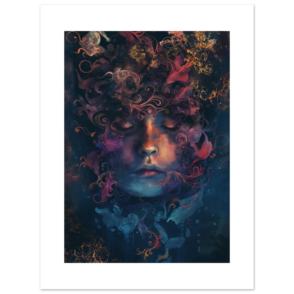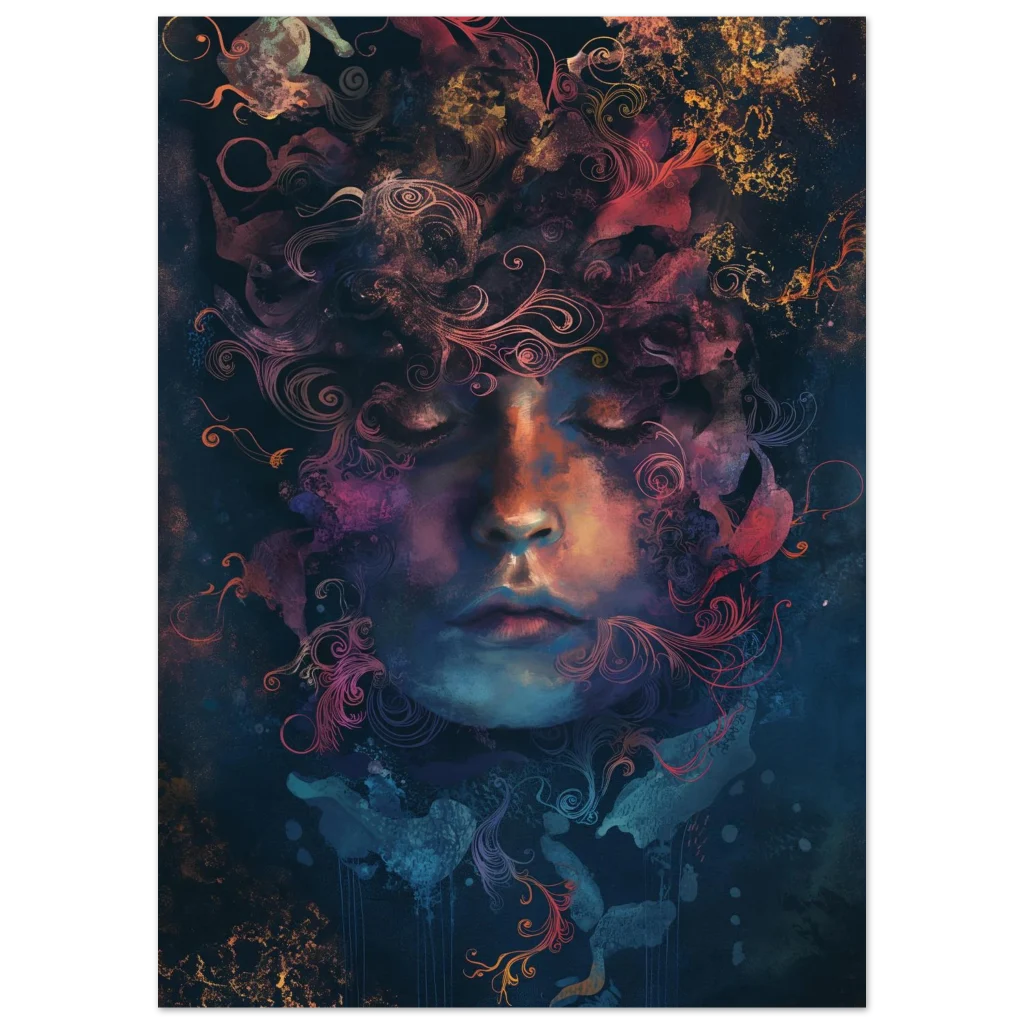 Immerse your space in the tranquil beauty of ‘Cosmic Reverie,’ an ethereal portrait that captures a moment of profound peace and inner universe. This artwork, with its celestial blend of deep blues, warm oranges, and soft purples, invites introspection and wonder, transforming any room into a sanctuary of artistic expression. The intricate, swirling patterns emanating from the figure’s head evoke a sense of cosmic energy and dreamlike serenity.