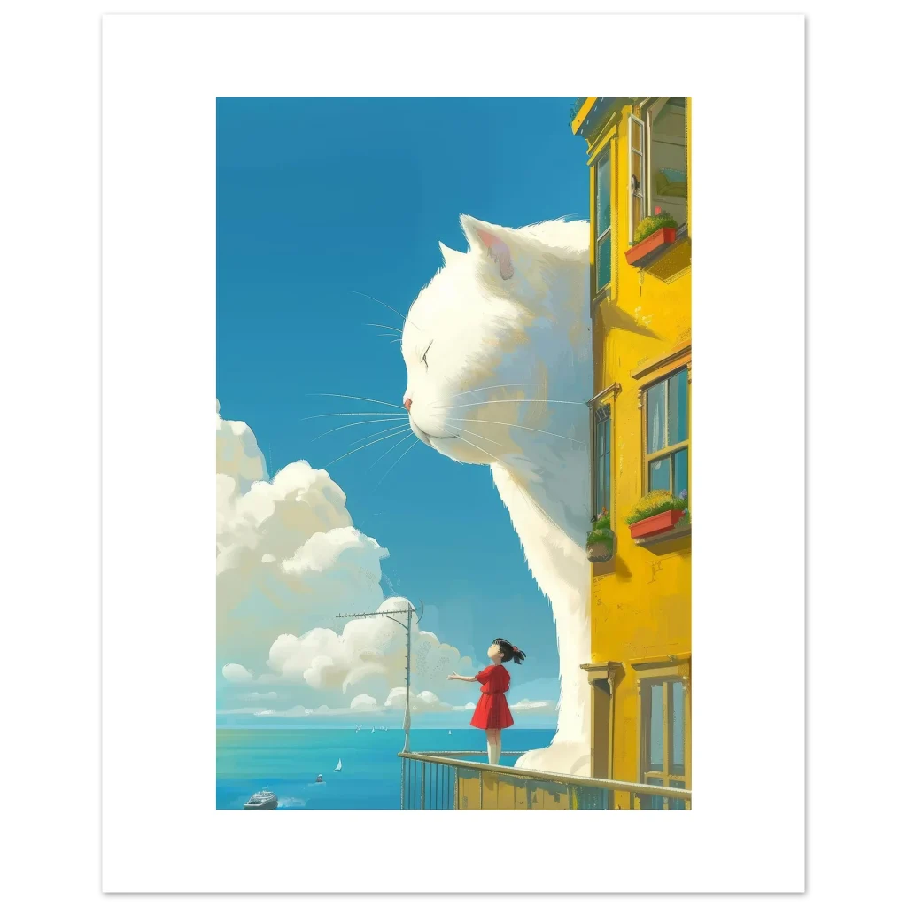 Invite a touch of magic and wonder into your space with this enchanting art print. Featuring a gentle giant cat gazing serenely alongside a curious little girl, this piece captures a whimsical moment of unexpected friendship against a vibrant blue sky and a charming yellow building. It’s an imaginative escape, perfect for adding a sense of awe and dreamy delight to any room.