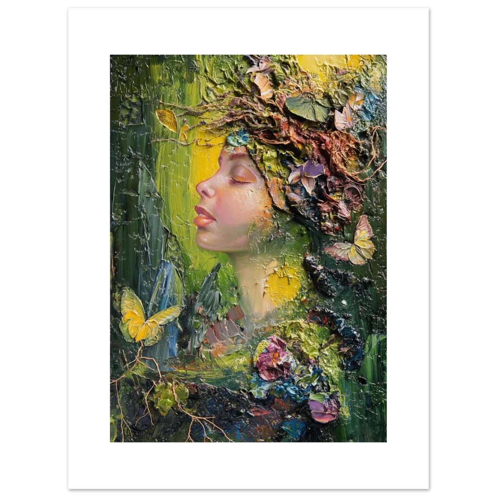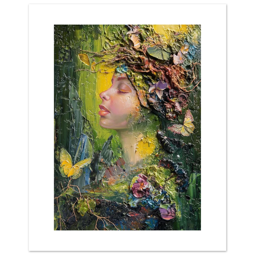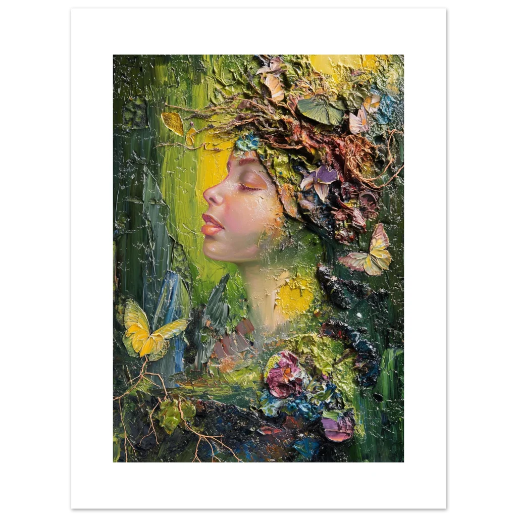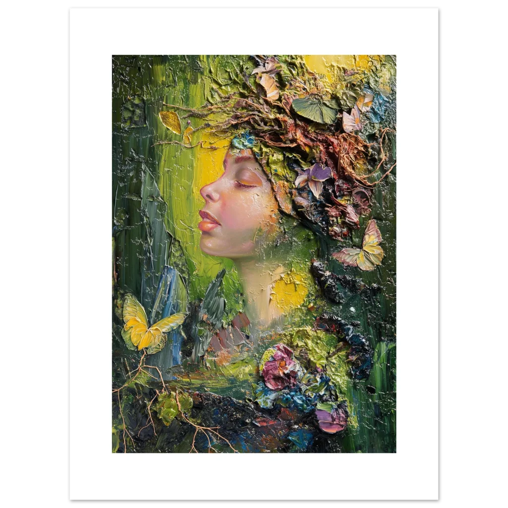Immerse yourself in the vibrant, textural beauty of our ‘Nature Goddess’ art print. This stunning piece, originally crafted with expressive palette knife strokes, captures a serene profile adorned with a lush, organic crown of blossoms, butterflies, and foliage. The rich impasto technique and harmonious blend of deep greens, golden yellows, and soft floral hues evoke a sense of peaceful communion with nature, bringing an enchanting, dreamlike atmosphere to any space.