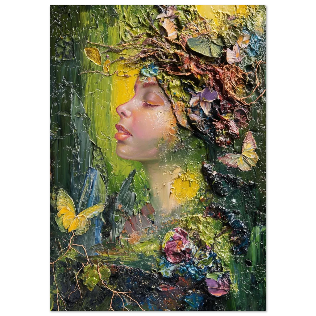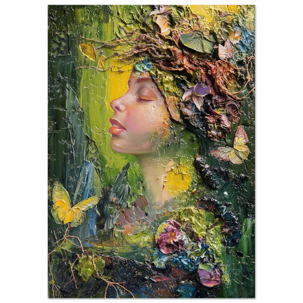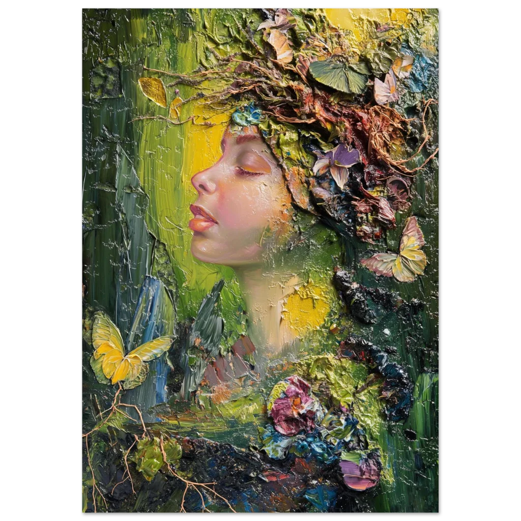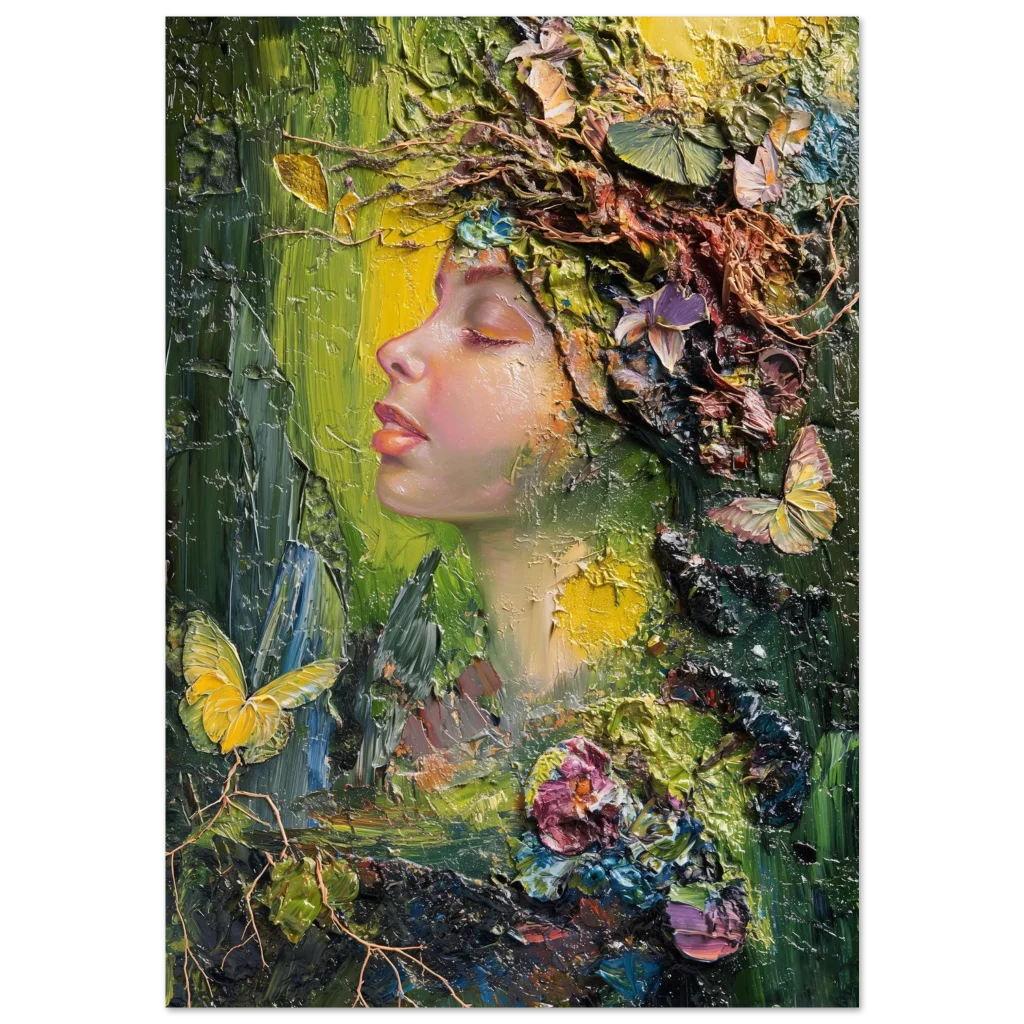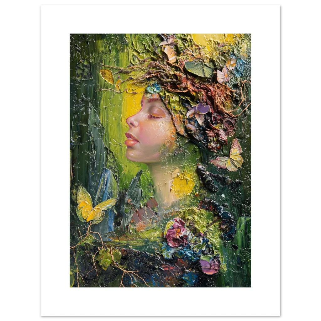 Immerse yourself in the vibrant, textural beauty of our ‘Nature Goddess’ art print. This stunning piece, originally crafted with expressive palette knife strokes, captures a serene profile adorned with a lush, organic crown of blossoms, butterflies, and foliage. The rich impasto technique and harmonious blend of deep greens, golden yellows, and soft floral hues evoke a sense of peaceful communion with nature, bringing an enchanting, dreamlike atmosphere to any space.