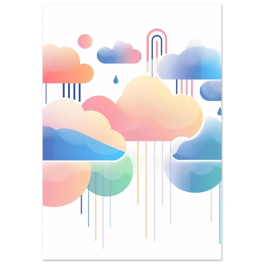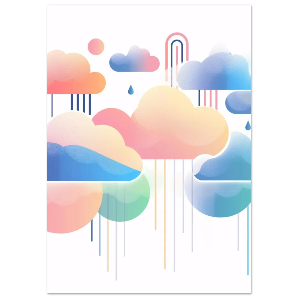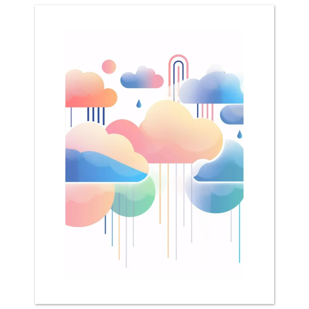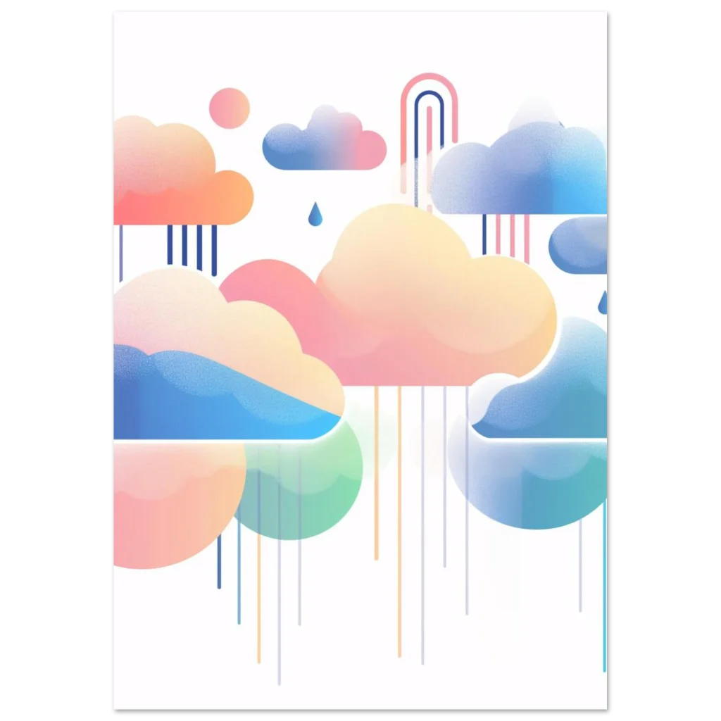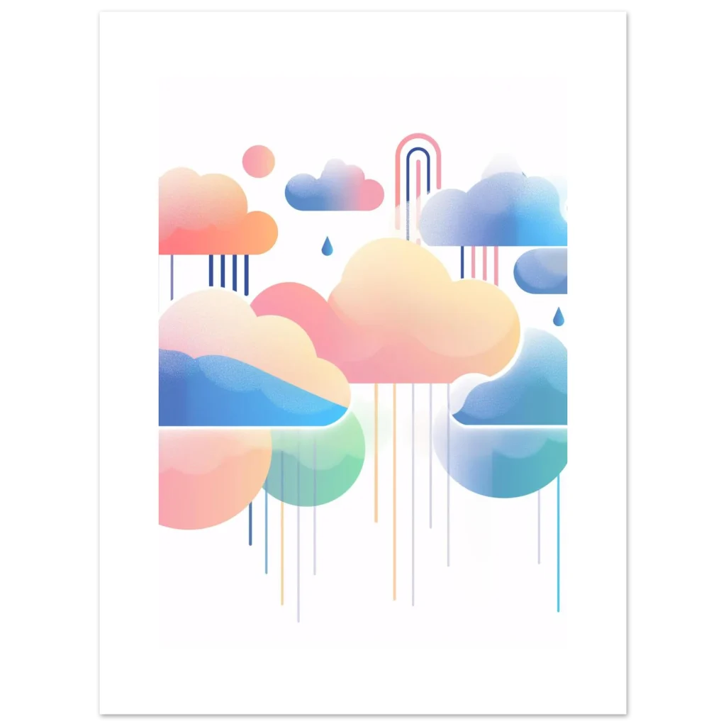 Float into a world of serene beauty with our Dreamy Pastel Clouds & Raindrops poster. This whimsical artwork, featuring a soft palette of pinks, blues, and gentle greens, brings a calming and imaginative touch to any room. The delicate interplay of stylized clouds, falling raindrops, and a hint of a rainbow creates a tranquil atmosphere, perfect for nurseries, living spaces, or creative studios.