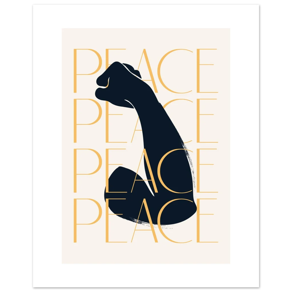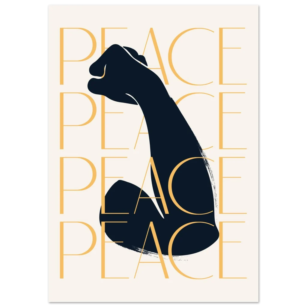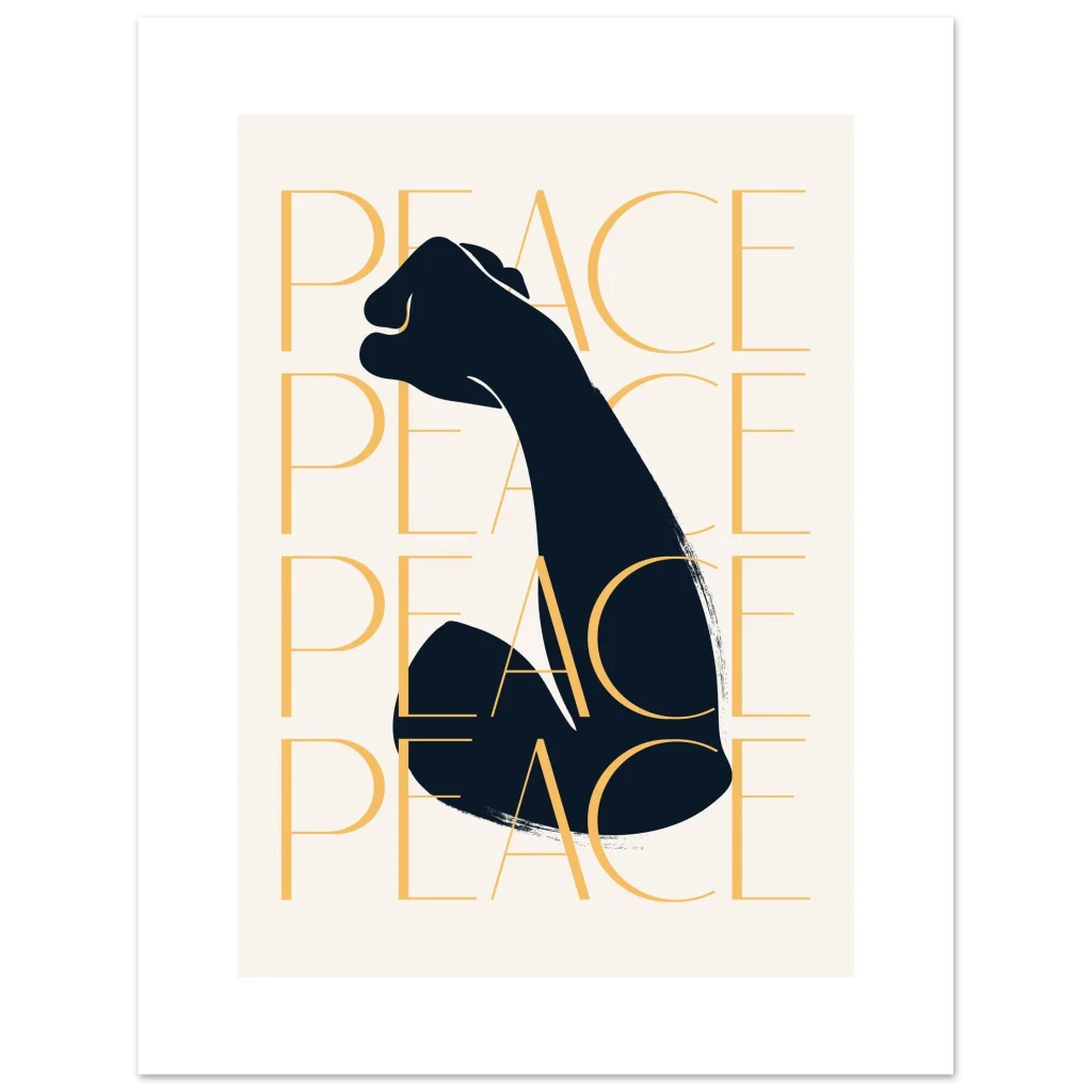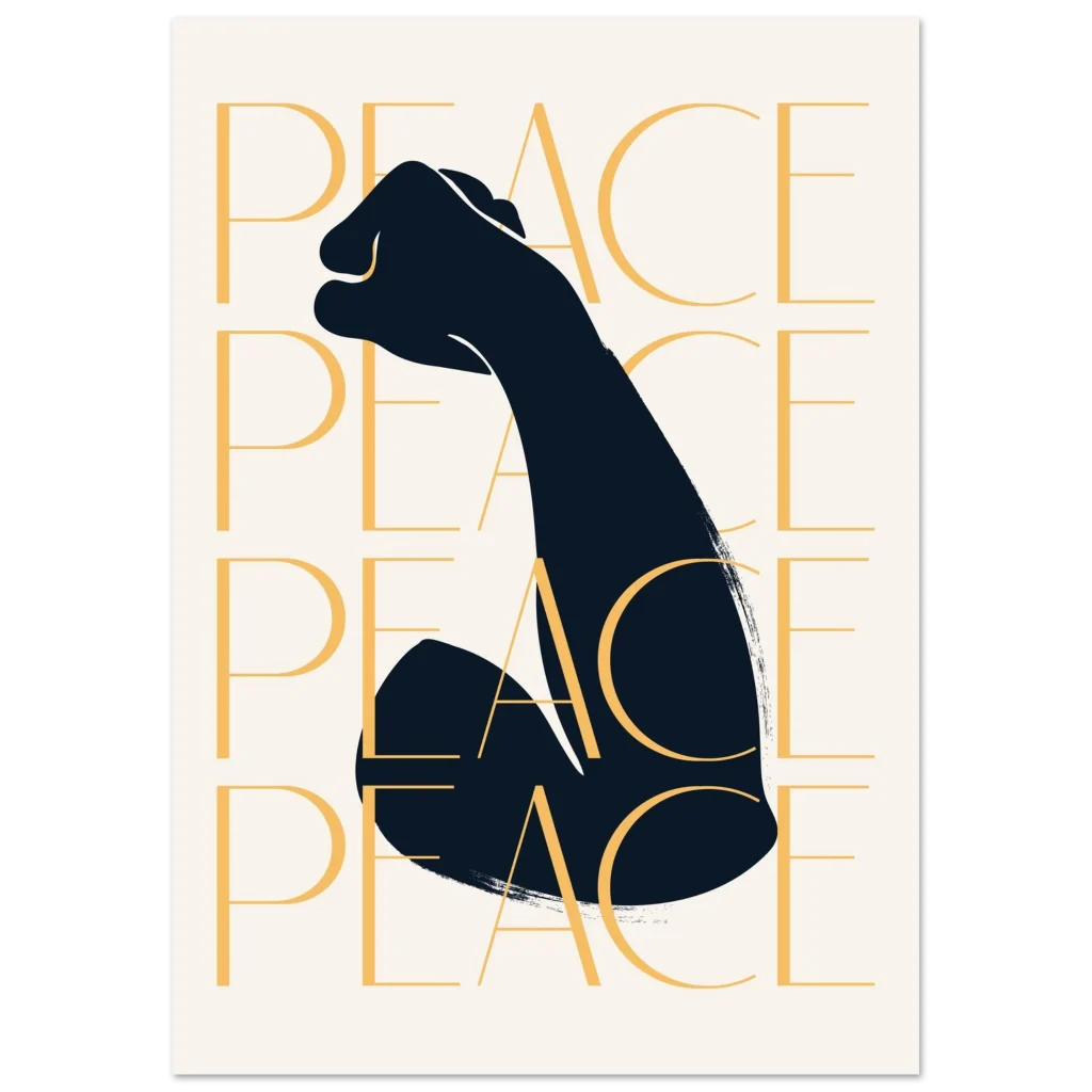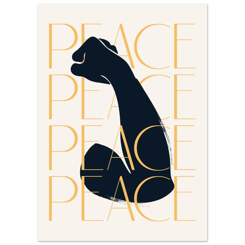 Make a bold statement with our empowering “PEACE” fist art print, a striking blend of strength and serenity. Featuring a minimalist design with a powerful silhouette and the repeated word “PEACE” in a warm golden hue, this poster brings a message of unity and calm to any space. It’s the perfect piece to inspire reflection and uplift your decor.