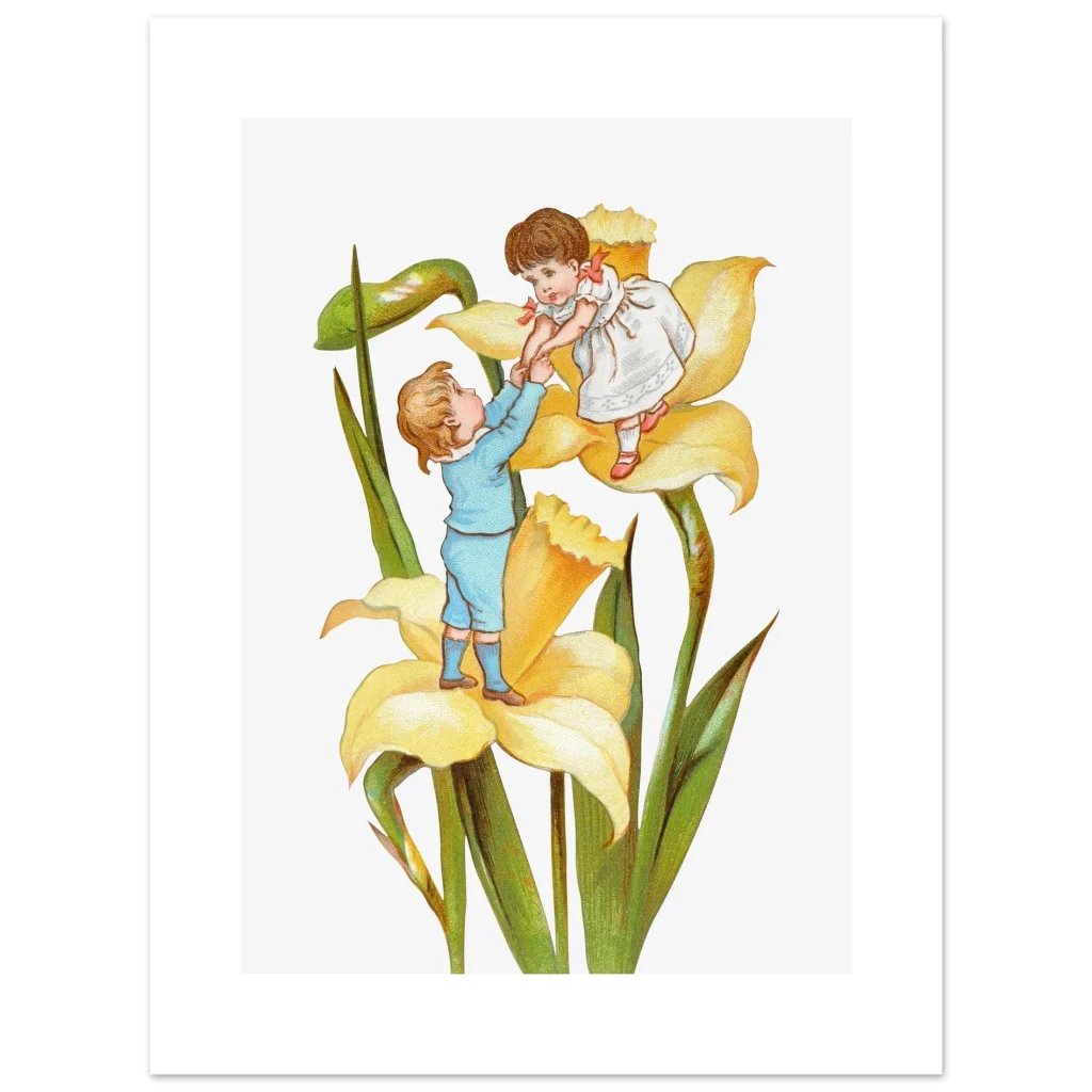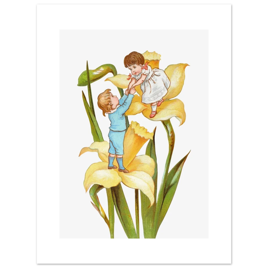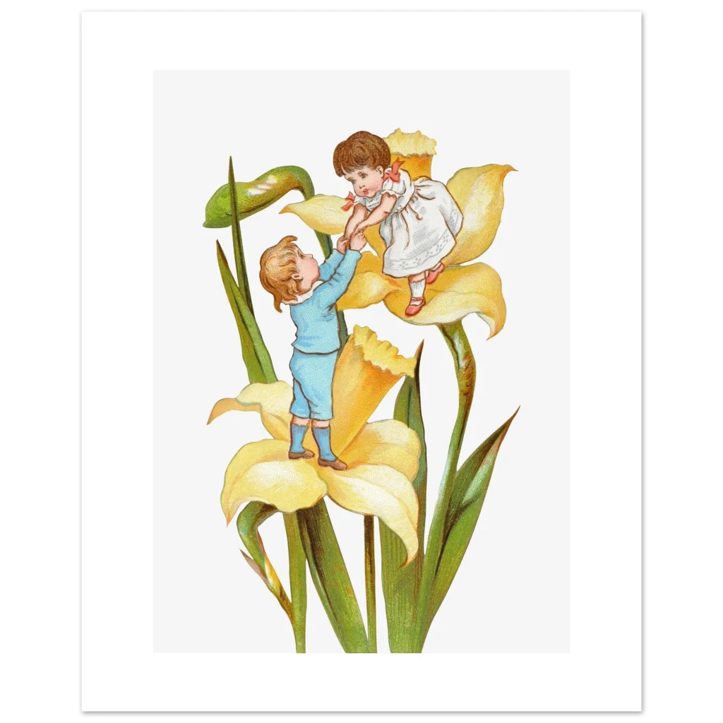 Step into a whimsical garden where childhood wonder blossoms. This enchanting poster captures a delightful vintage illustration of two children, tiny as fairies, playfully dancing among the golden petals of a grand daffodil. The soft, warm hues and charming details evoke a sense of nostalgic innocence, bringing a touch of timeless magic to any space – perfect for a nursery, play room, or a serene reading nook.