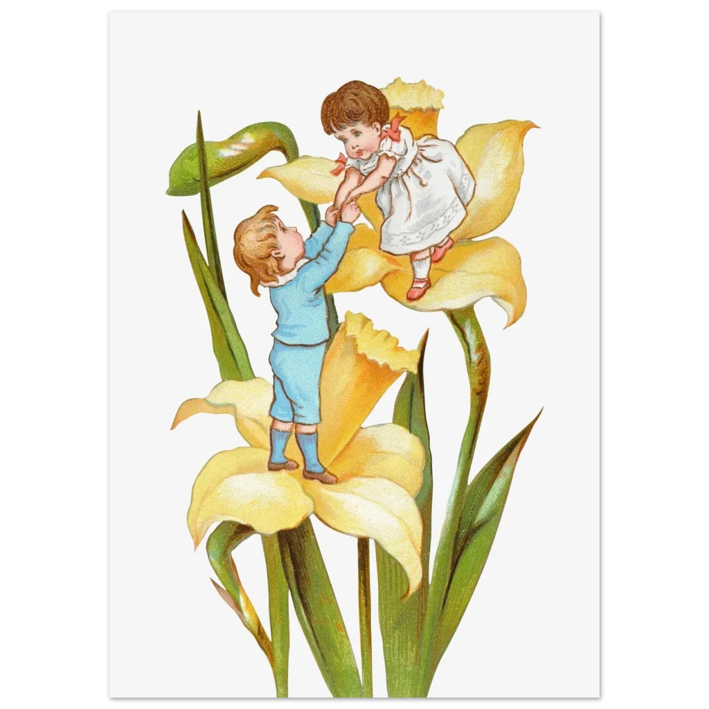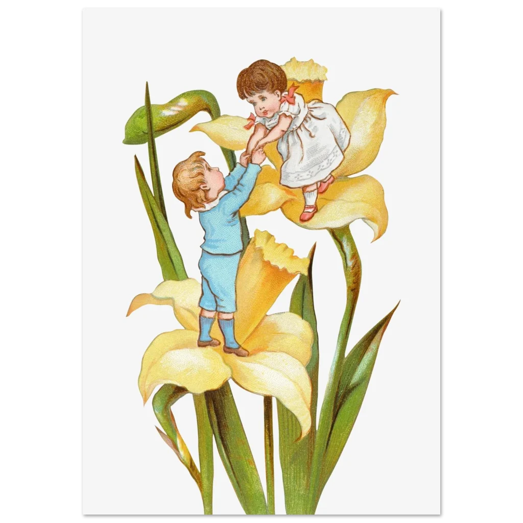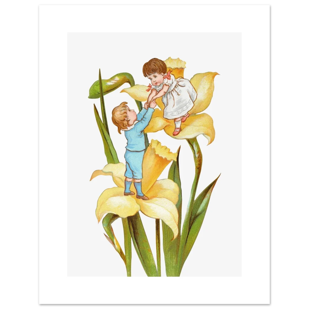 Step into a whimsical garden where childhood wonder blossoms. This enchanting poster captures a delightful vintage illustration of two children, tiny as fairies, playfully dancing among the golden petals of a grand daffodil. The soft, warm hues and charming details evoke a sense of nostalgic innocence, bringing a touch of timeless magic to any space – perfect for a nursery, play room, or a serene reading nook.