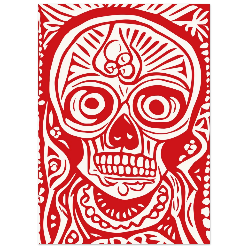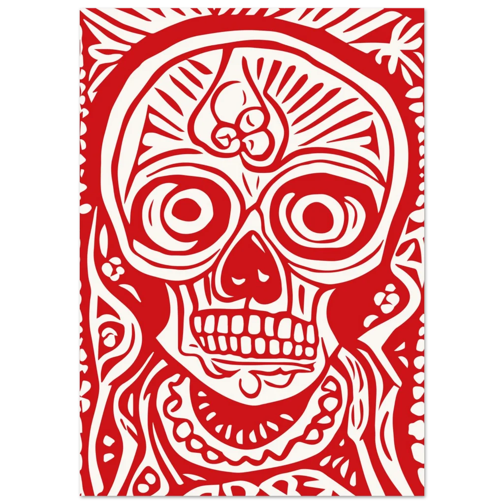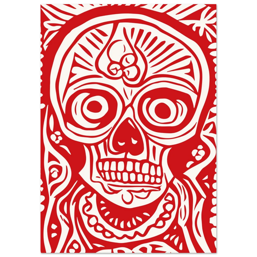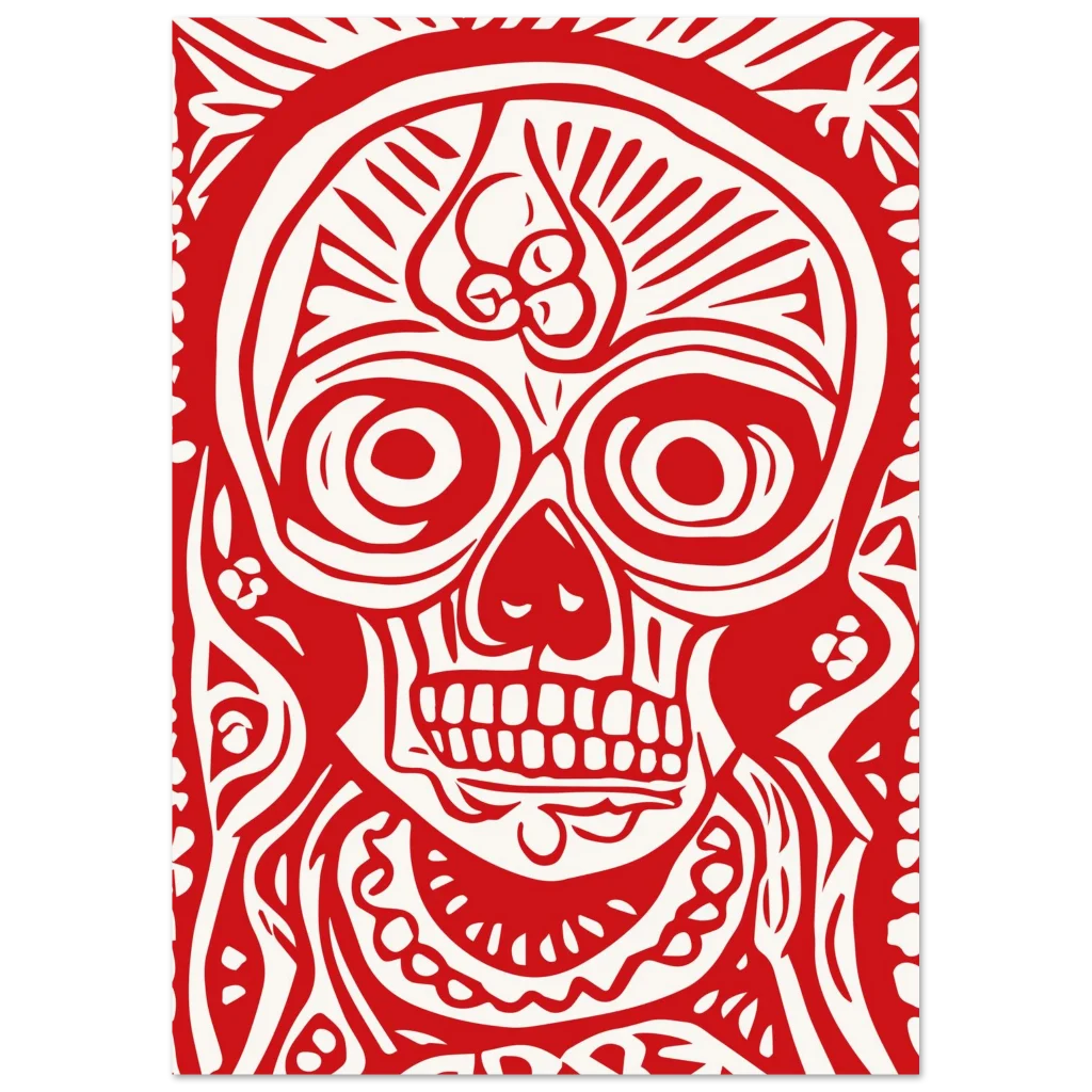 Fiery Red Folk Art Skull Premium Matte Paper Poster – Vibrant Day of the Dead Inspired Decor