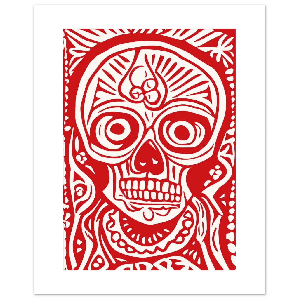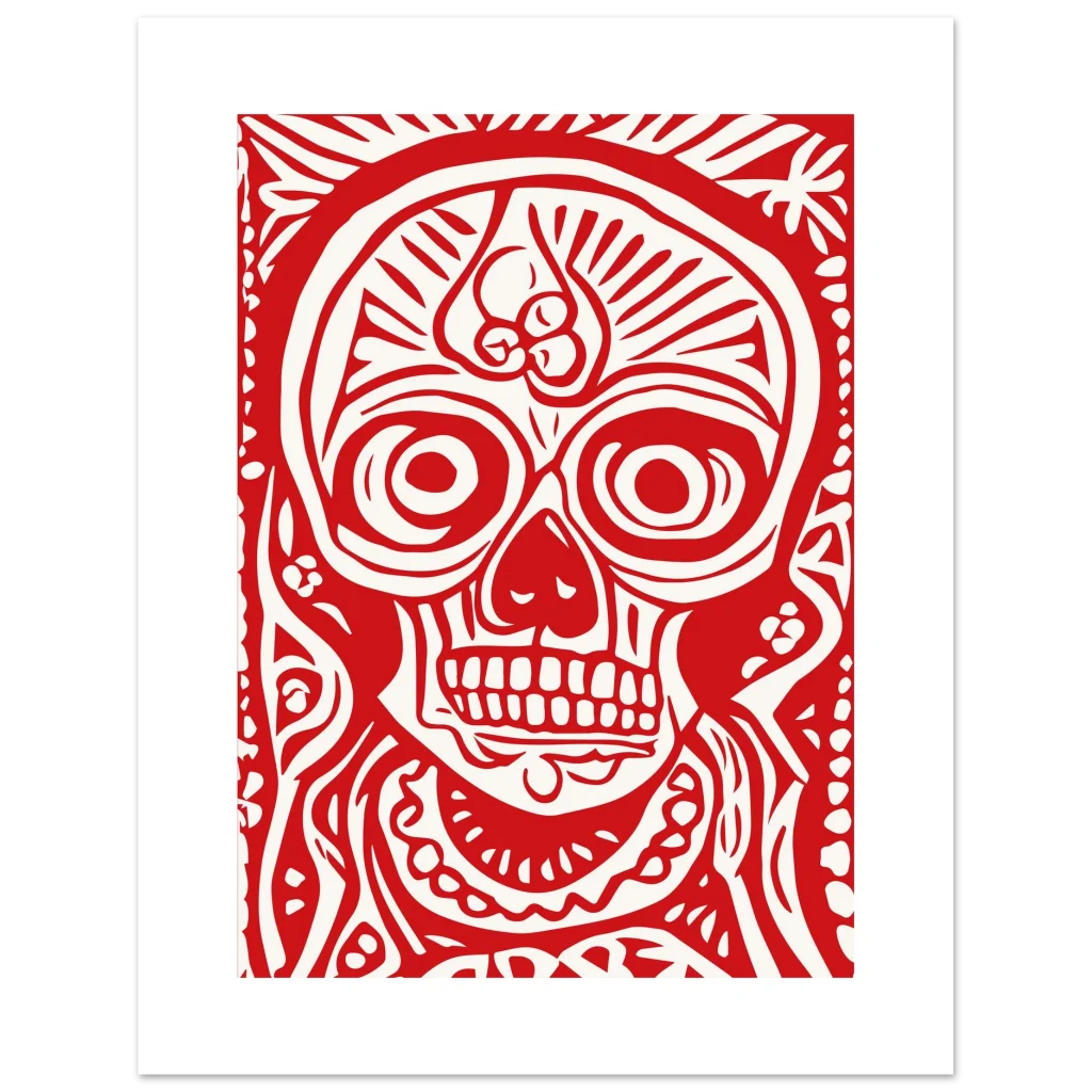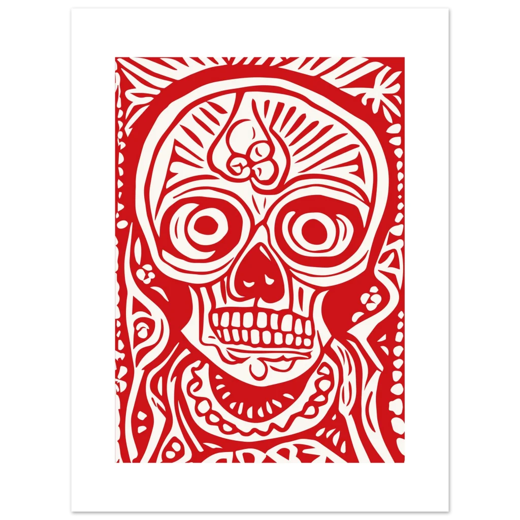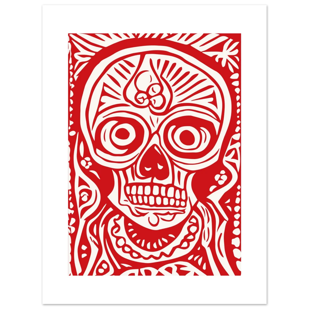 Fiery Red Folk Art Skull Premium Matte Paper Poster – Vibrant Day of the Dead Inspired Decor