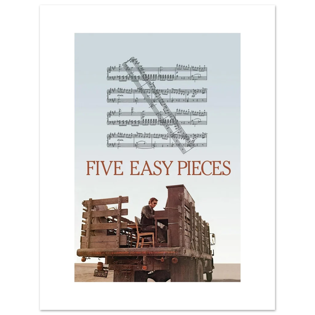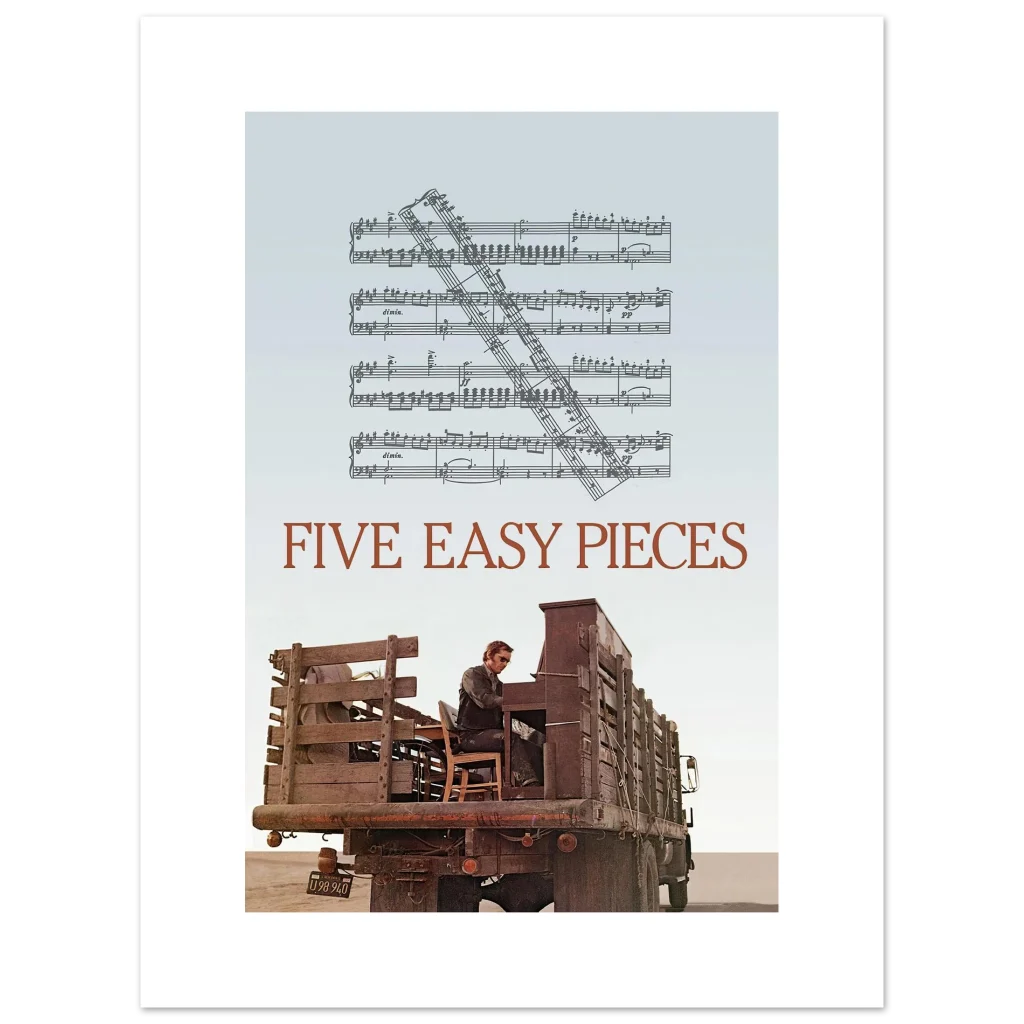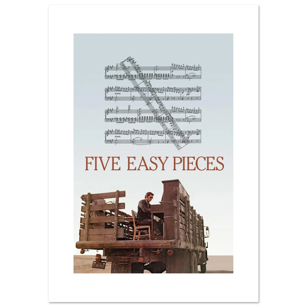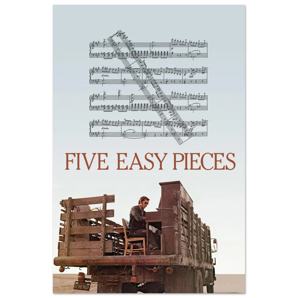 Capture the iconic, melancholic spirit of a cinematic masterpiece with our ‘Five Easy Pieces’ movie poster. This compelling print, featuring a man at a piano in the back of a truck beneath a sky of scattered sheet music, evokes a powerful sense of wanderlust and introspection. Perfect for film enthusiasts and those who appreciate the raw, artistic narrative, this poster brings a piece of cinematic history and deep emotion right into your home.