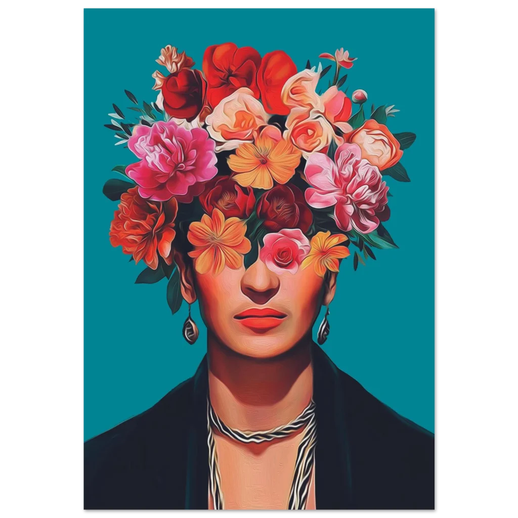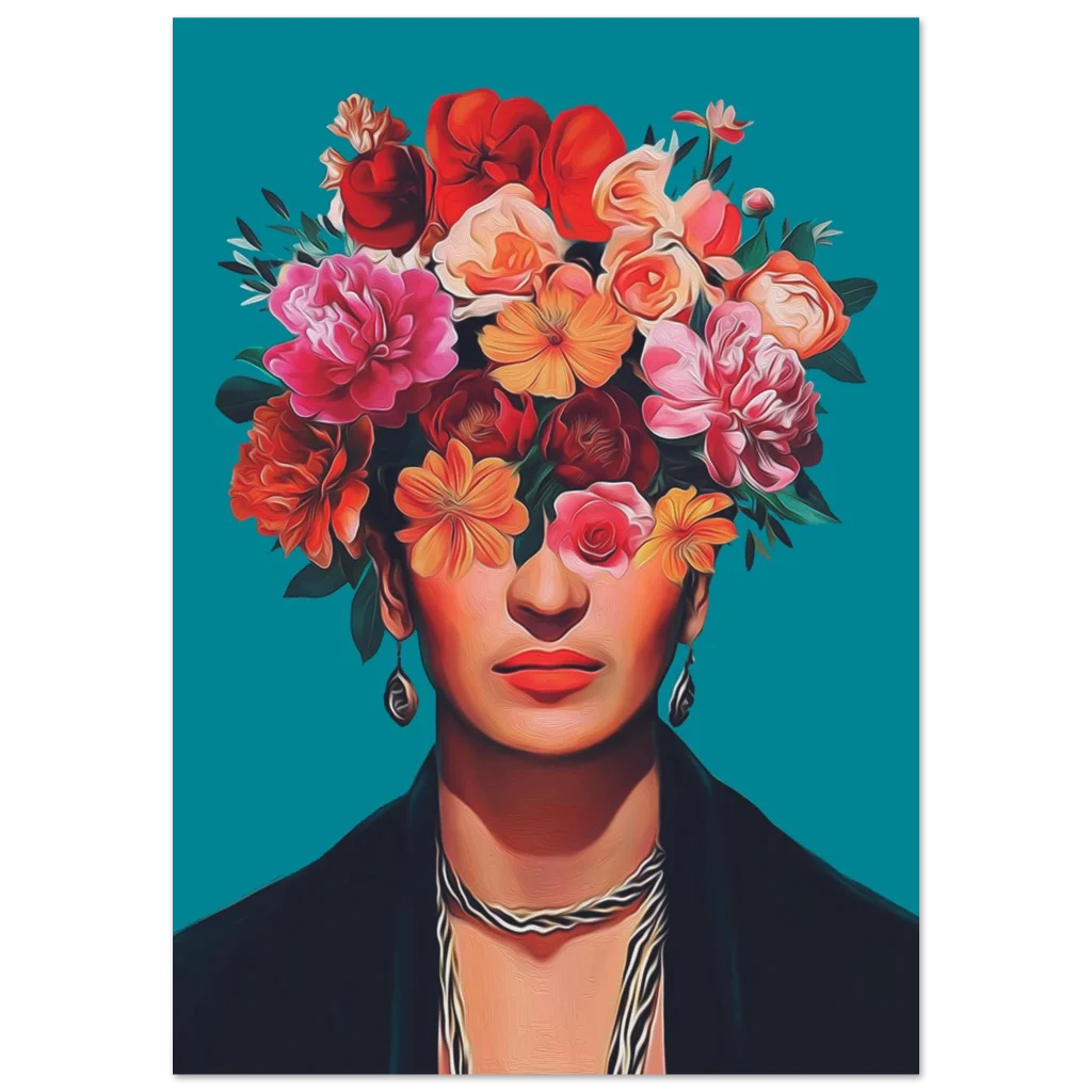 Embrace the vibrant spirit of iconic art with our Frida Kahlo-inspired floral portrait poster. This stunning piece captures a mood of bold elegance and natural beauty, featuring a rich tapestry of blooming flowers against a striking teal backdrop. It’s more than just a poster; it’s a statement piece designed to bring a touch of artistic flair and inspiring color to any room, celebrating strength and beauty.
