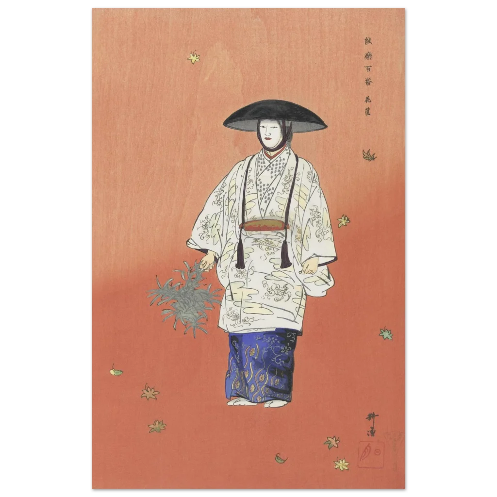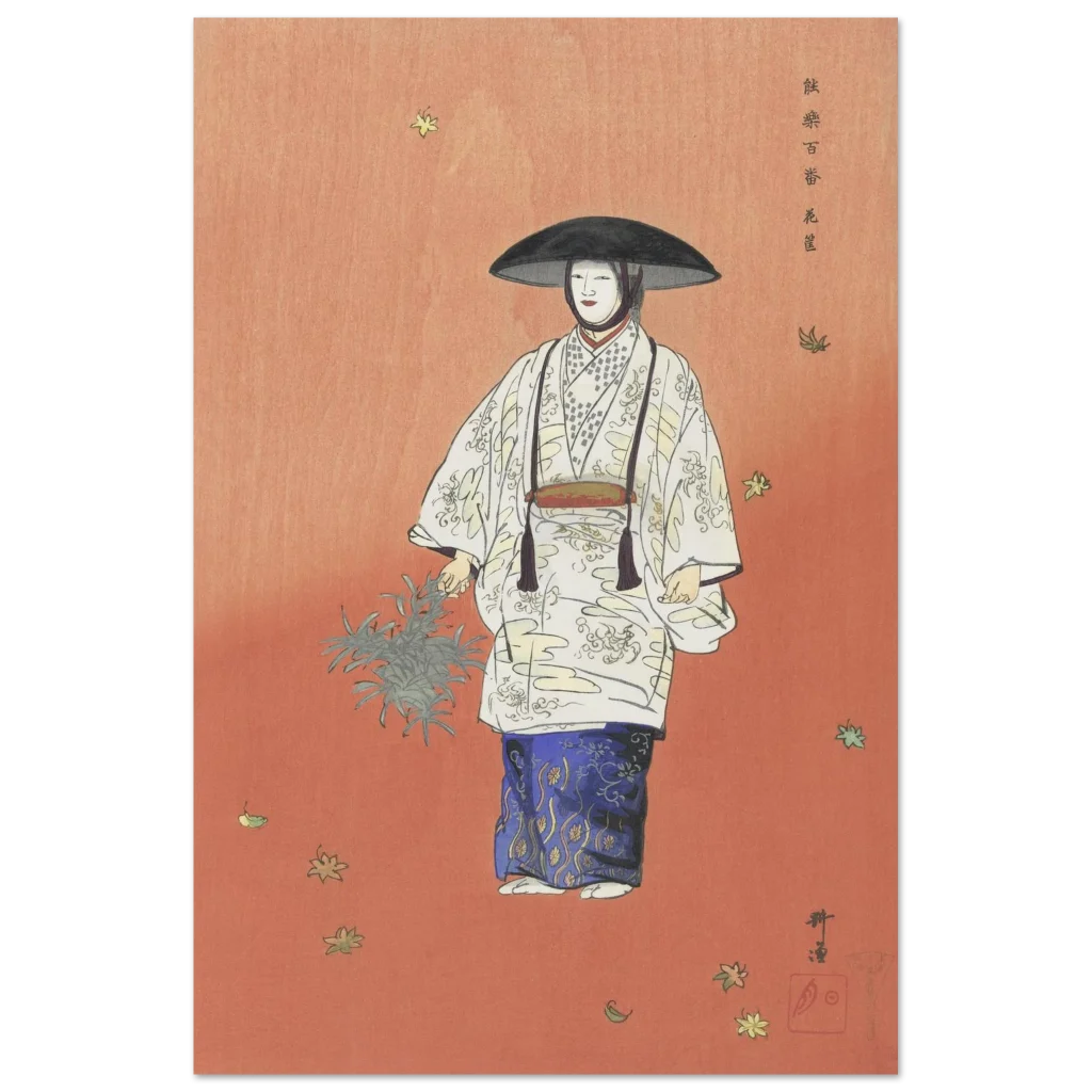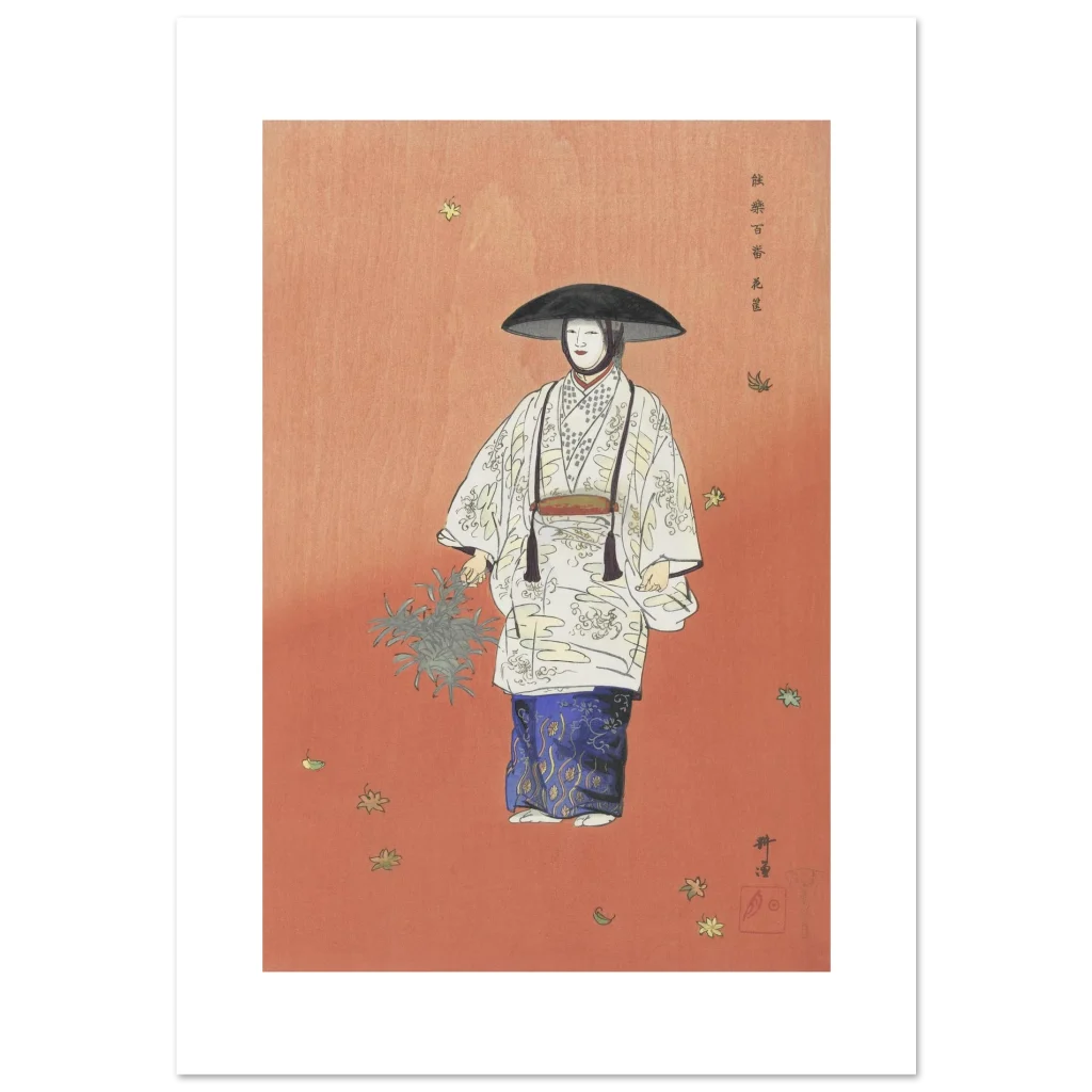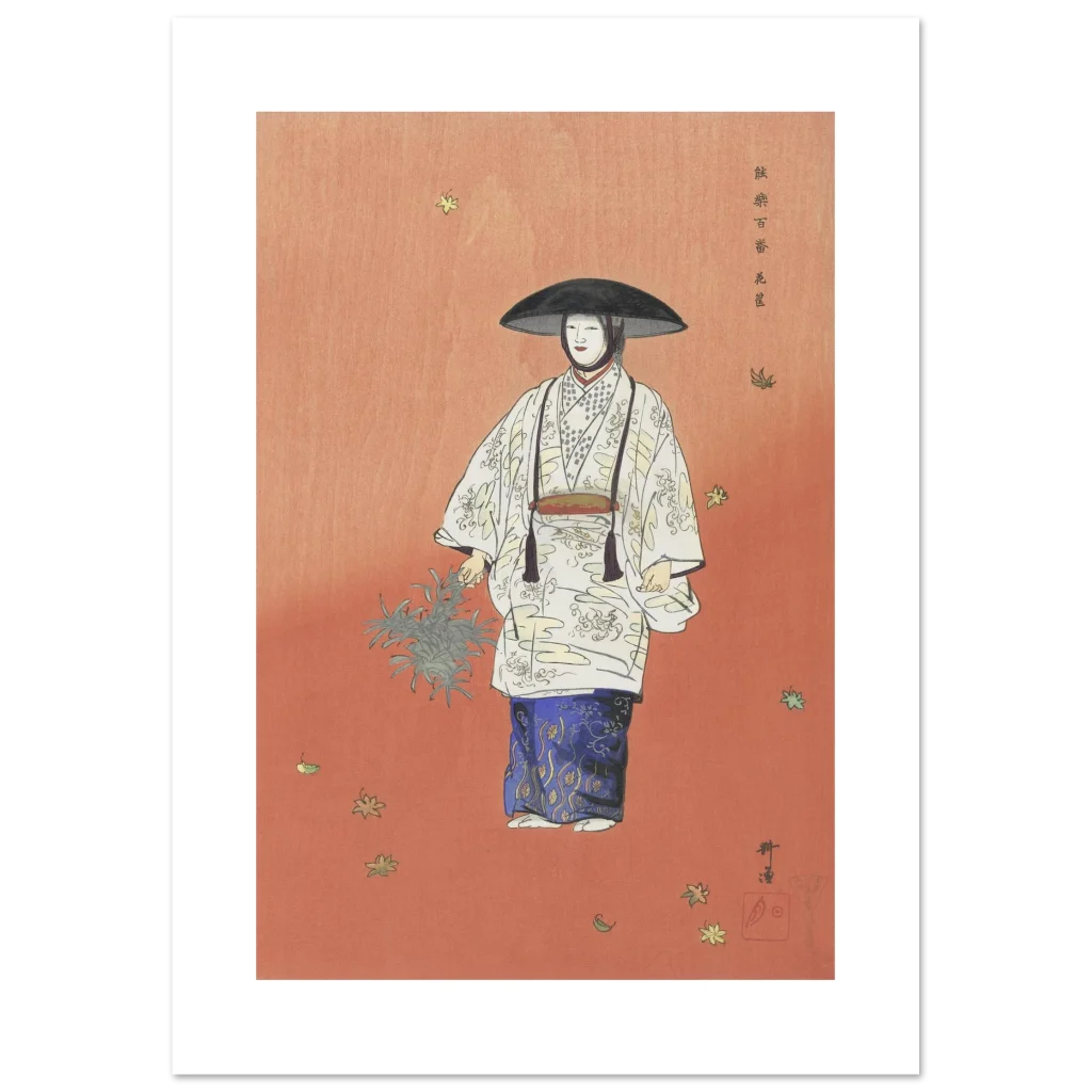 Immerse your space in the serene elegance of traditional Japanese artistry with our captivating Ukiyo-e inspired poster. Featuring a gracefully adorned figure in a vibrant kimono and broad hat, set against a warm, inviting backdrop, this piece evokes a sense of cultural depth and tranquility. The intricate details of the traditional attire and the scattering of delicate leaves create a timeless visual narrative, perfect for enriching any room with a touch of classical beauty.
