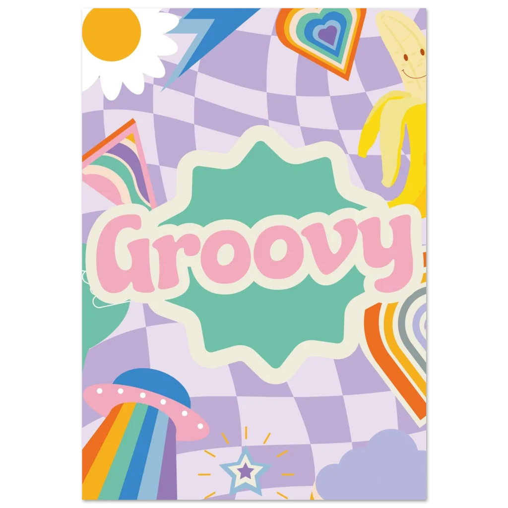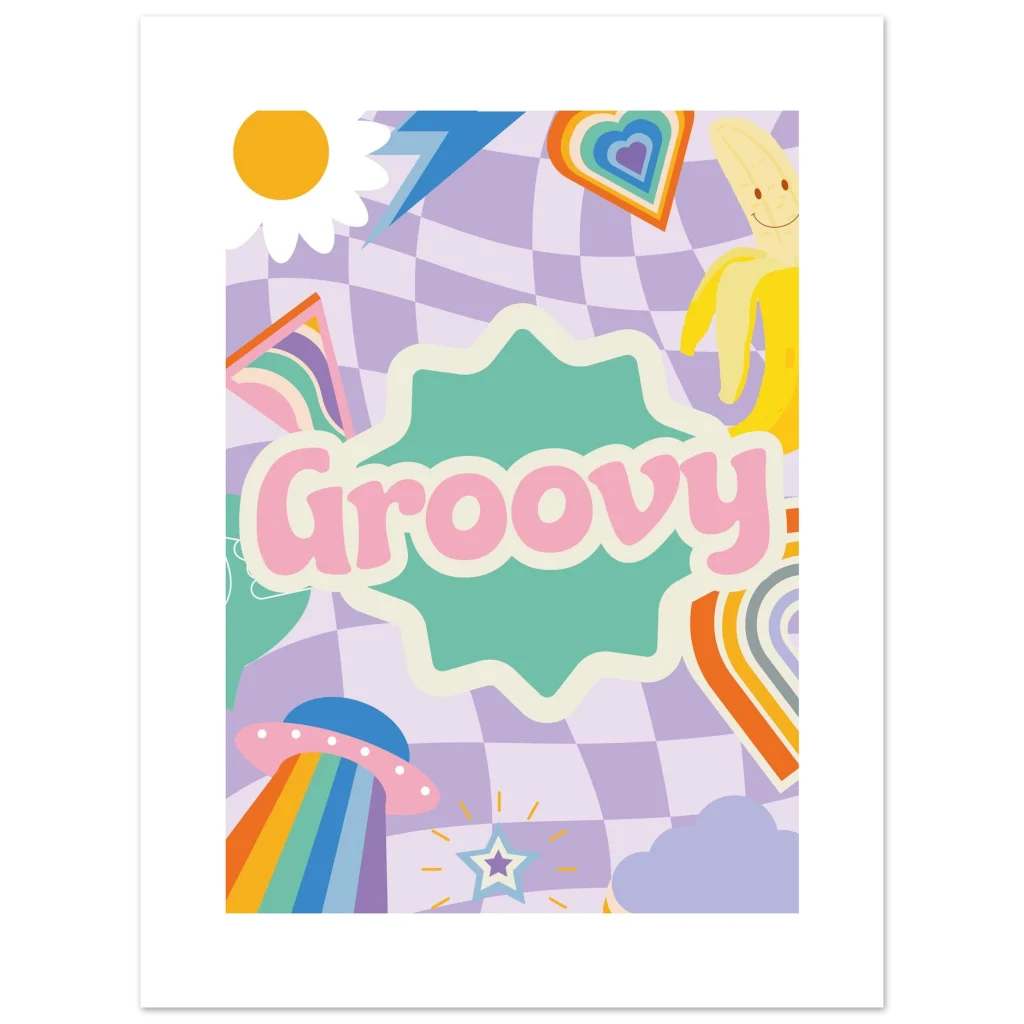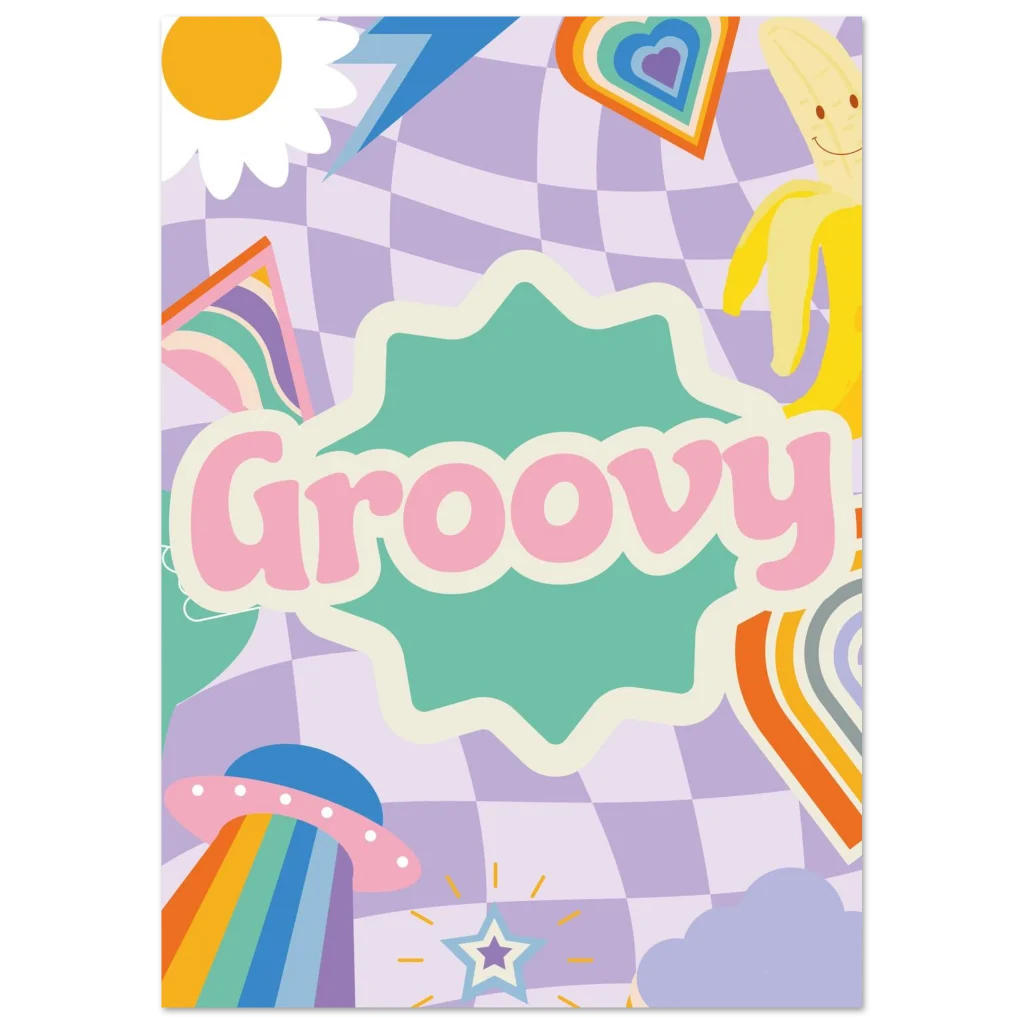 Transport your space to a world of whimsical nostalgia with our “Groovy” poster. Featuring a playful blend of pastel checkerboard, a cheerful sun, a happy banana, and a rainbow-beaming UFO, this vibrant artwork is a daily dose of good vibes. It’s perfect for adding a touch of retro charm and a pop of joyful color to any room, sparking smiles and conversation.