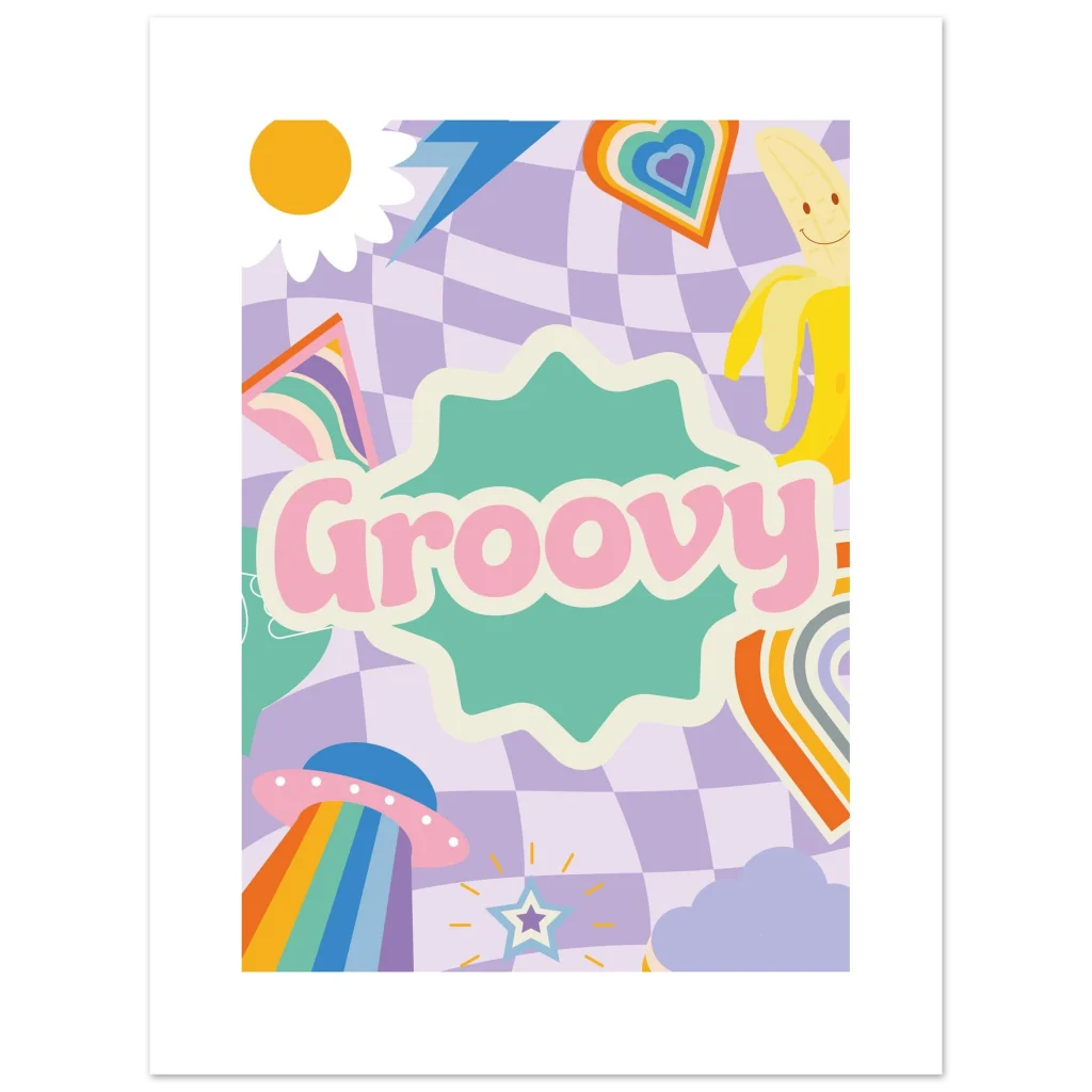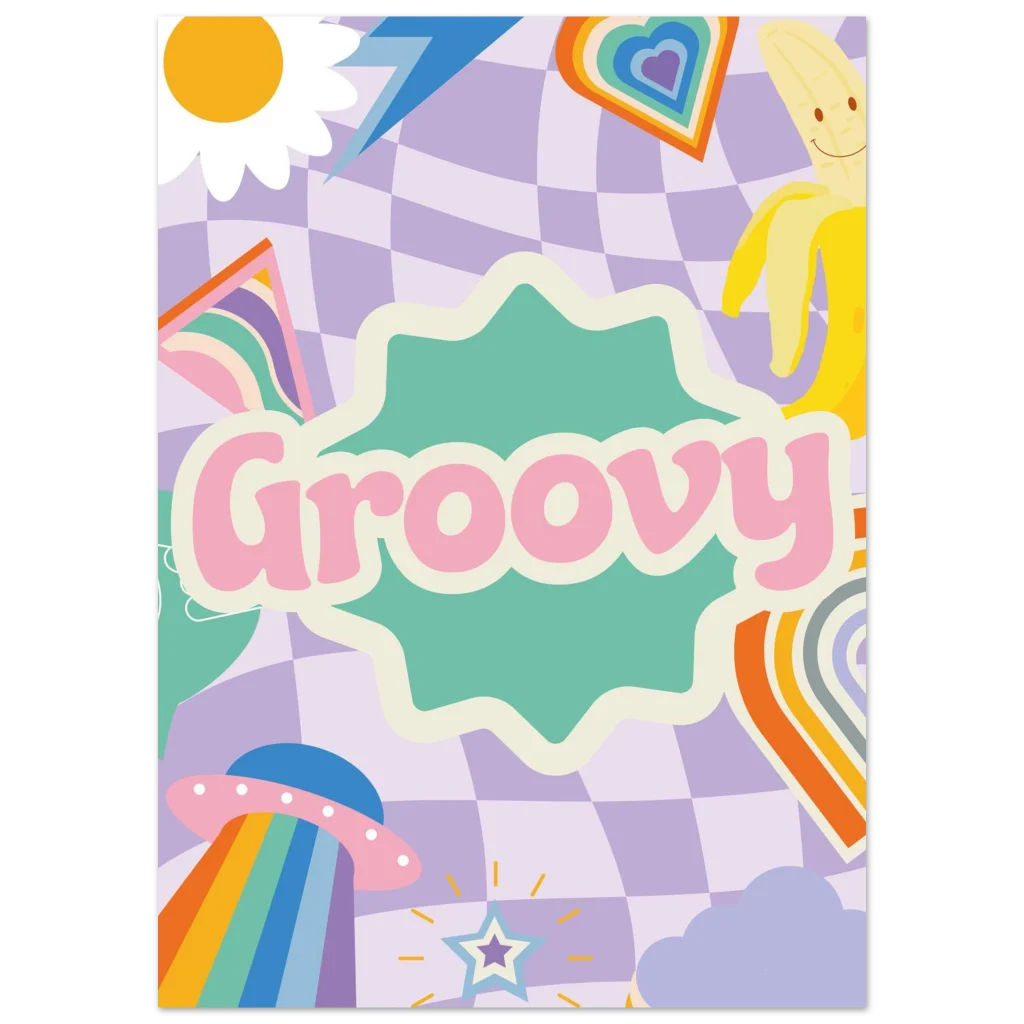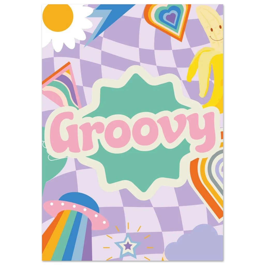 Transport your space to a world of whimsical nostalgia with our “Groovy” poster. Featuring a playful blend of pastel checkerboard, a cheerful sun, a happy banana, and a rainbow-beaming UFO, this vibrant artwork is a daily dose of good vibes. It’s perfect for adding a touch of retro charm and a pop of joyful color to any room, sparking smiles and conversation.