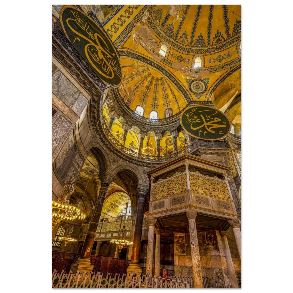 Immerse yourself in the breathtaking fusion of history and art with our Hagia Sophia Grandeur poster. This stunning piece captures the opulent golden dome and intricate Islamic calligraphy against the timeless Byzantine architecture, bringing a piece of world heritage directly into your home. The rich golden hues, deep emerald greens, and earthy tones evoke a sense of reverence and awe, transforming any space into a sanctuary of cultural beauty.