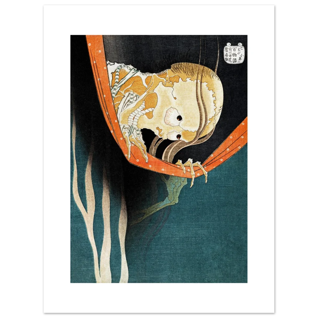 Immerse yourself in the captivating world of Hokusai with this stunning ukiyo-e masterpiece. Featuring a hauntingly beautiful ghost in shades of ethereal gold, deep teal, and vibrant orange, this poster brings the dramatic artistry of historical Japanese woodblock prints into your modern space. It’s a striking piece that sparks conversation and adds a touch of sophisticated mystery to any room.