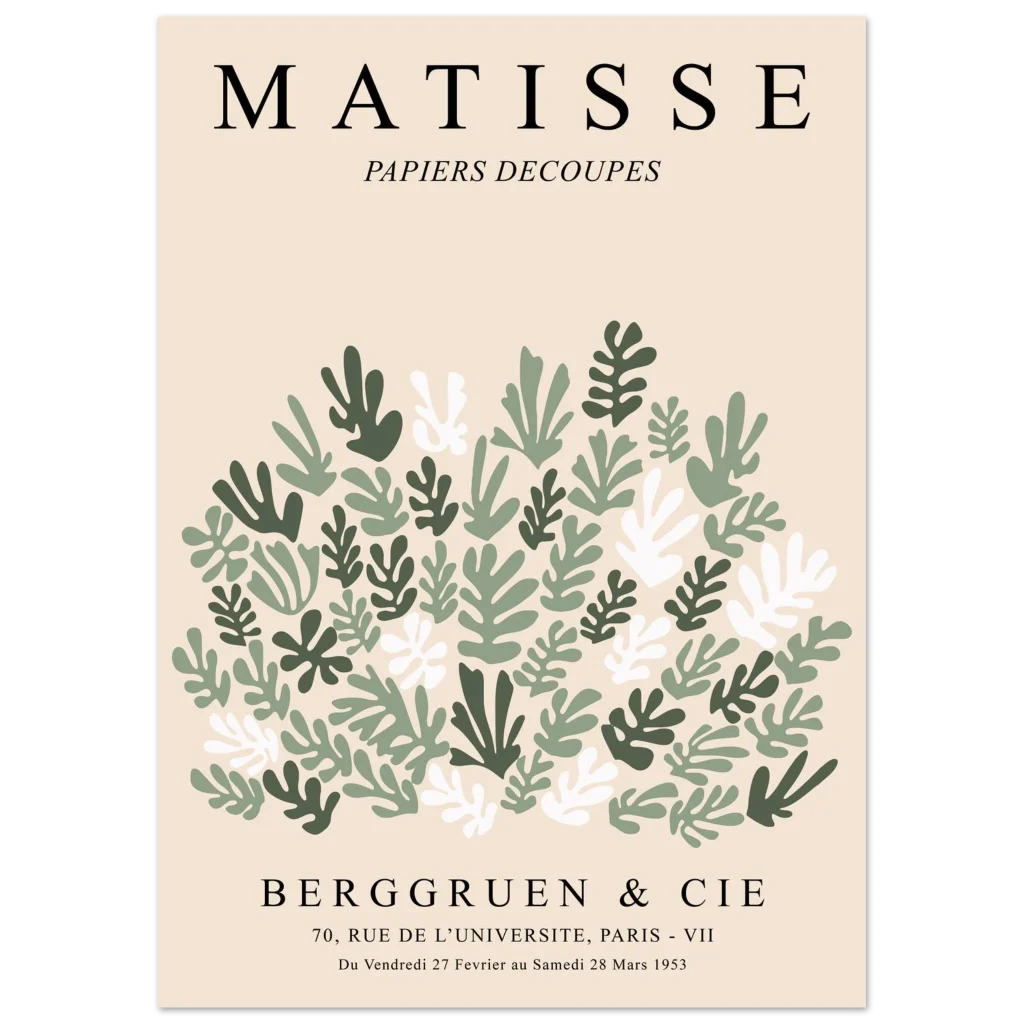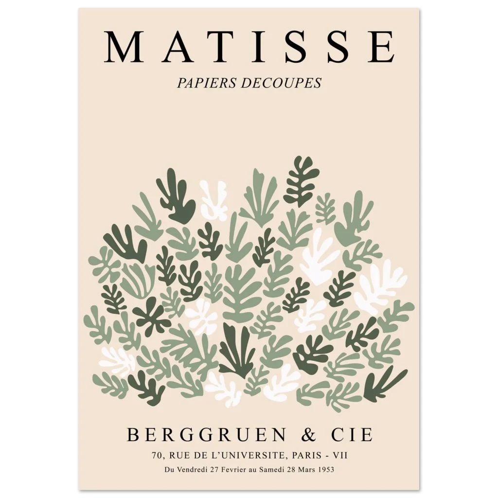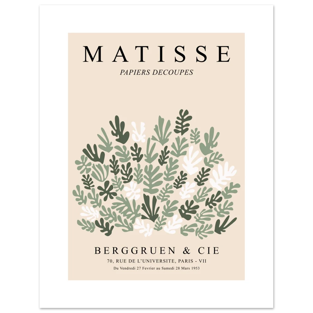 Bring the timeless elegance of Matisse’s celebrated cut-outs into your home with this captivating art print. Featuring organic leaf shapes in a soothing palette of sage green, deep olive, and soft cream against a warm, neutral background, this poster evokes a sense of calm sophistication and artistic flair. It’s an homage to modern art that perfectly complements minimalist, bohemian, or contemporary decor.