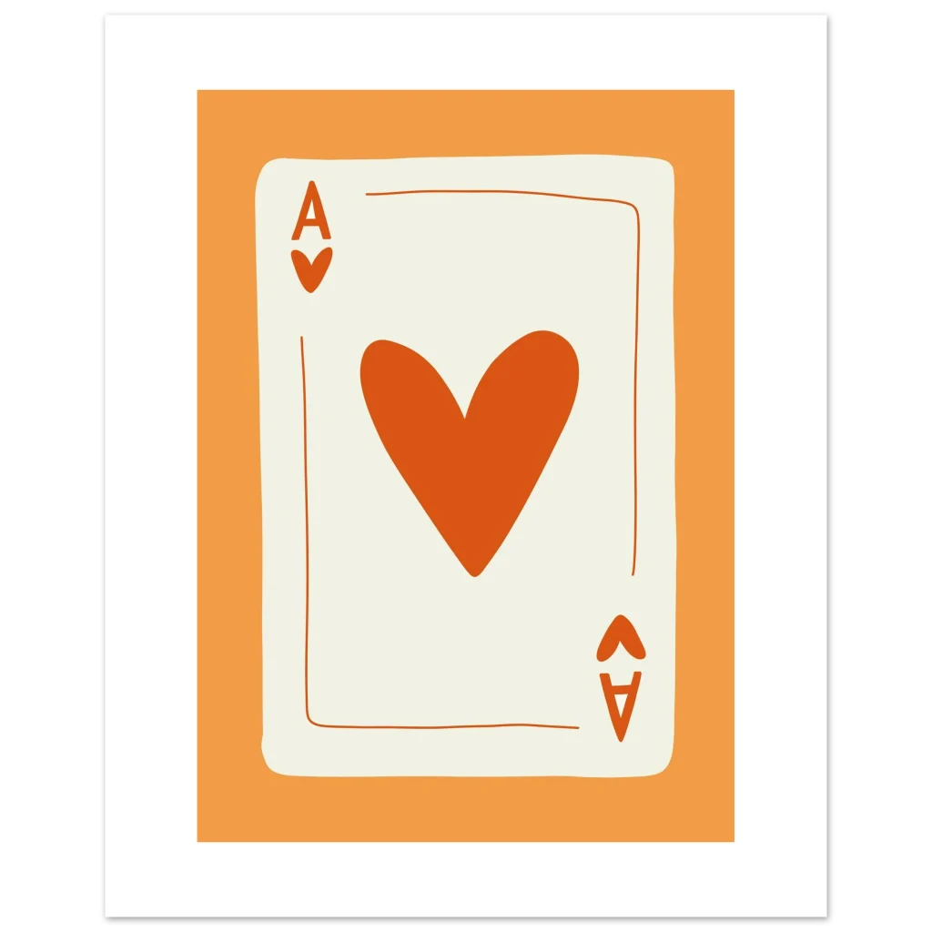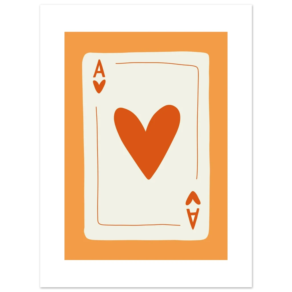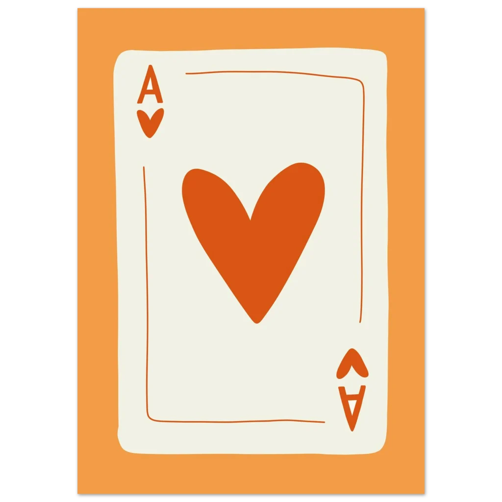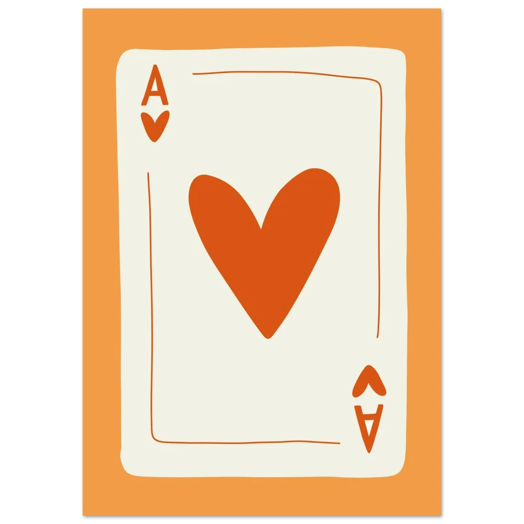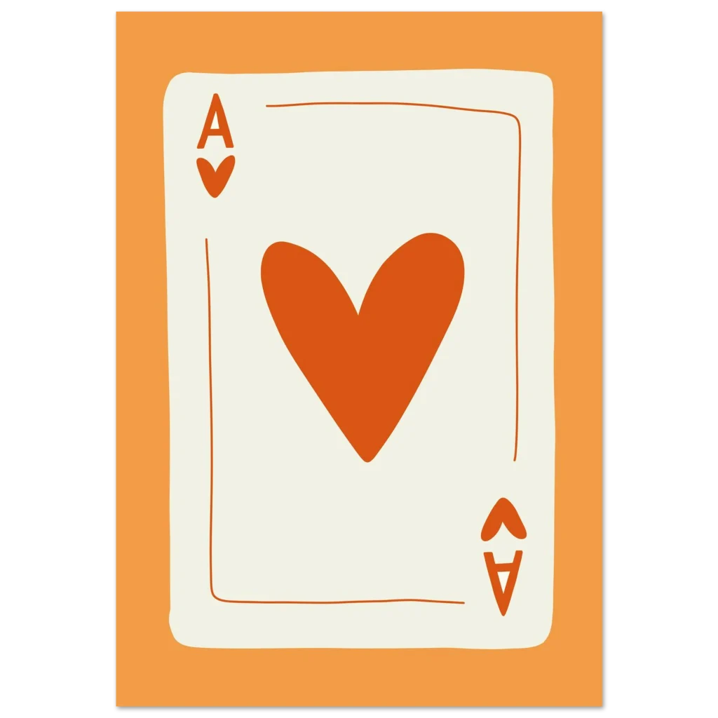 Unleash a touch of playful sophistication with our Minimalist Ace of Hearts poster. Inspired by mid-century modern aesthetics, this piece features a bold, graphic playing card design in warm orange and cream tones. It’s the perfect accent to bring a retro-chic vibe and a hint of good luck to your living space, game room, or home office.