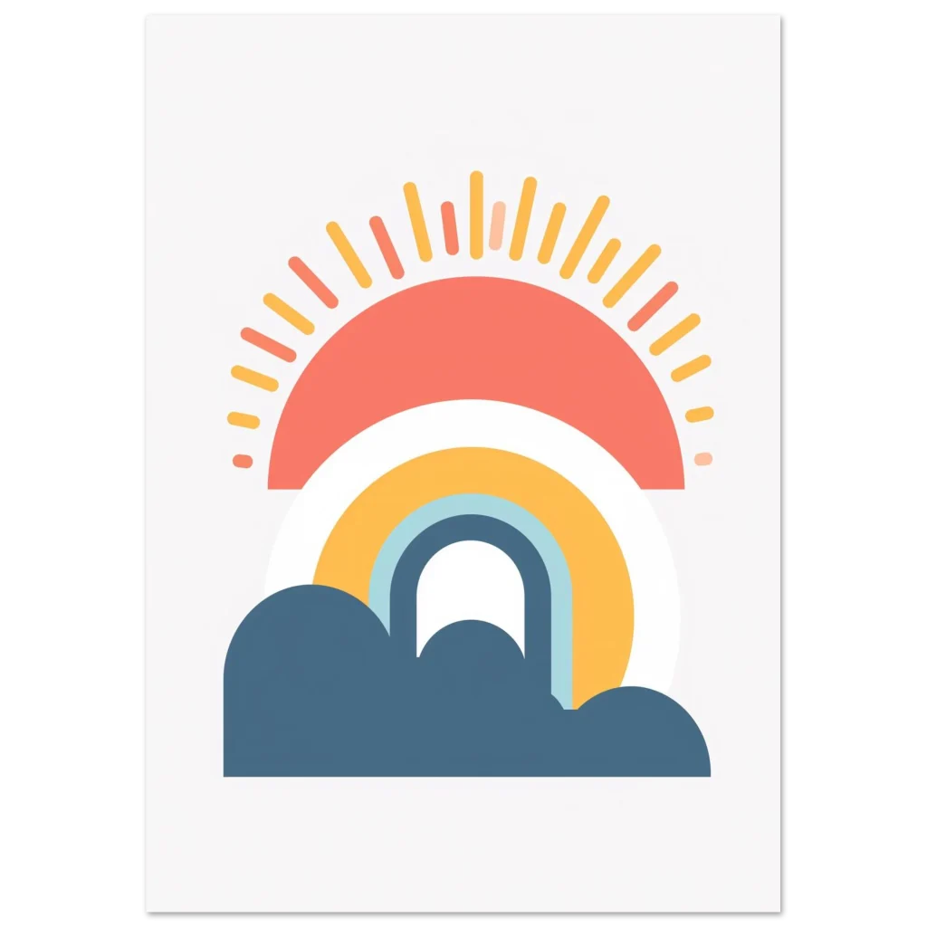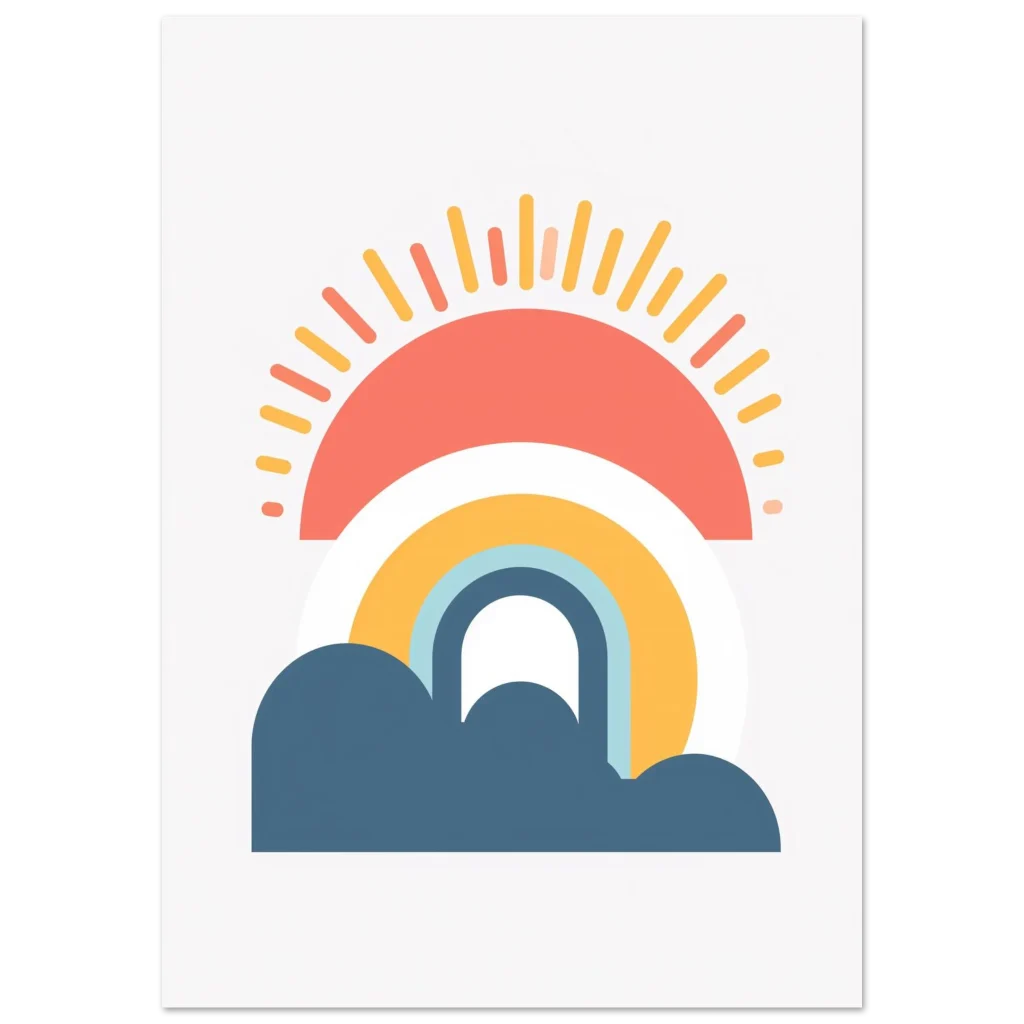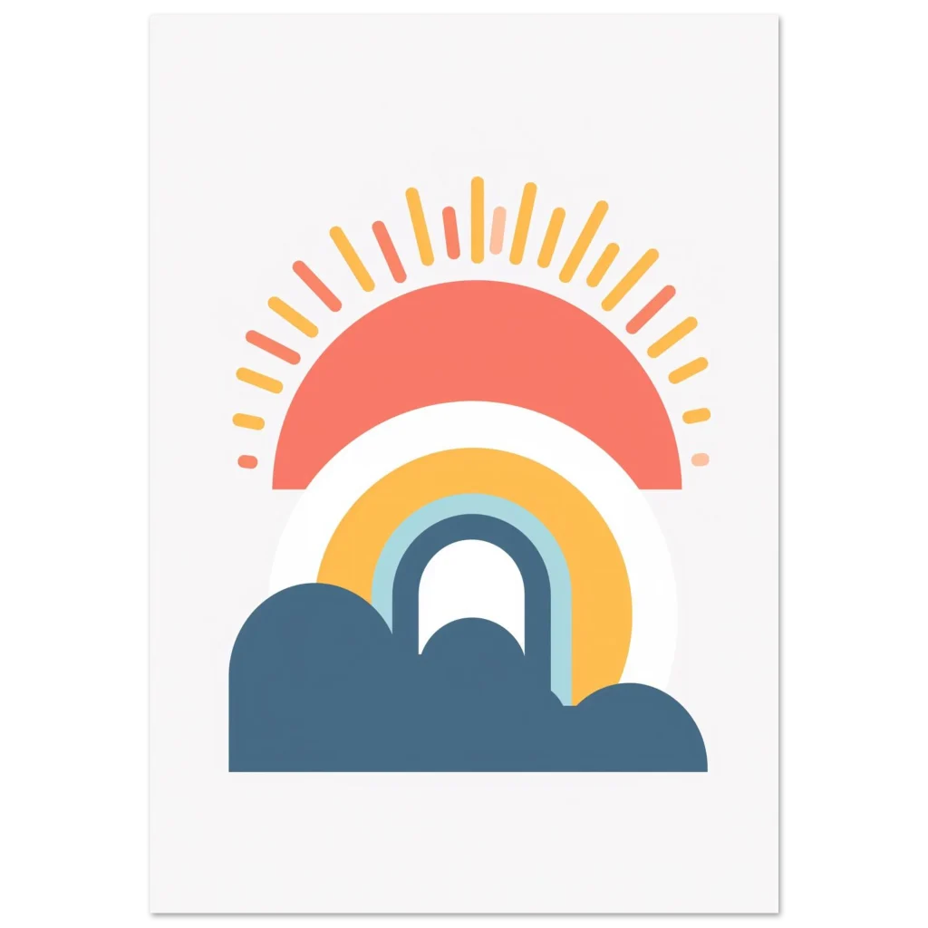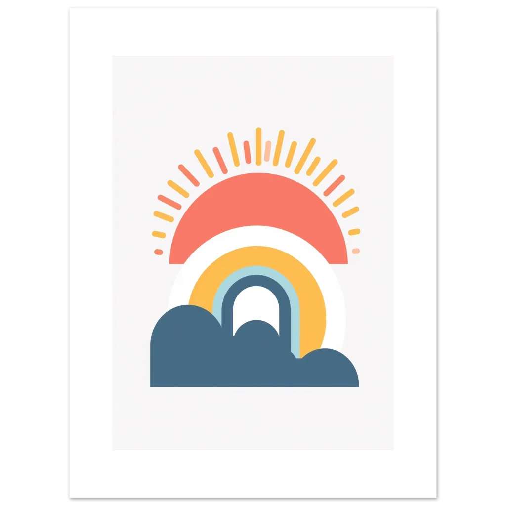Transform your walls with this charming and sustainable art piece. Select your preferred size and bring home the cheerful calm of our Minimalist Sunrise Rainbow & Clouds poster today!