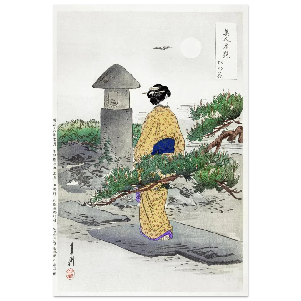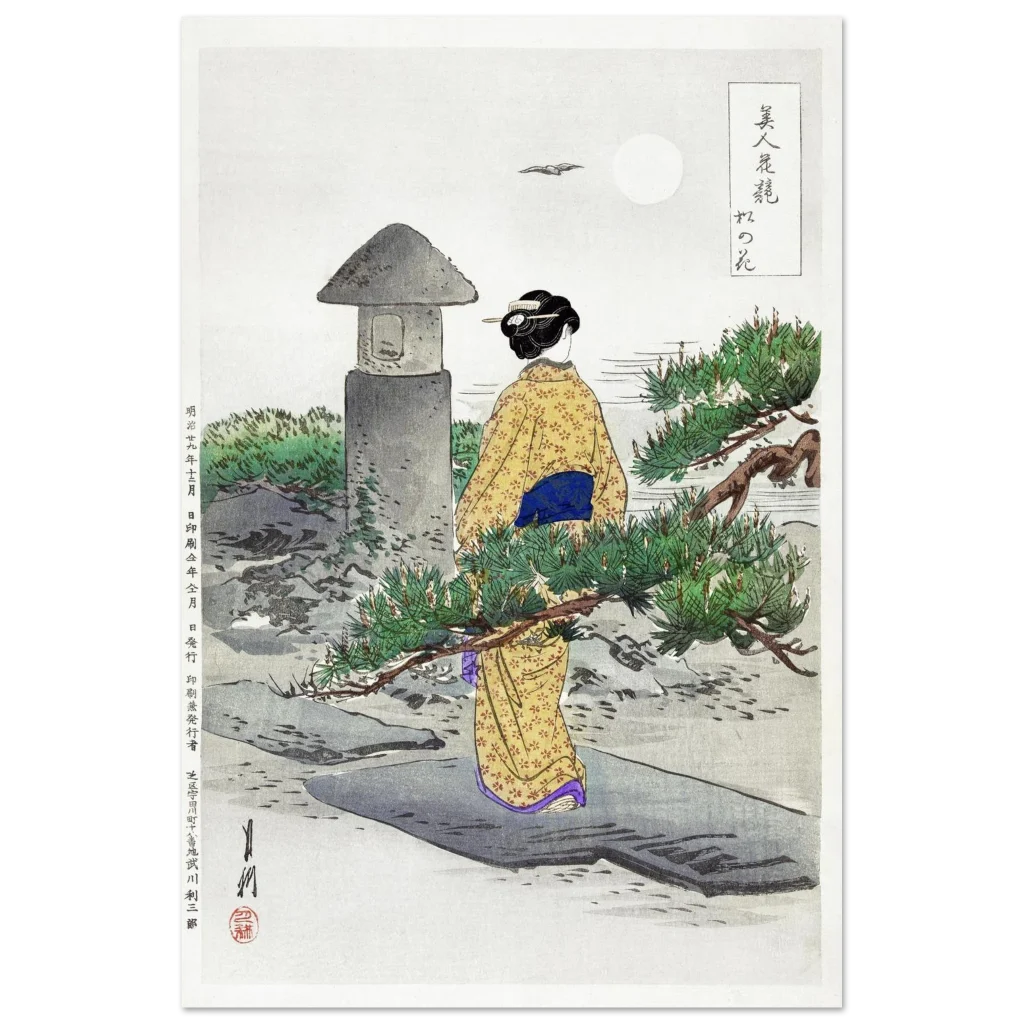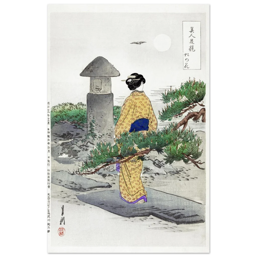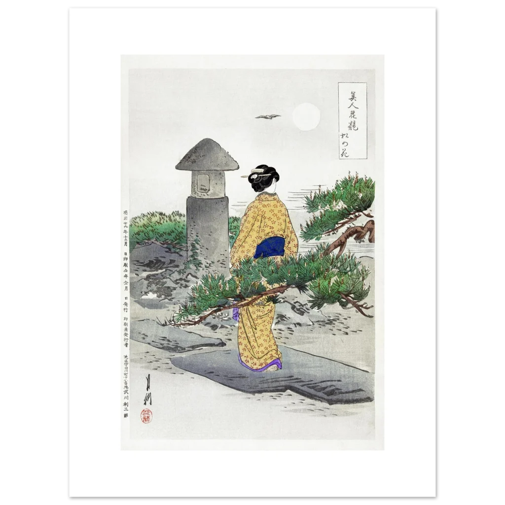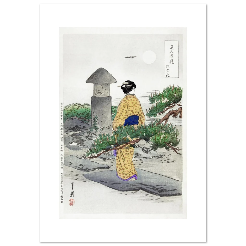 Immerse yourself in the tranquil beauty of a moonlit Japanese garden with our exclusive Ukiyo-e inspired premium matte poster. This exquisite print captures a moment of serene contemplation, perfect for adding a touch of timeless elegance and cultural depth to any room. The muted blues, earthy greens, and the warm glow of the traditional kimono bring a harmonious balance, inviting peaceful reflection into your home or office.
