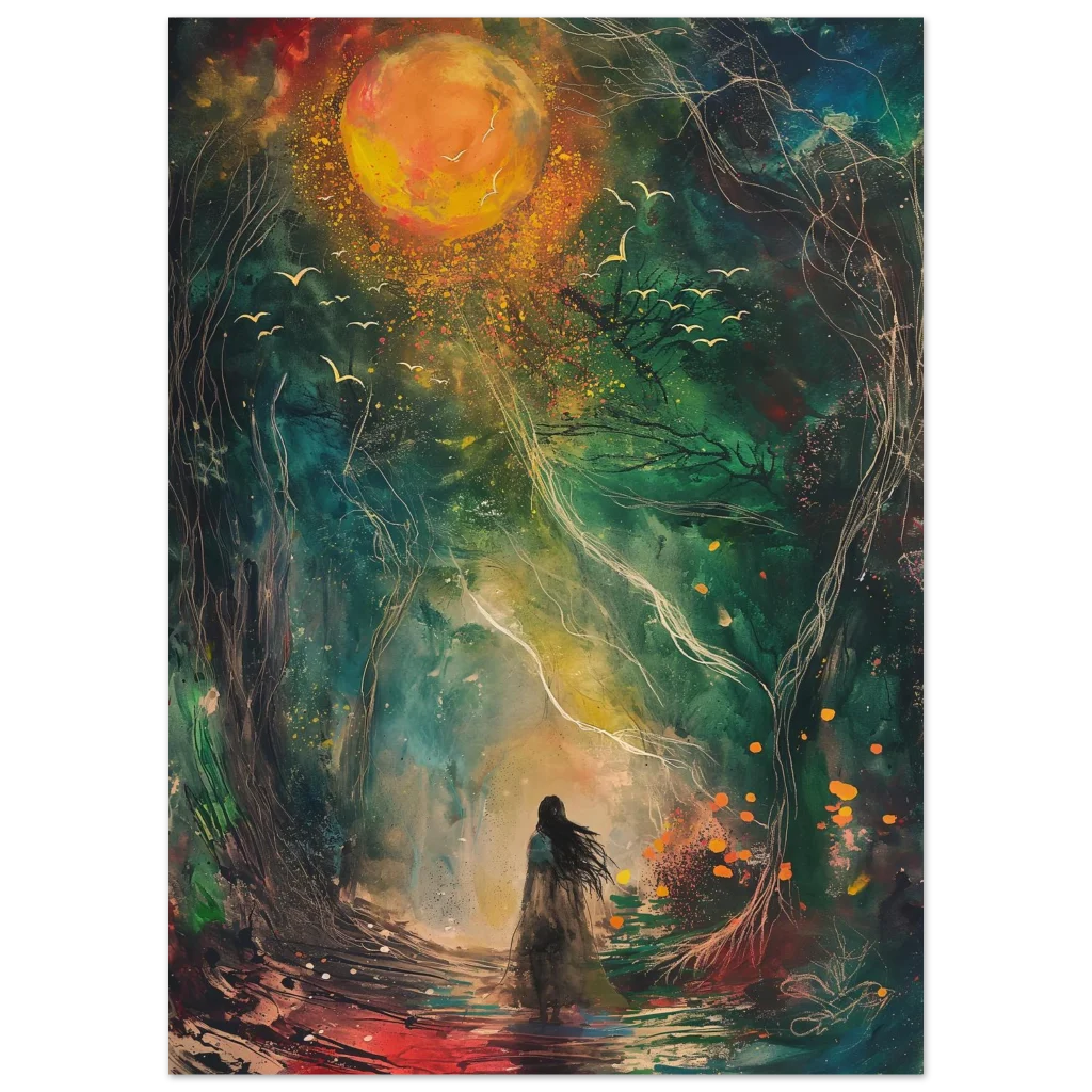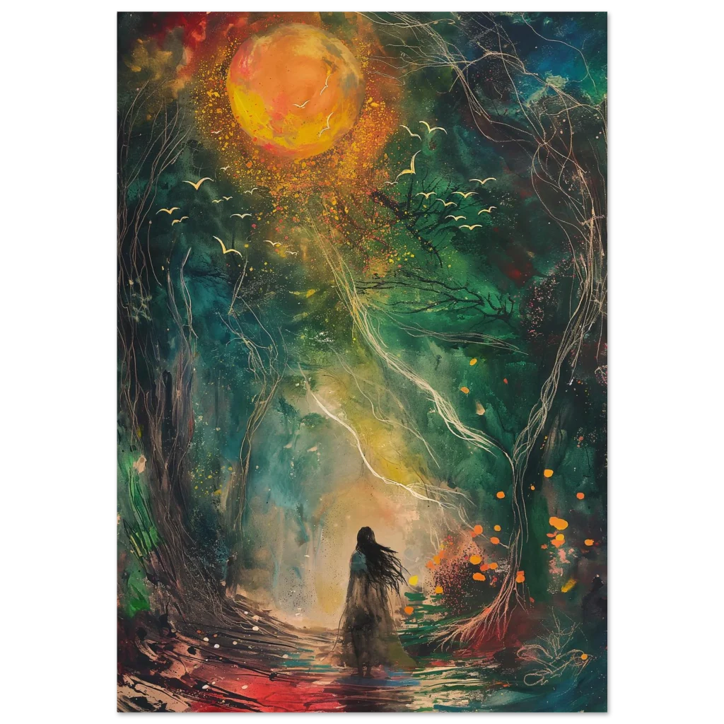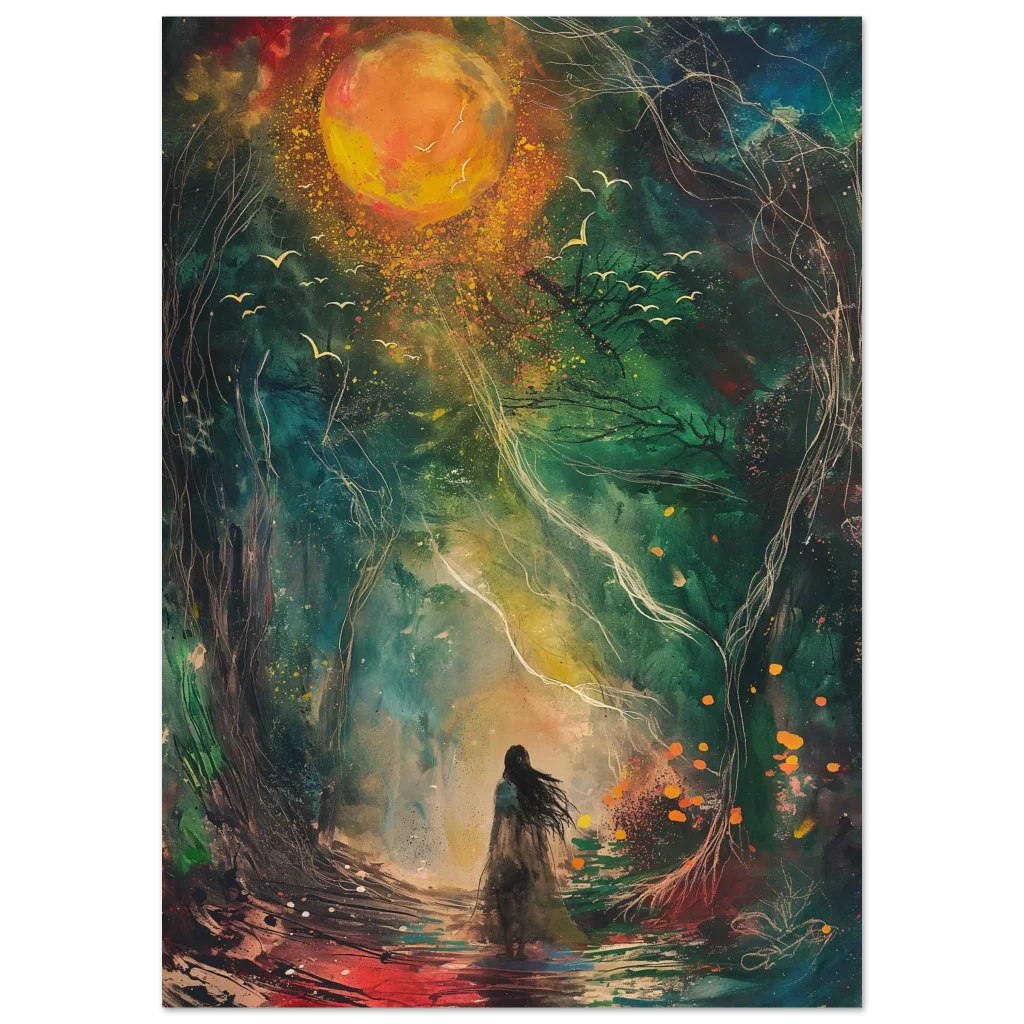Step into a realm of serene mystery with our ‘Mystic Forest Moonwalker’ premium matte paper poster. This captivating piece, rich in deep emeralds, teals, and fiery oranges, depicts a solitary figure wandering beneath a luminous, abstract moon, surrounded by the whispers of ancient trees and a scattering of ethereal birds. It’s more than just a print; it’s an invitation to bring the magic and tranquility of a moonlit forest into your home, sparking wonder and reflection with its vibrant, painterly style.