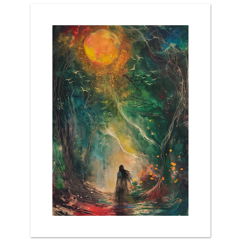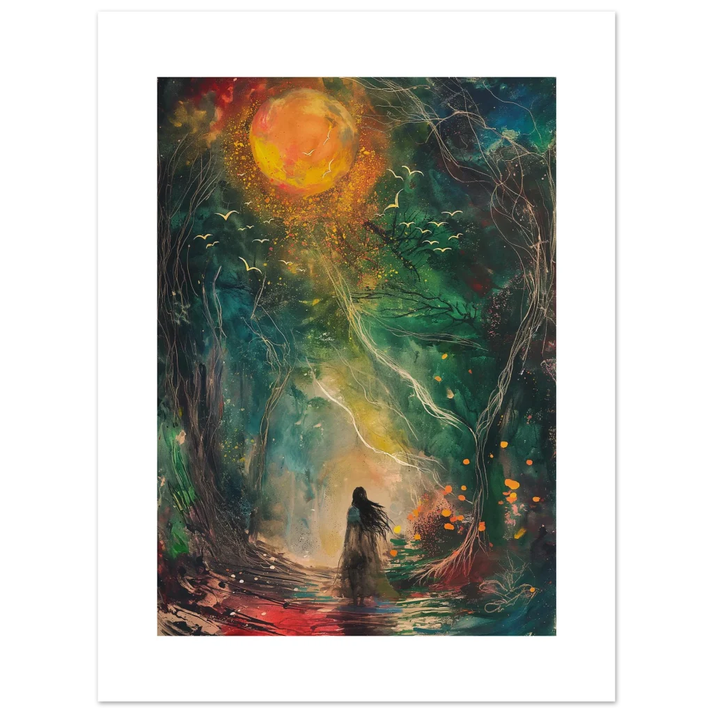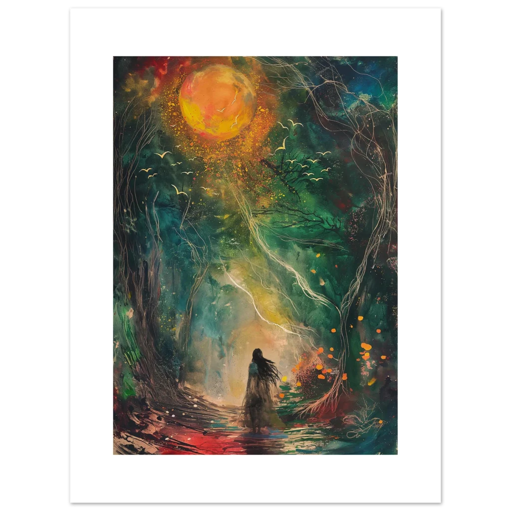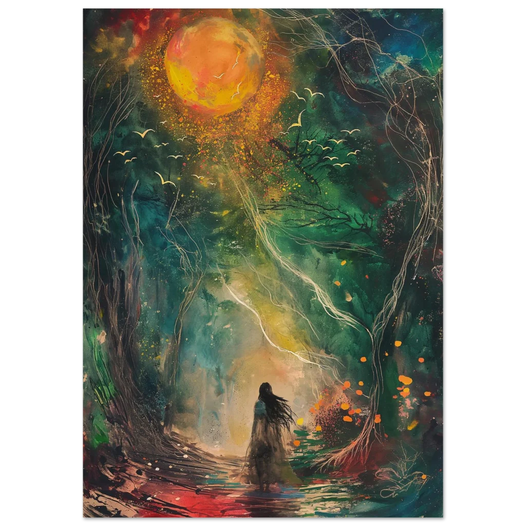 Step into a realm of serene mystery with our ‘Mystic Forest Moonwalker’ premium matte paper poster. This captivating piece, rich in deep emeralds, teals, and fiery oranges, depicts a solitary figure wandering beneath a luminous, abstract moon, surrounded by the whispers of ancient trees and a scattering of ethereal birds. It’s more than just a print; it’s an invitation to bring the magic and tranquility of a moonlit forest into your home, sparking wonder and reflection with its vibrant, painterly style.