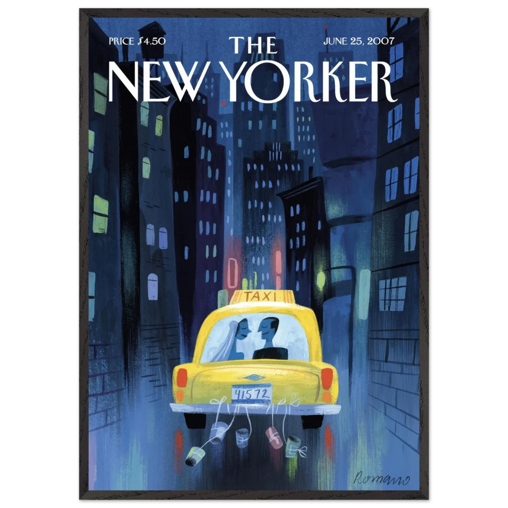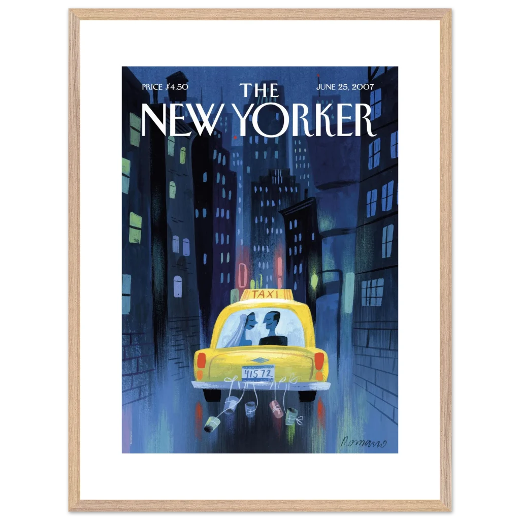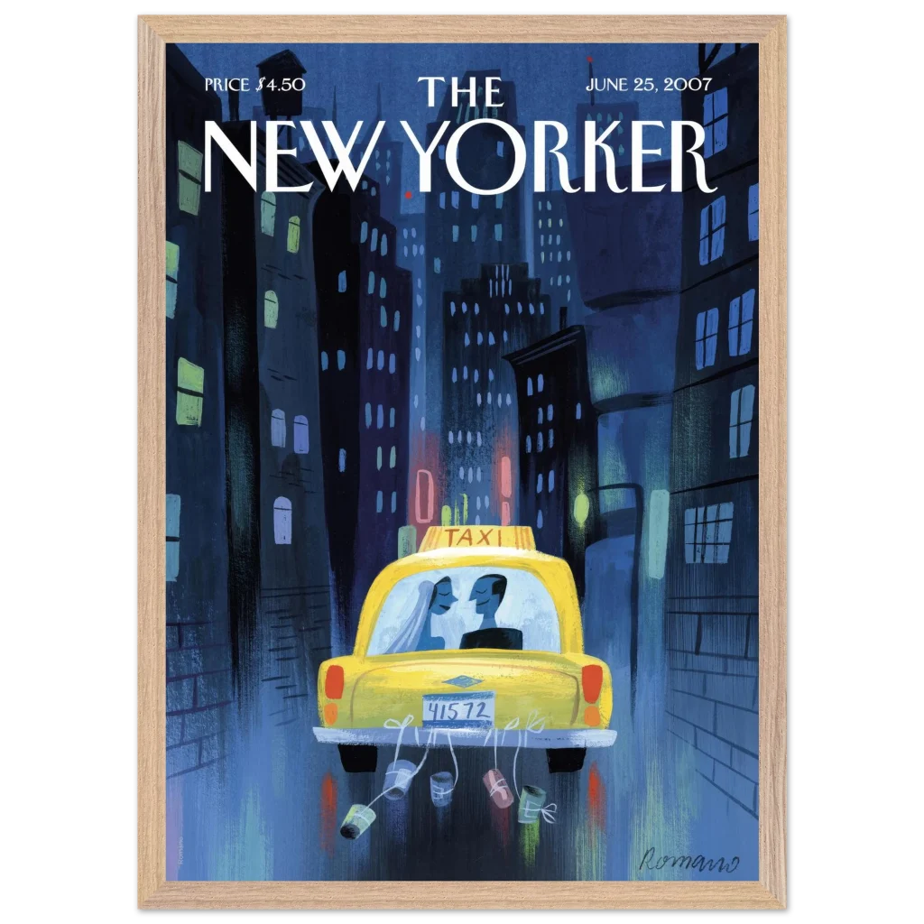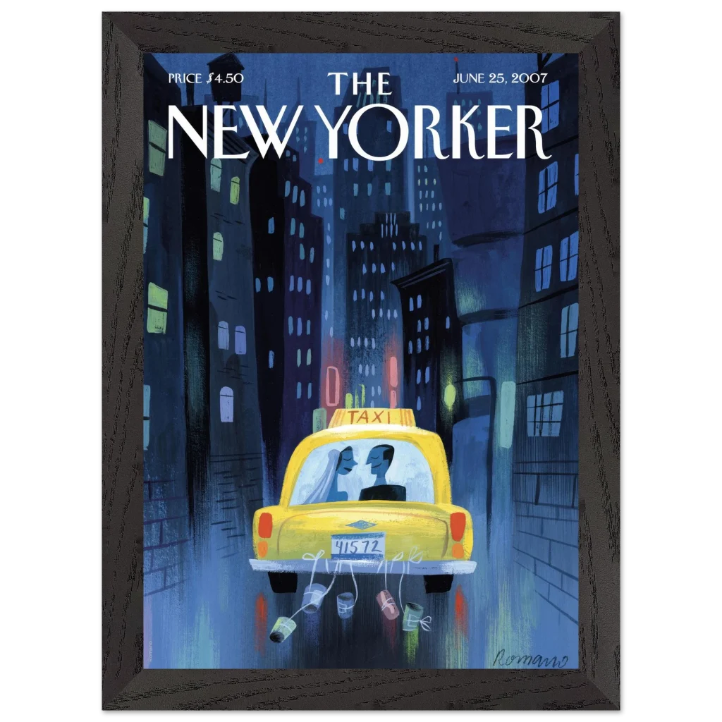 Capture the timeless romance of a New York City wedding night with this evocative art print. “Just Married in NYC” beautifully illustrates a newlywed couple in a classic yellow taxi, amidst the soft glow of city lights, making it a perfect piece for romantics, urban art lovers, or anyone who cherishes special moments. This premium framed poster brings a sophisticated yet heartfelt touch to any living space or bedroom.