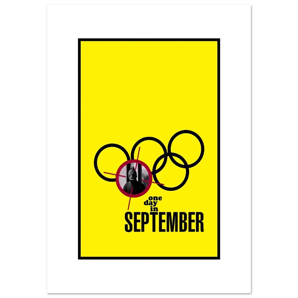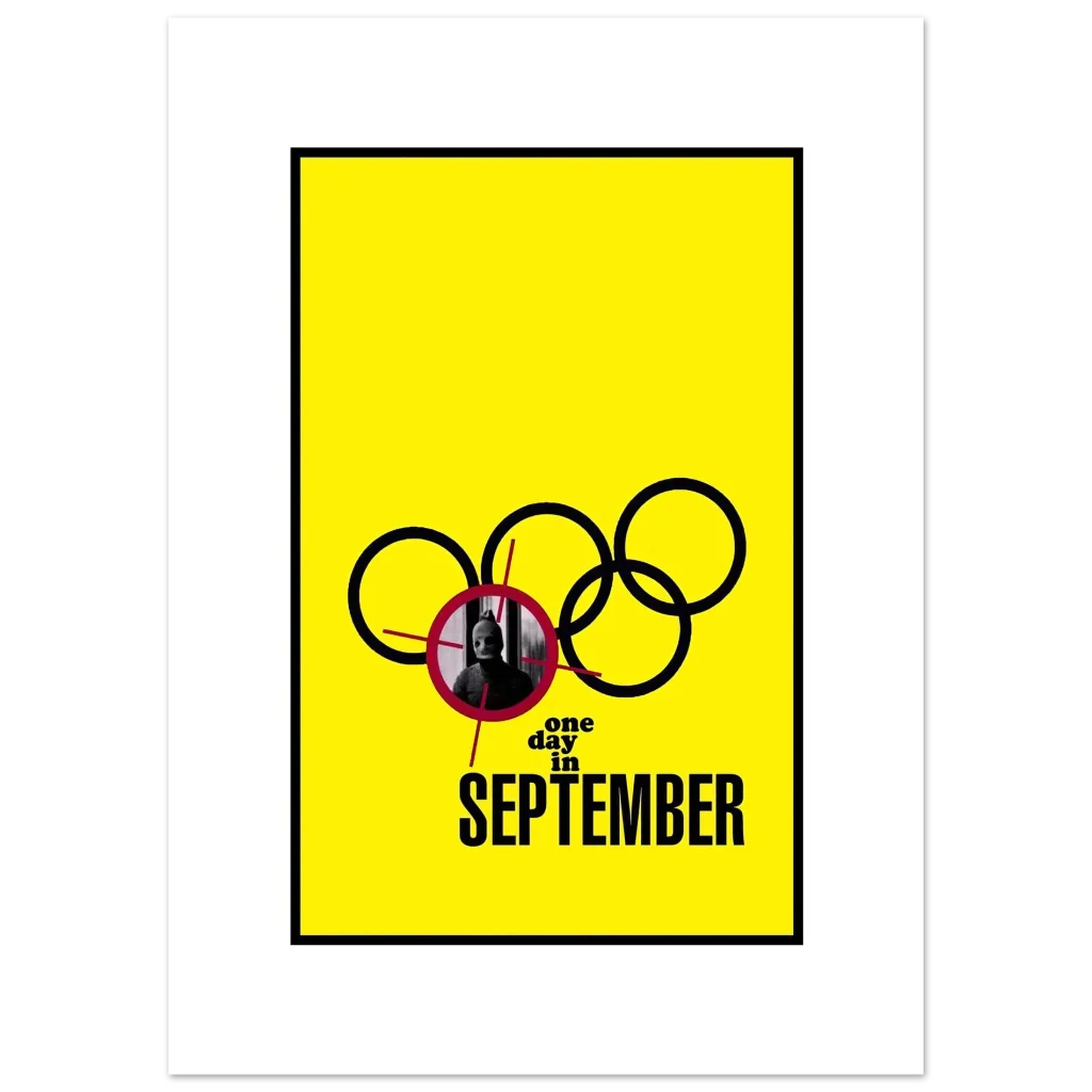 Capture the intense historical narrative of “One Day in September” with this striking movie poster, featuring a bold yellow background that commands attention. This piece isn’t just a poster; it’s a conversation starter, perfect for film buffs and history enthusiasts who appreciate a minimalist yet impactful design.