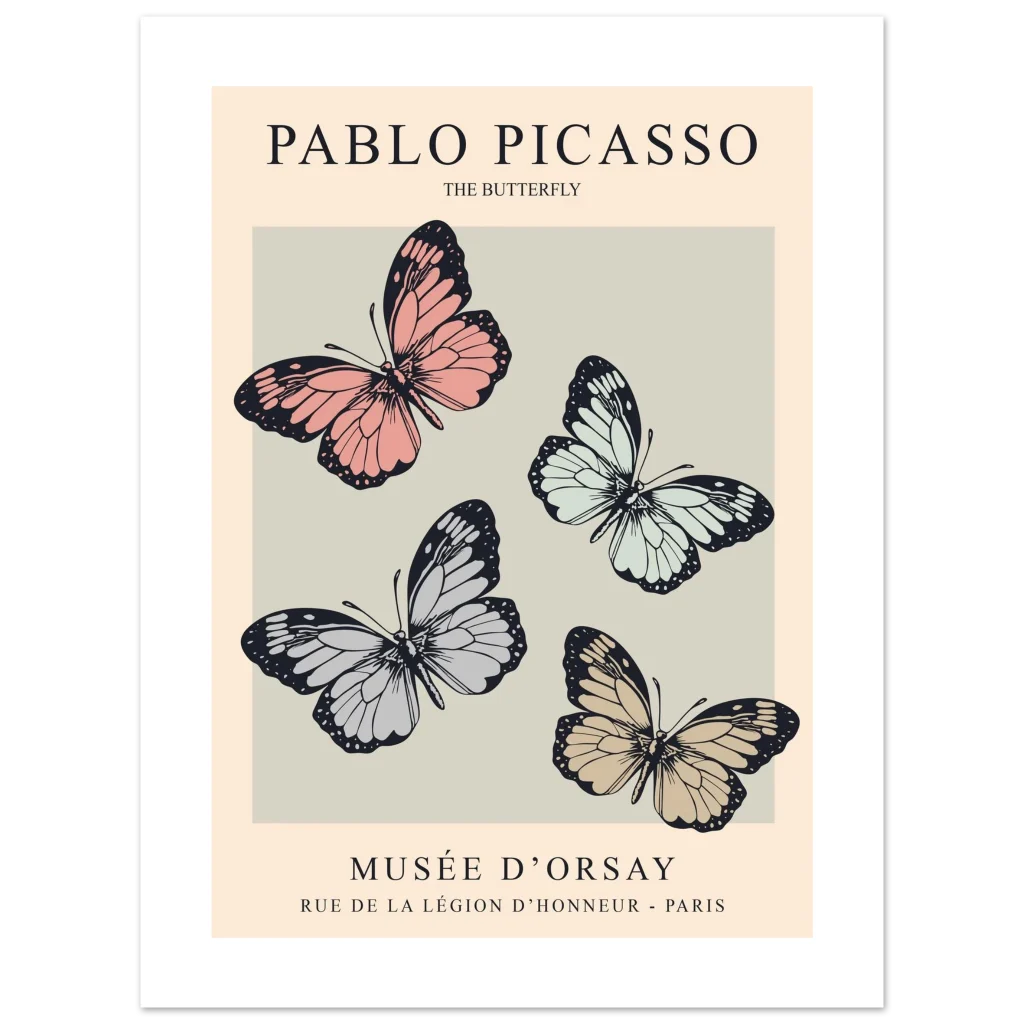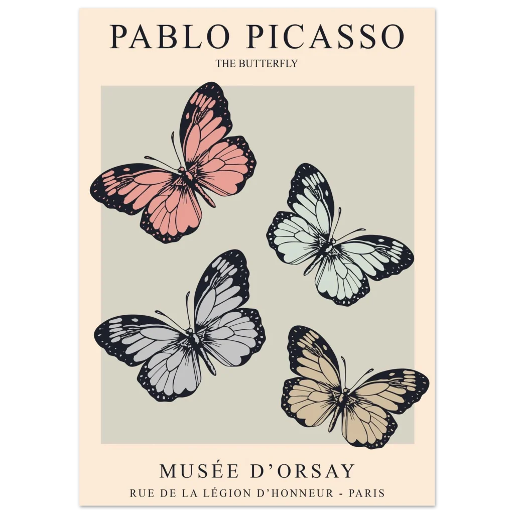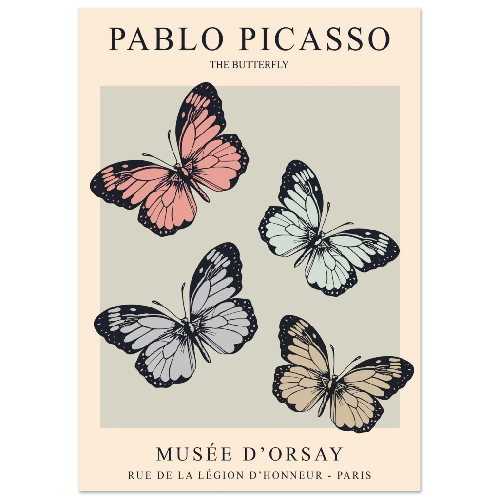 Explore the elegant “The Butterfly” exhibition poster by Pablo Picasso for the Musée d’Orsay. This minimalist design features four stylized butterflies in muted pink, cream, and grey tones, reflecting classic Parisian art gallery aesthetics.
