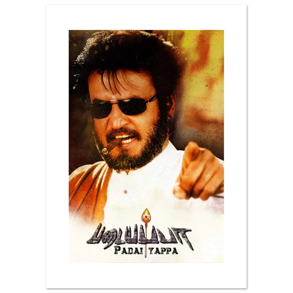Bring the electrifying charisma of Rajinikanth’s iconic role in Padayappa into your space with this vibrant movie poster. Capturing the legend’s powerful presence and the film’s classic appeal, this poster is a must-have for fans and cinema enthusiasts alike. Experience art that feels silky to the touch with our high-quality, lighter-weight, classic semi-glossy paper, designed to make the rich colors and dynamic imagery pop.