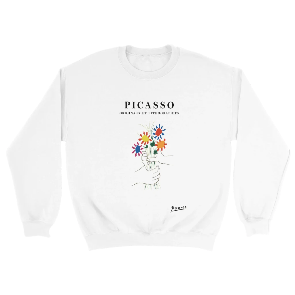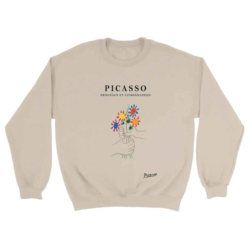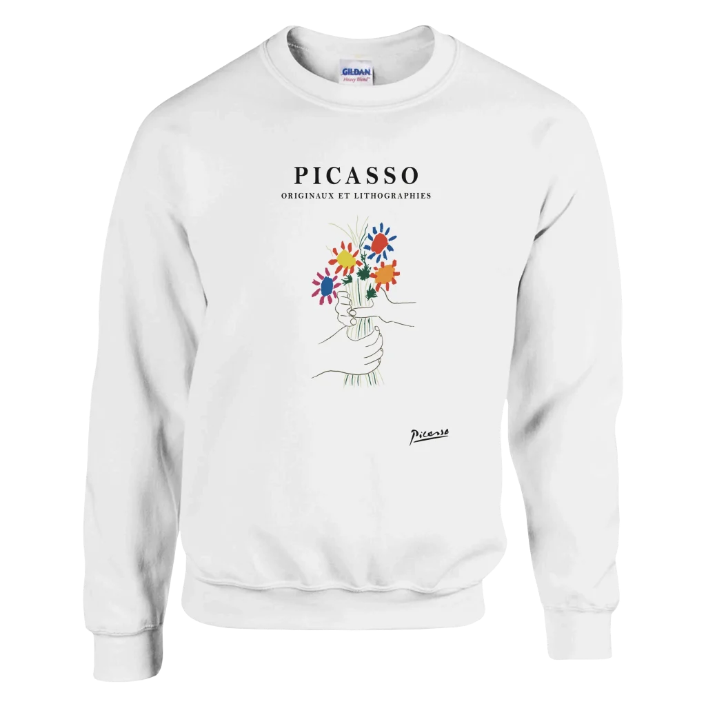 Embrace the spirit of artistic genius with our Classic Unisex Crewneck Sweatshirt, featuring a charming, Picasso-inspired floral design. This iconic graphic, reminiscent of the master’s joyful and expressive line art, captures a moment of gentle beauty with hands holding a vibrant bouquet. It’s more than just a sweatshirt; it’s a wearable piece of art that brings a touch of color and sophistication to your daily wardrobe.