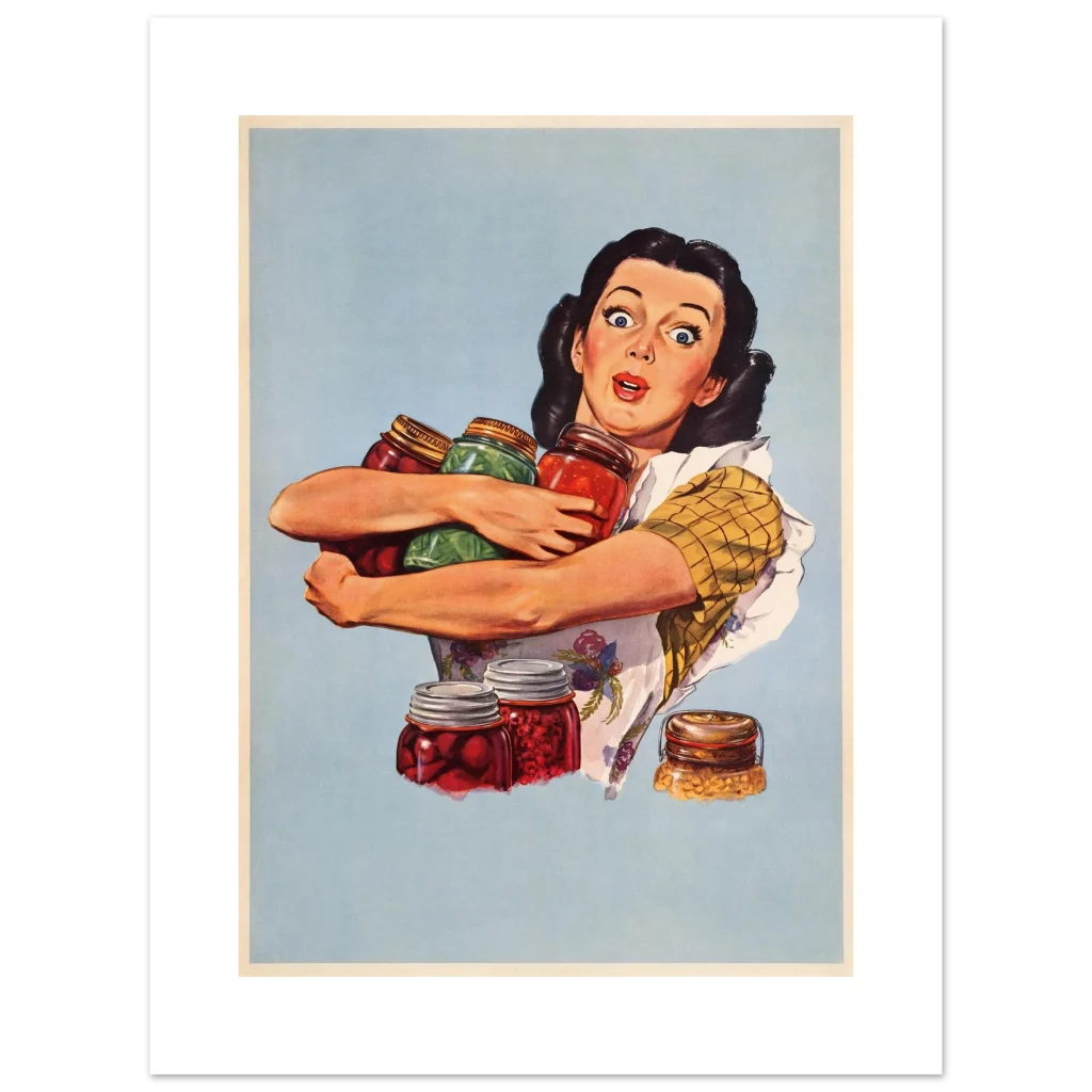 Bring a touch of nostalgic charm and vibrant energy to your space with our Retro Canning Queen Poster. This captivating artwork, inspired by classic mid-century illustrations, features a delightfully surprised homemaker brimming with her bountiful harvest of canned goods. The rich, warm colors of the preserves pop against her cheerful expression, creating a scene that’s both endearing and full of vintage character. It’s perfect for adding a playful, retro vibe to your kitchen, dining room, or any space that could use a splash of color and personality.