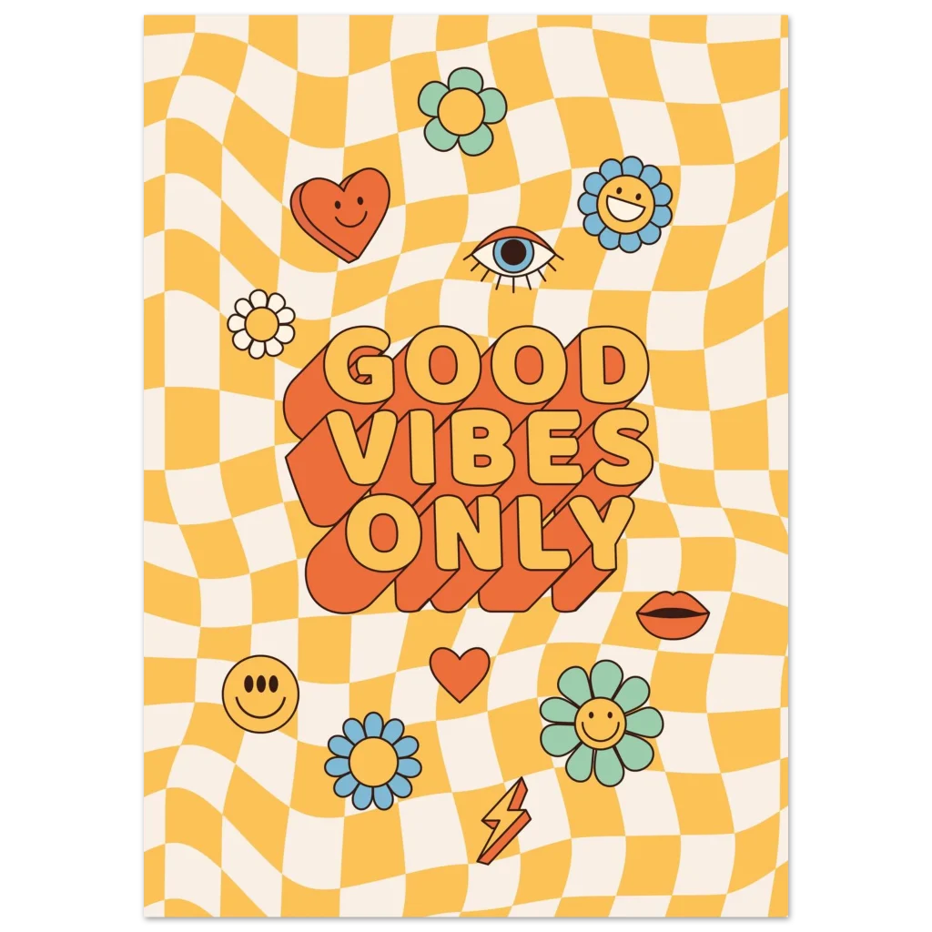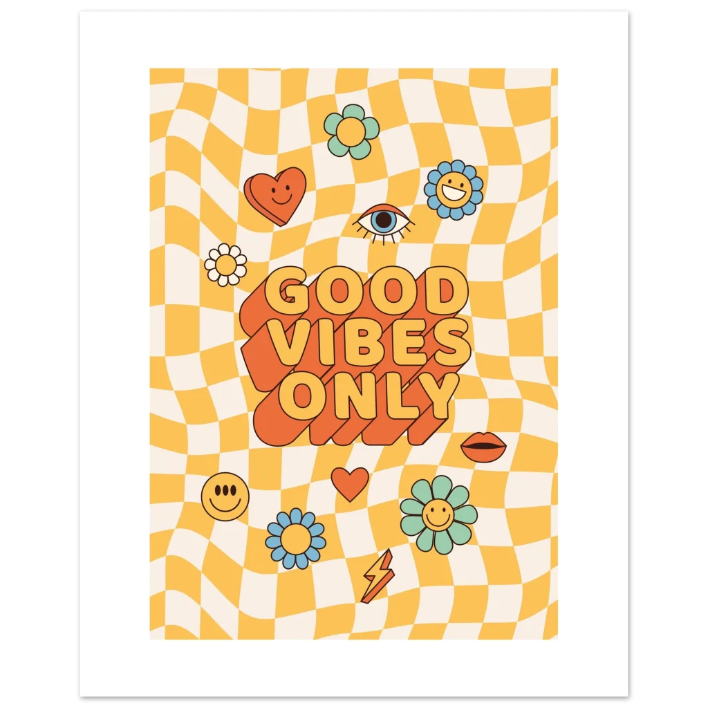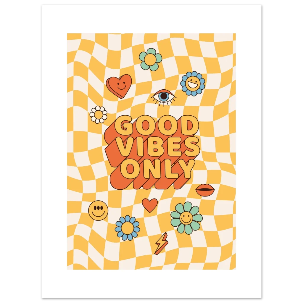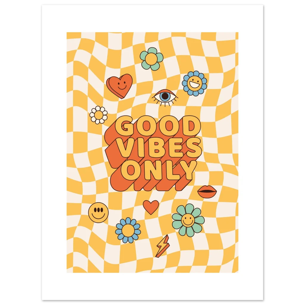 Infuse your space with a shot of pure joy and nostalgic charm! Our ‘Good Vibes Only’ poster brings that irresistible retro energy to life with a playful wavy checkerboard background, vibrant pastel flowers, and bold, feel-good typography. It’s more than just a poster; it’s a daily dose of sunshine designed to uplift your mood and brighten any room, perfect for anyone who loves a touch of playful vintage style.