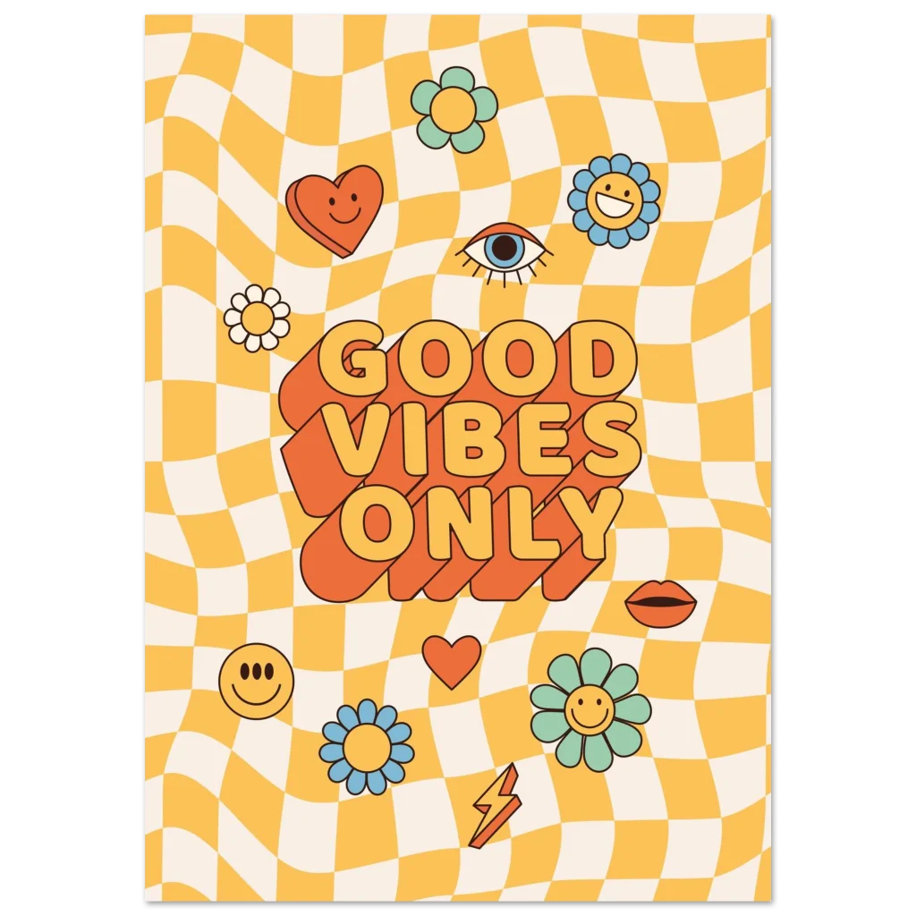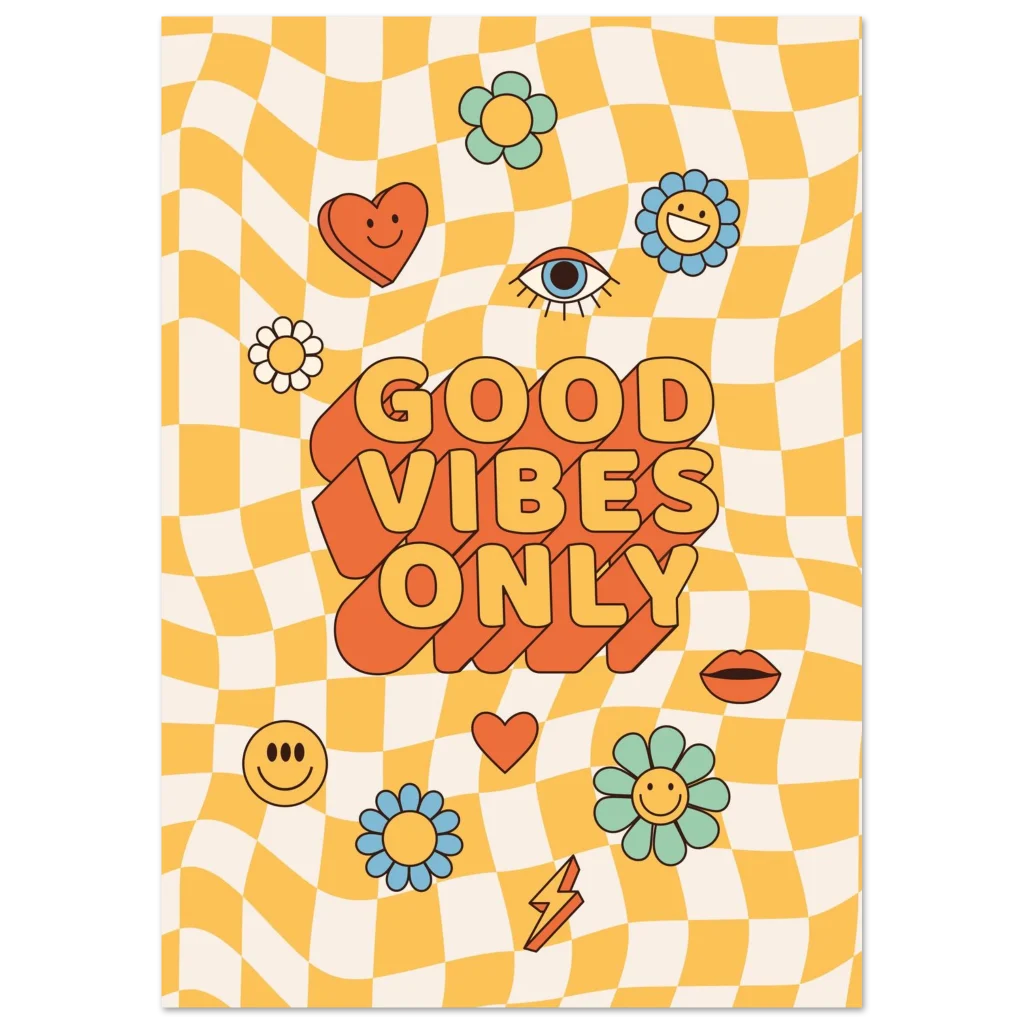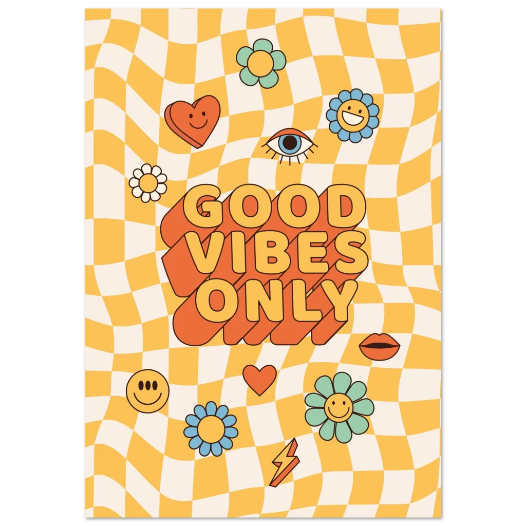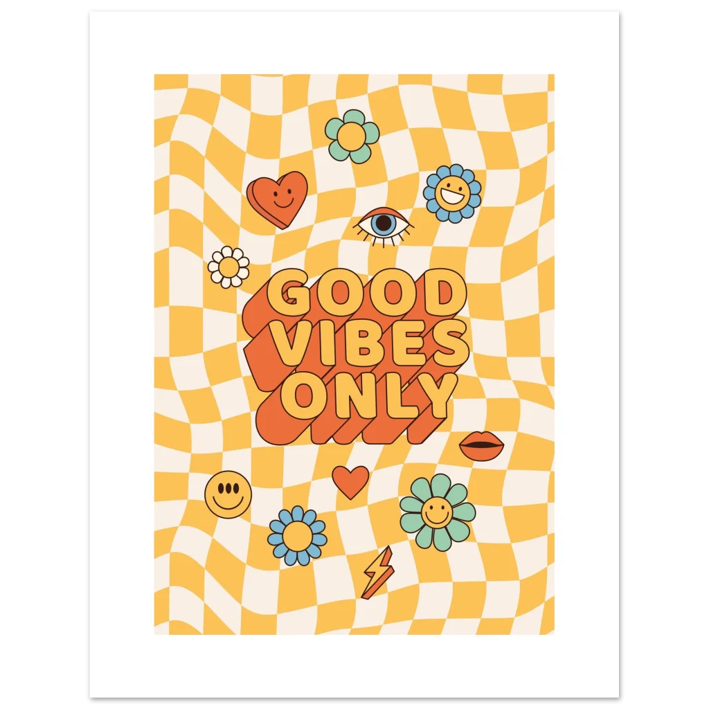 Infuse your space with a shot of pure joy and nostalgic charm! Our ‘Good Vibes Only’ poster brings that irresistible retro energy to life with a playful wavy checkerboard background, vibrant pastel flowers, and bold, feel-good typography. It’s more than just a poster; it’s a daily dose of sunshine designed to uplift your mood and brighten any room, perfect for anyone who loves a touch of playful vintage style.