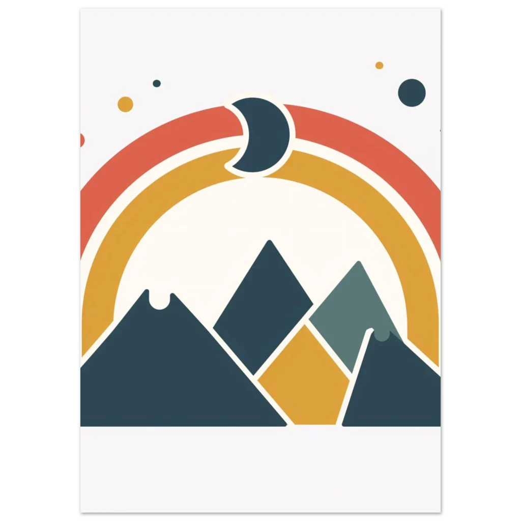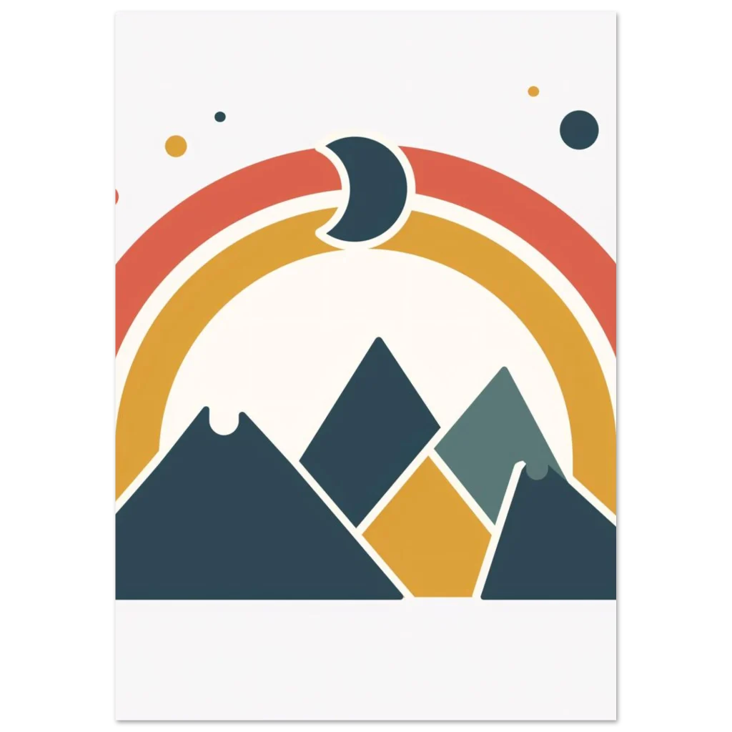 Capture the serene yet adventurous spirit of the outdoors with our Retro Mountains & Rainbow poster. This captivating design, featuring a harmonious blend of rust, mustard, and deep teal hues, brings a touch of modern bohemian charm and cosmic wonder to any space. Imagine the calm and inspiration it will infuse into your living room, office, or bedroom, inviting dreams of starlit mountain escapades.