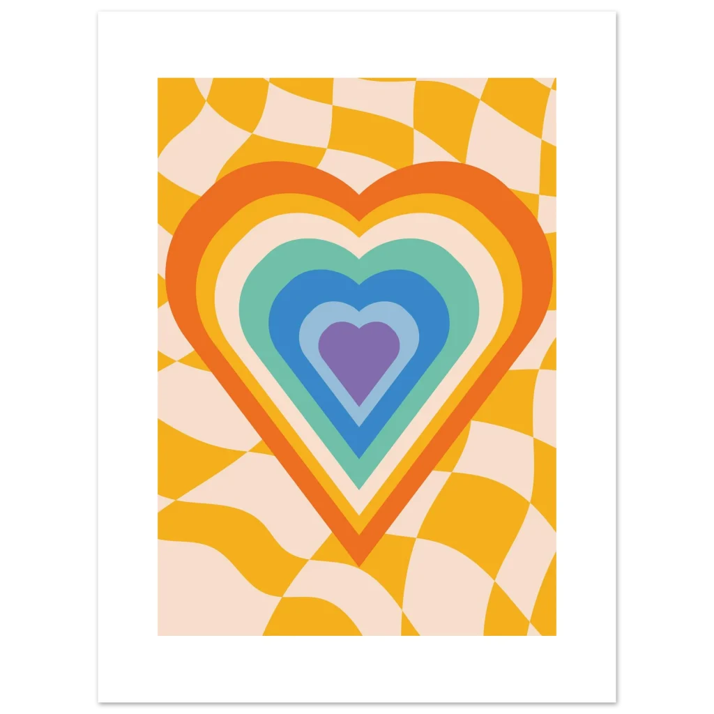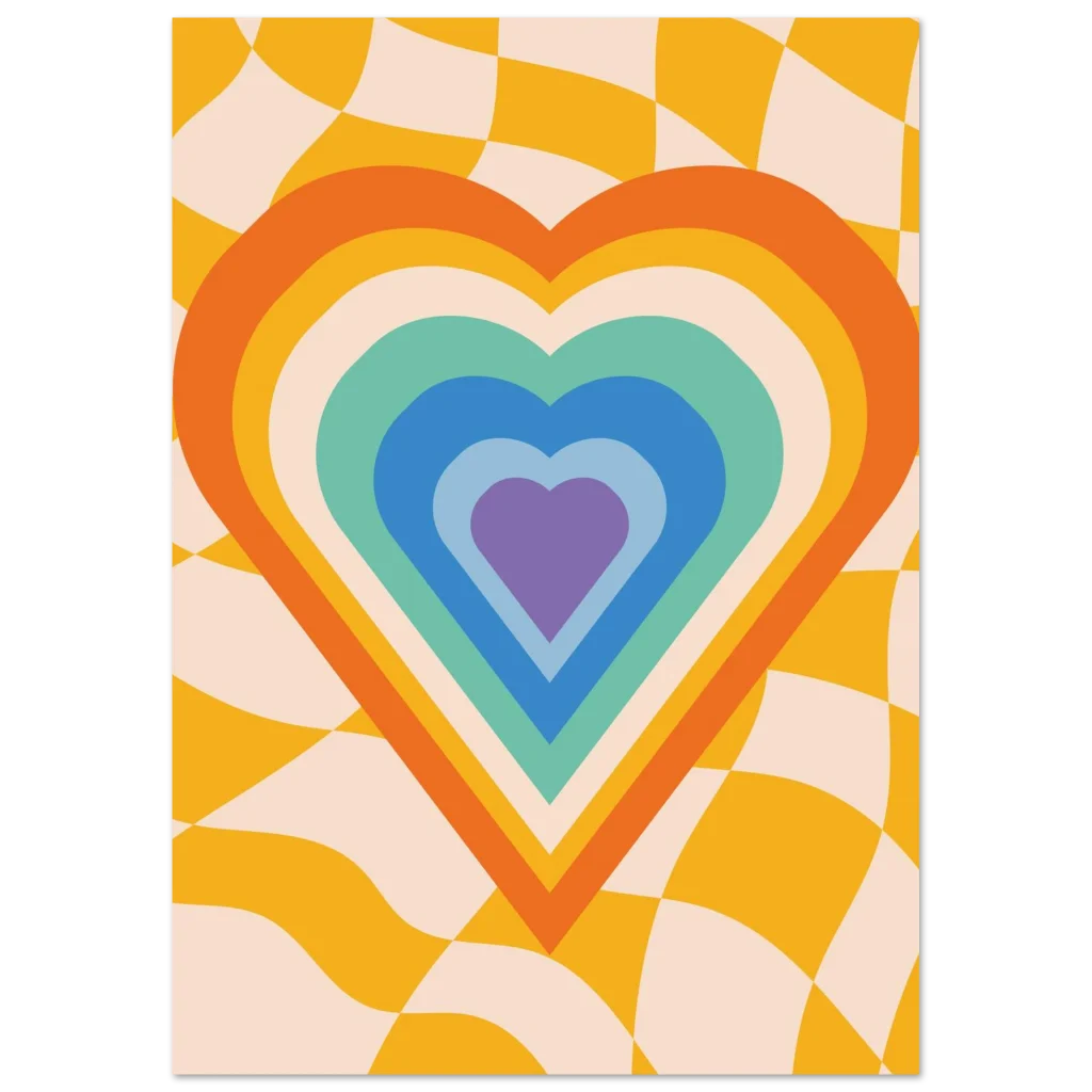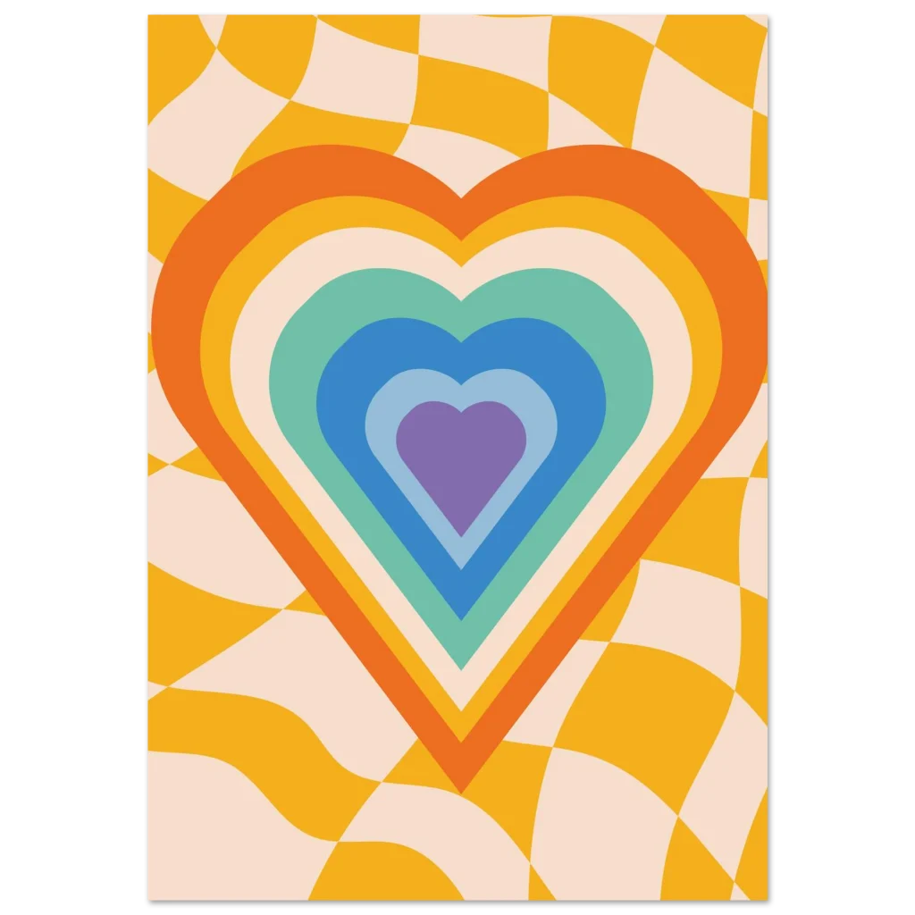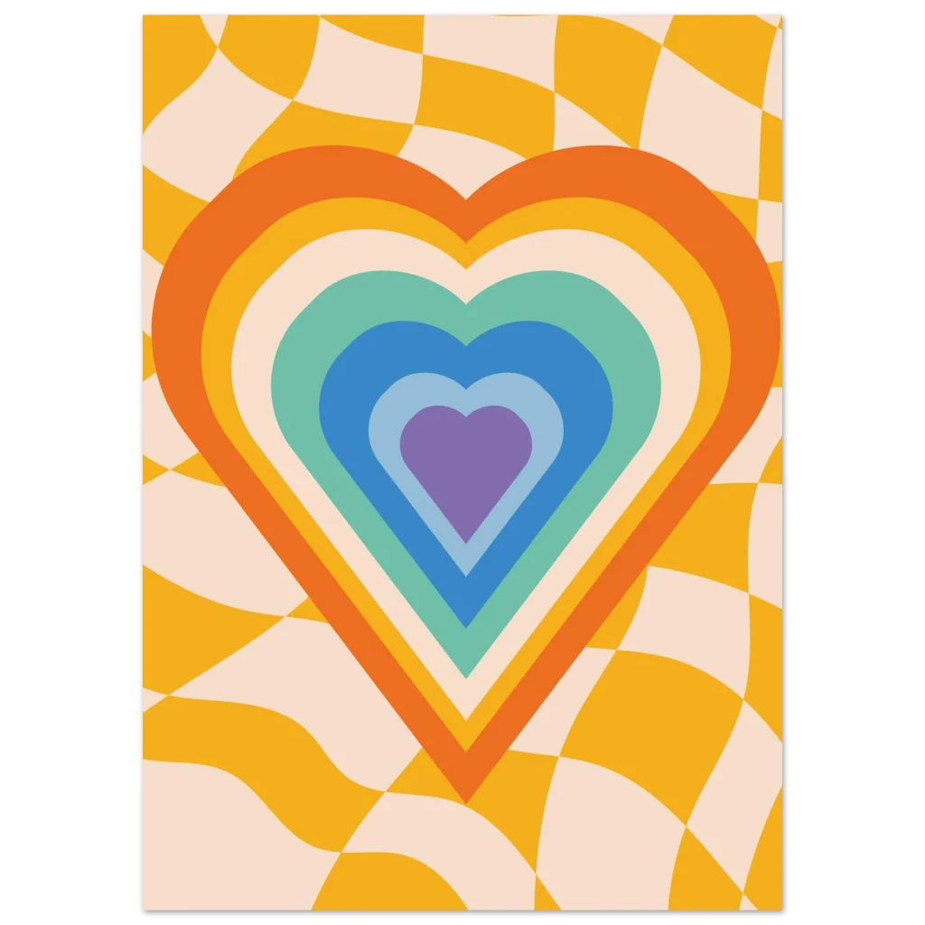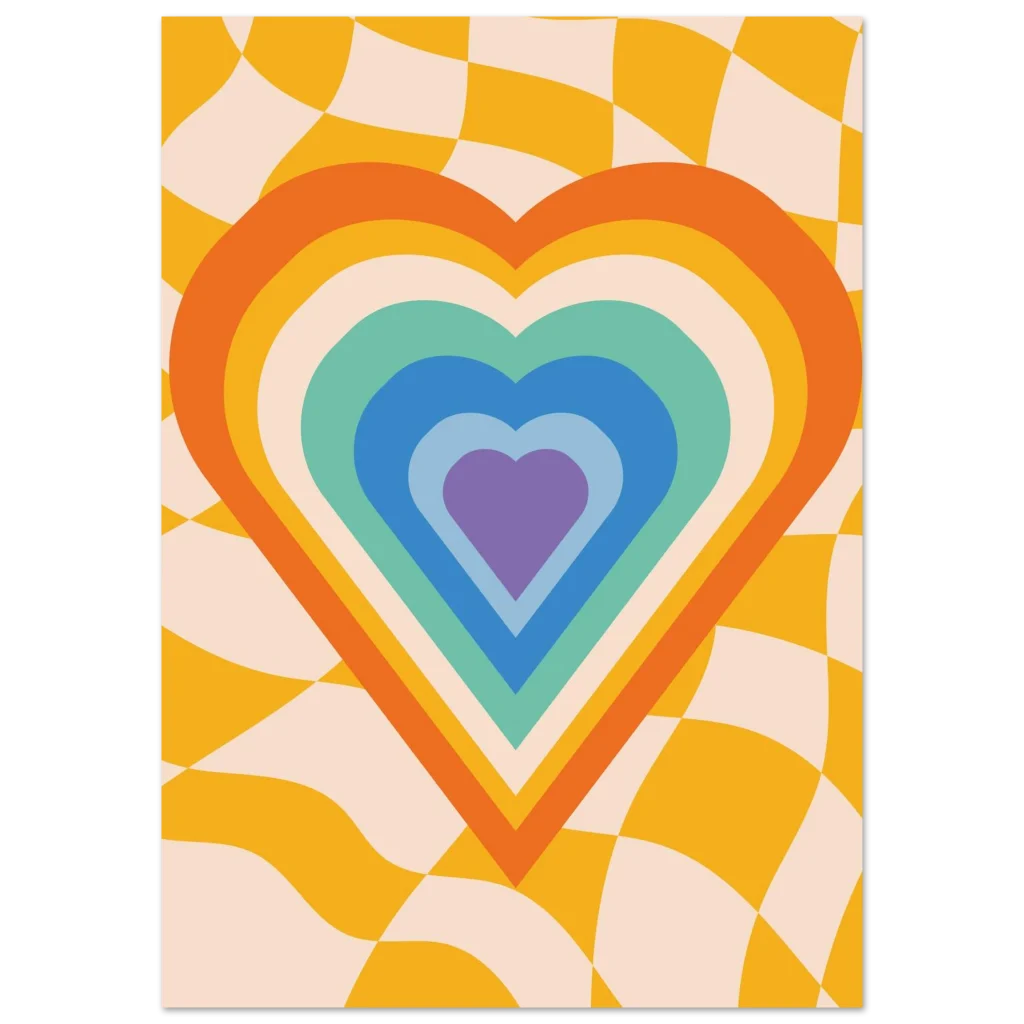 Infuse your space with a dose of nostalgic joy with our Retro Rainbow Heart Bliss poster. This vibrant design captures the free-spirited energy of the 70s, featuring a mesmerizing concentric heart in a playful palette of oranges, yellows, teals, blues, and purples, all set against a groovy, undulating checkerboard background. It’s more than just a poster; it’s a statement piece that radiates warmth, love, and undeniable retro charm, perfect for adding a pop of personality to any room.