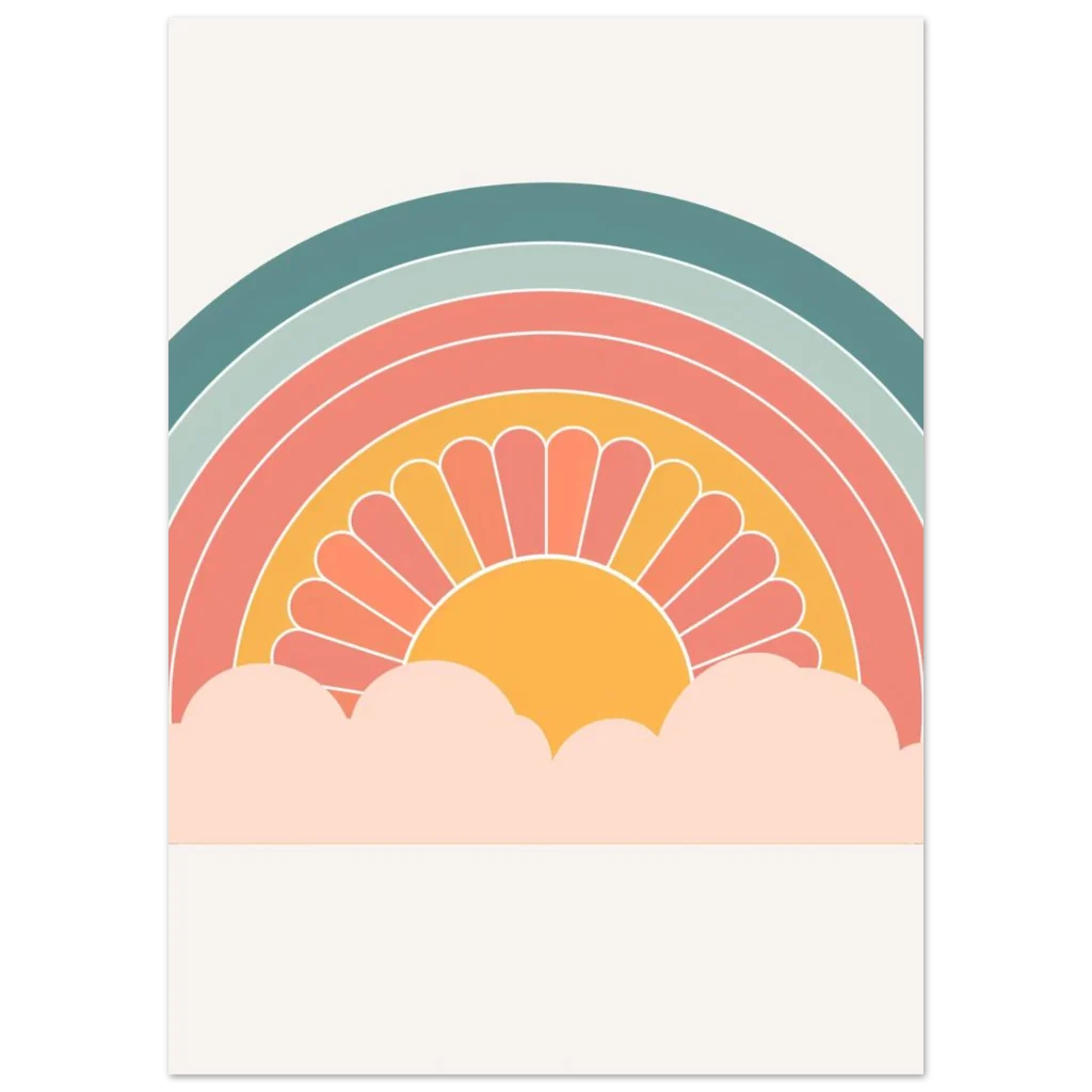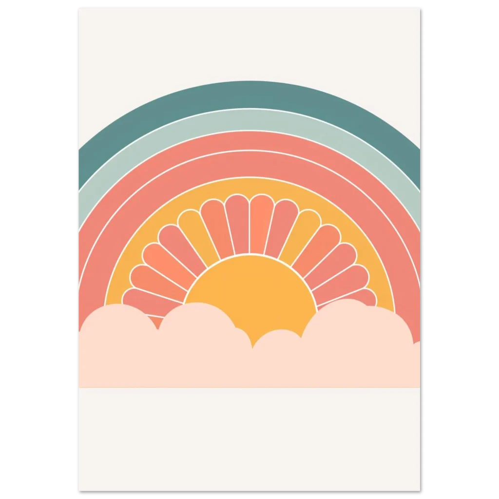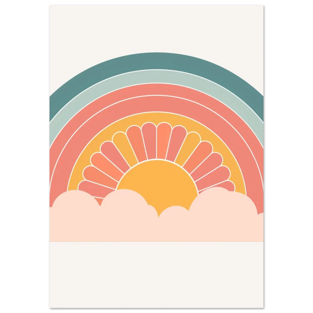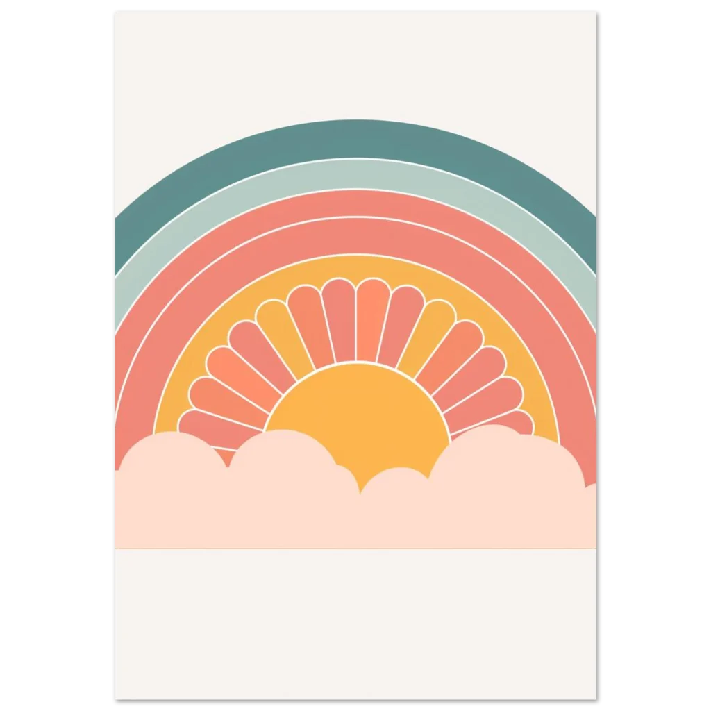 Bring a touch of whimsical warmth and retro charm into your space with our ‘Retro Sunset Rainbow’ poster. Featuring a delightful palette of teal, sage, coral, and a sunny mustard, this design evokes a sense of nostalgic joy and peaceful vibes, perfect for brightening any room. The stylized sun peeking from soft clouds creates an inviting focal point that’s both playful and chic.