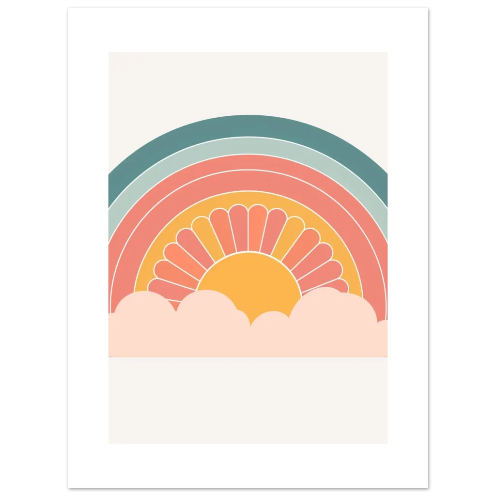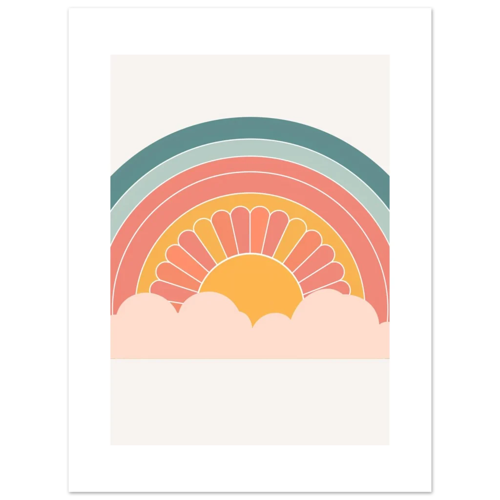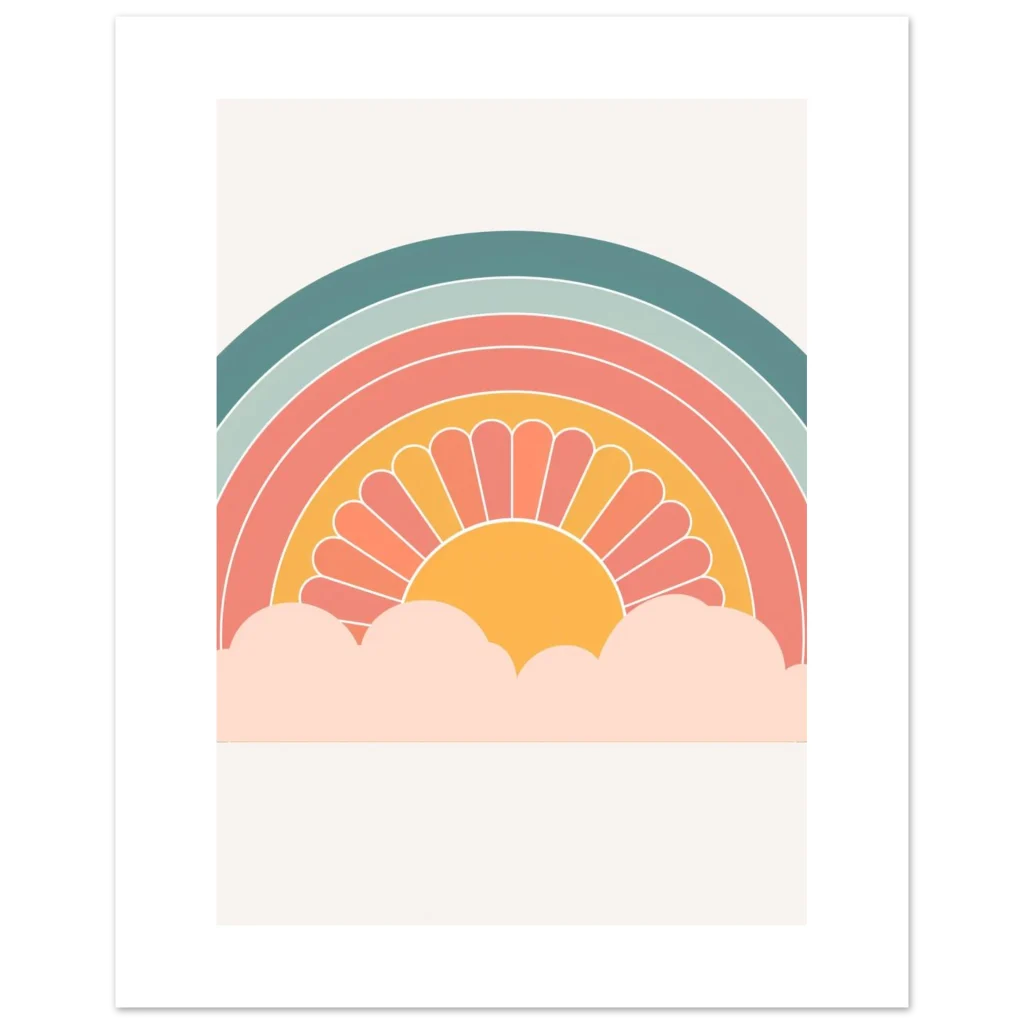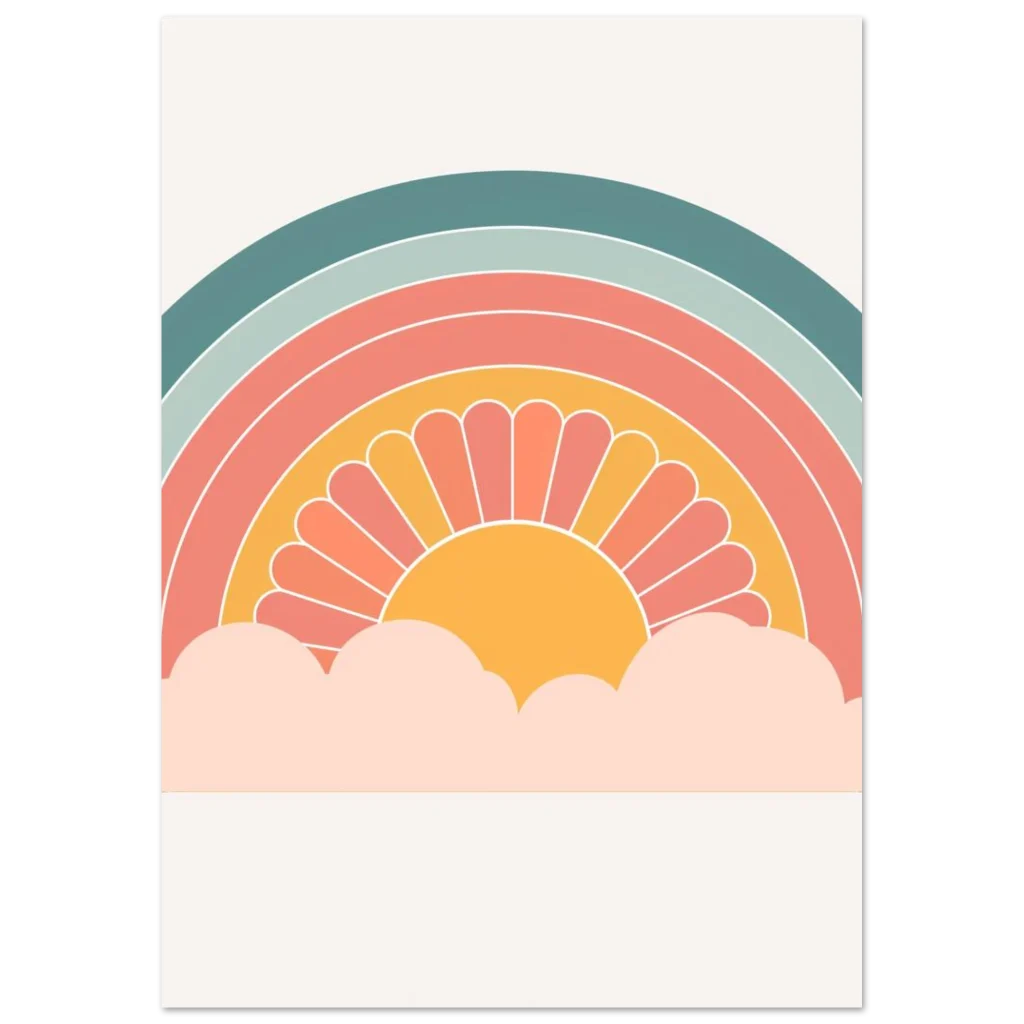 Bring a touch of whimsical warmth and retro charm into your space with our ‘Retro Sunset Rainbow’ poster. Featuring a delightful palette of teal, sage, coral, and a sunny mustard, this design evokes a sense of nostalgic joy and peaceful vibes, perfect for brightening any room. The stylized sun peeking from soft clouds creates an inviting focal point that’s both playful and chic.