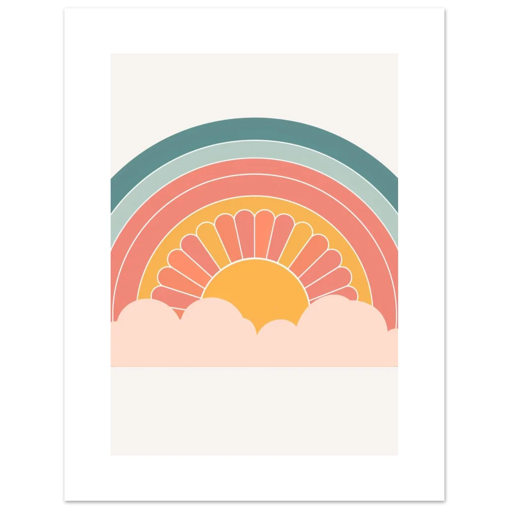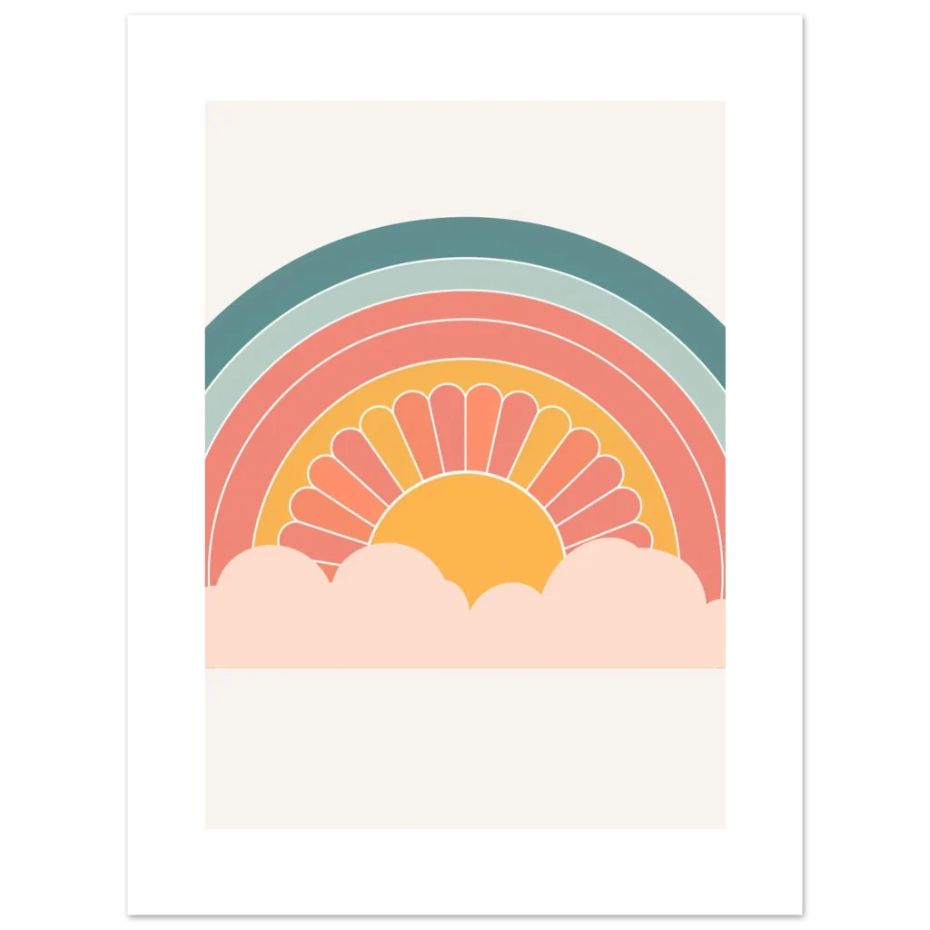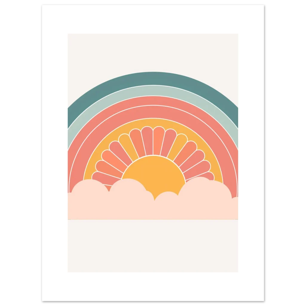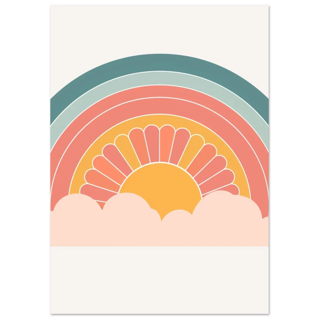 Bring a touch of whimsical warmth and retro charm into your space with our ‘Retro Sunset Rainbow’ poster. Featuring a delightful palette of teal, sage, coral, and a sunny mustard, this design evokes a sense of nostalgic joy and peaceful vibes, perfect for brightening any room. The stylized sun peeking from soft clouds creates an inviting focal point that’s both playful and chic.