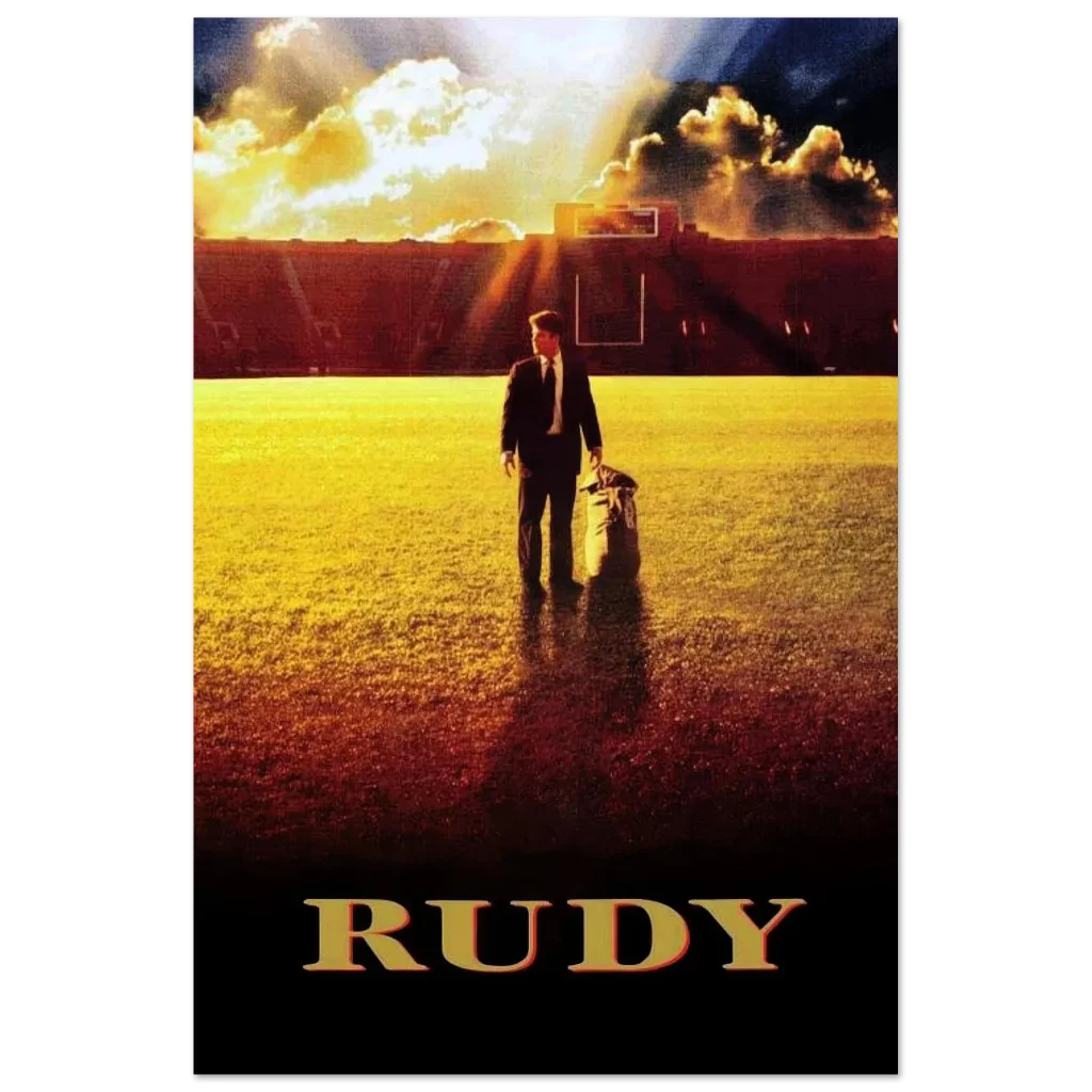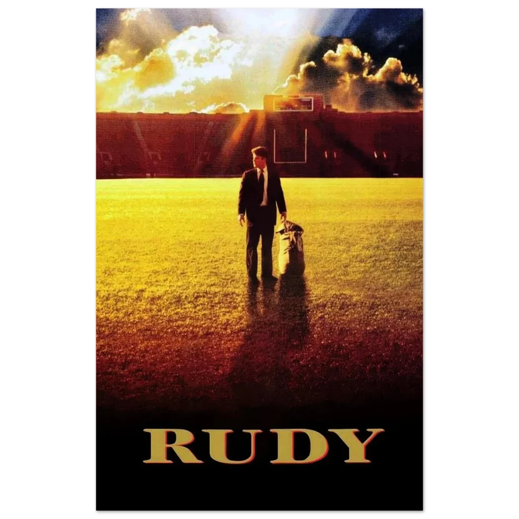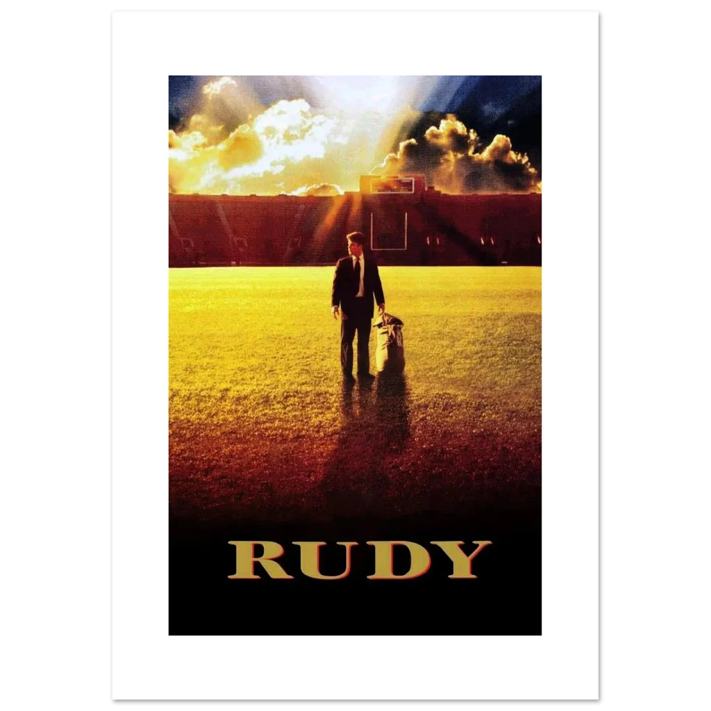 Capture the essence of determination and triumph with this Rudy movie poster, featuring an iconic scene bathed in the golden glow of a sunset stadium. The vibrant yellow-orange hues of the field and sky evoke a powerful sense of hope and passion, making it a perfect piece for anyone inspired by underdog stories and classic sports dramas. Bring this timeless inspiration into your home, office, or personal space and let it remind you that dreams are worth fighting for.