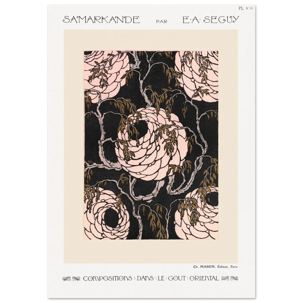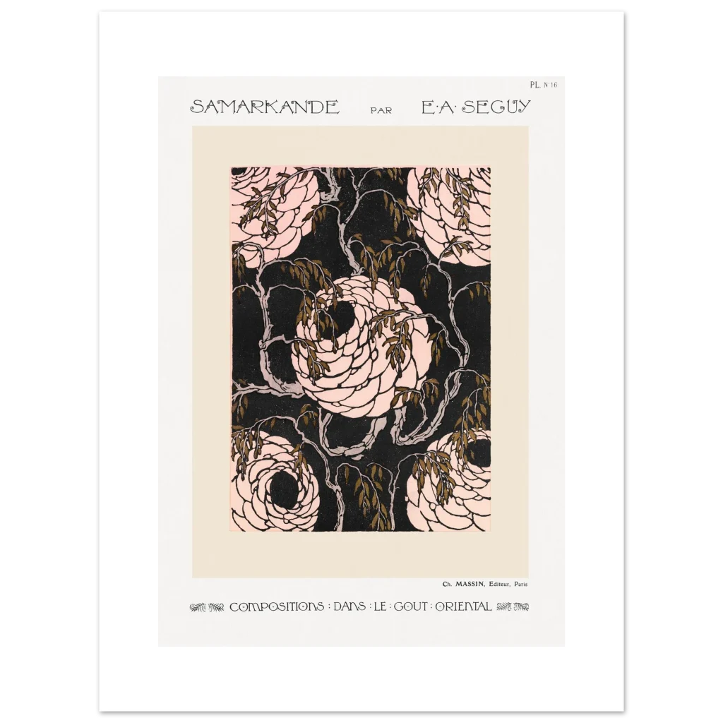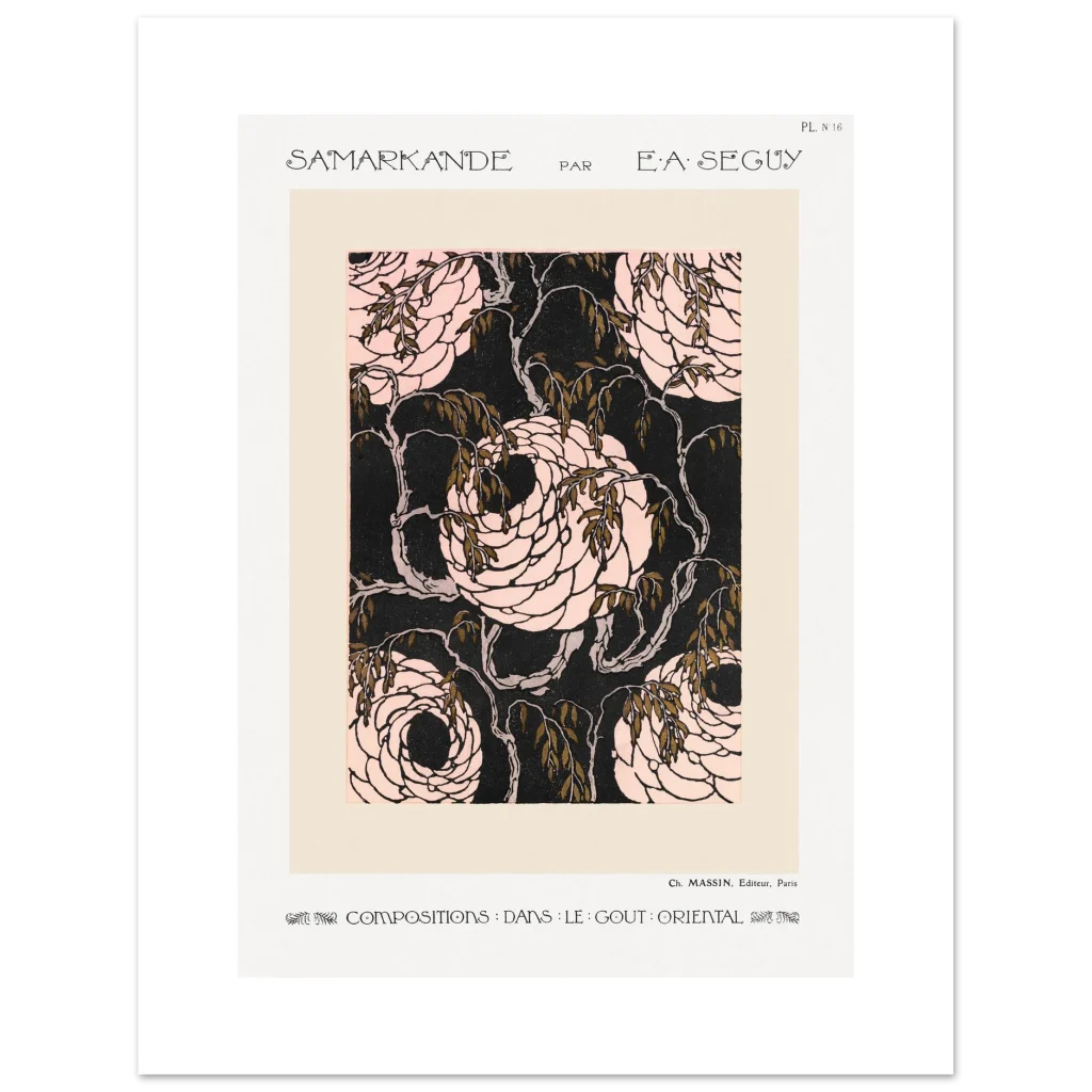 Immerse yourself in the enchanting world of Art Nouveau with our “Samarkande” floral poster. This exquisite piece, inspired by the ornate beauty of Oriental design, features elegantly swirling roses in delicate pinks against a striking dark background, accented with rich, olive-green leaves. It’s a timeless statement piece that brings a touch of historical elegance and sophisticated charm to any room, perfect for those who appreciate classic artistry with a bold modern edge.