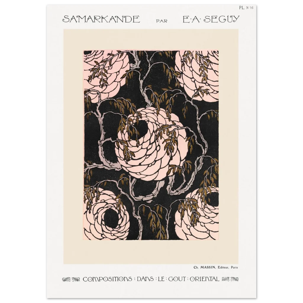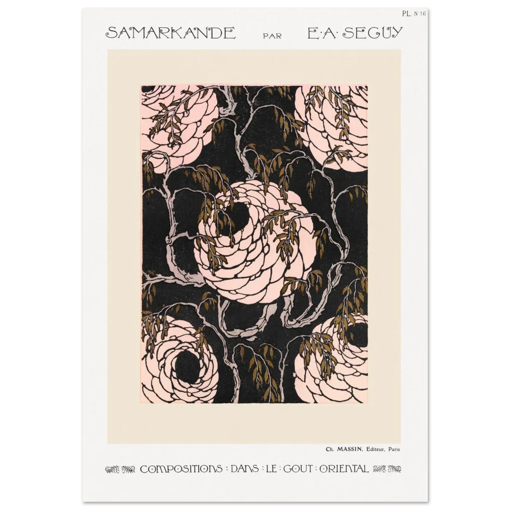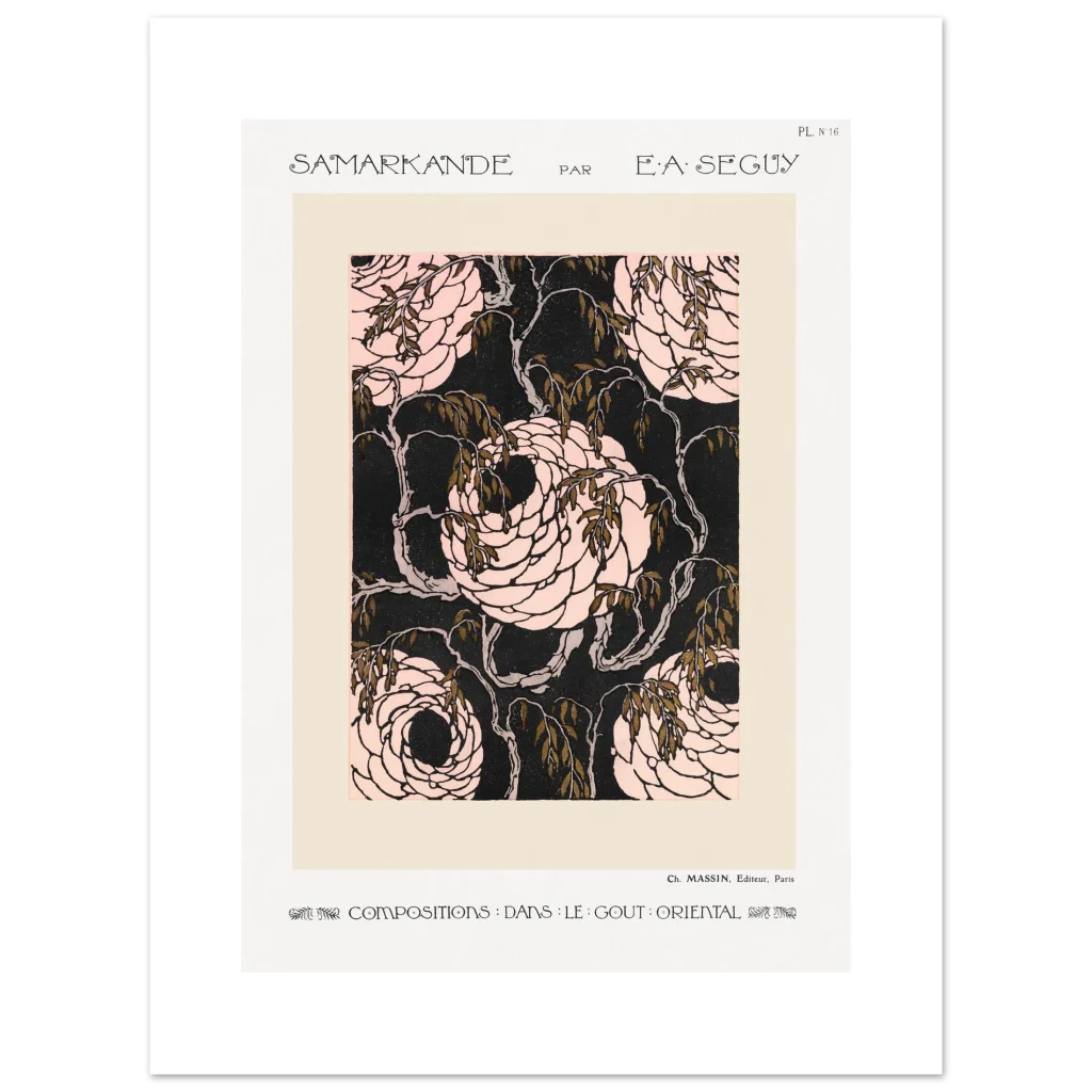 Immerse yourself in the enchanting world of Art Nouveau with our “Samarkande” floral poster. This exquisite piece, inspired by the ornate beauty of Oriental design, features elegantly swirling roses in delicate pinks against a striking dark background, accented with rich, olive-green leaves. It’s a timeless statement piece that brings a touch of historical elegance and sophisticated charm to any room, perfect for those who appreciate classic artistry with a bold modern edge.