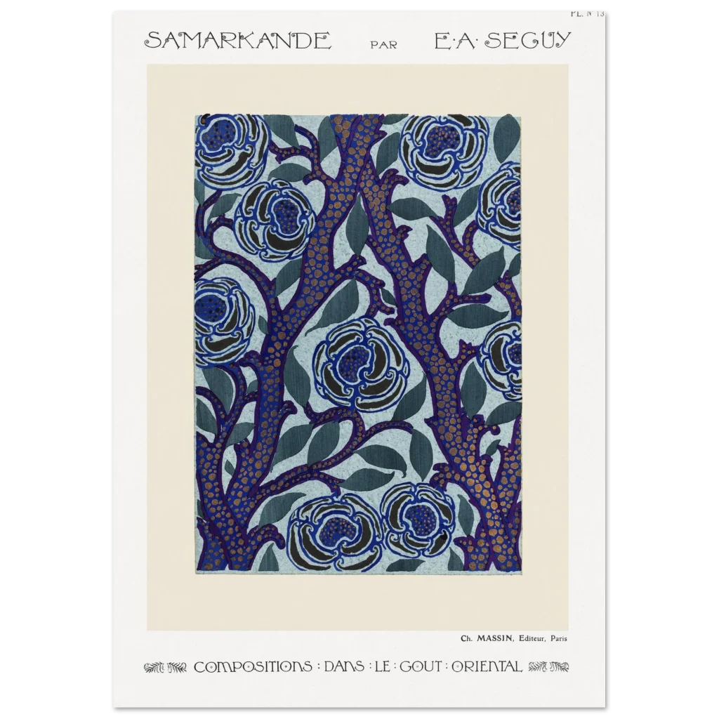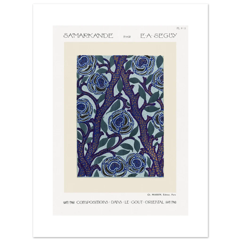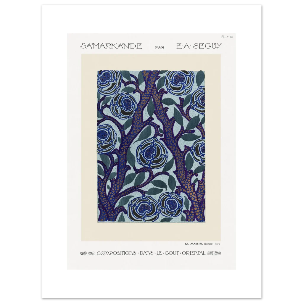 Immerse yourself in the enchanting allure of E.A. Séguy’s ‘Samarkande’ series with this exquisite Art Nouveau poster. Featuring a captivating design of stylized blue blooms intertwined with deep indigo branches dotted with golden accents, this piece brings a touch of opulent oriental elegance to any space. The rich color palette and intricate patterns create a visual feast, perfect for those who appreciate the beauty of classic art and sophisticated decor.