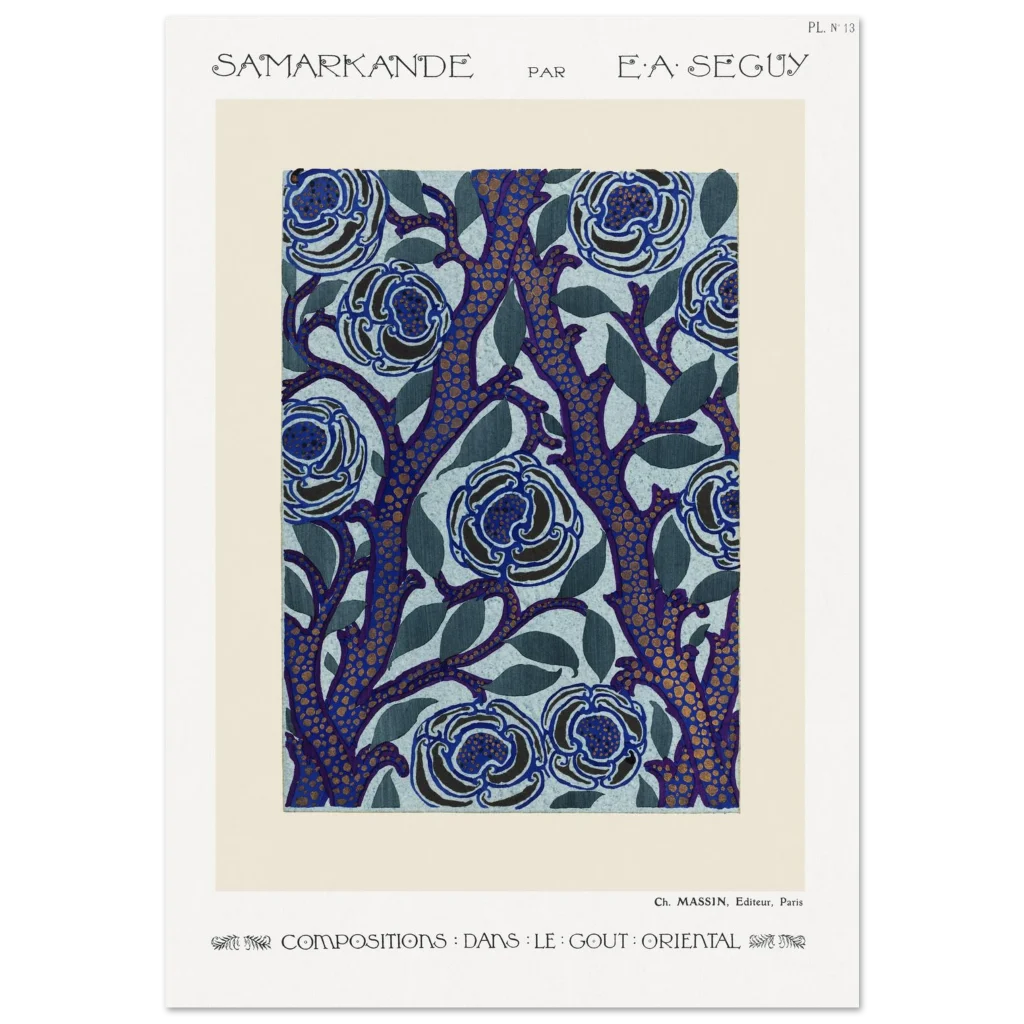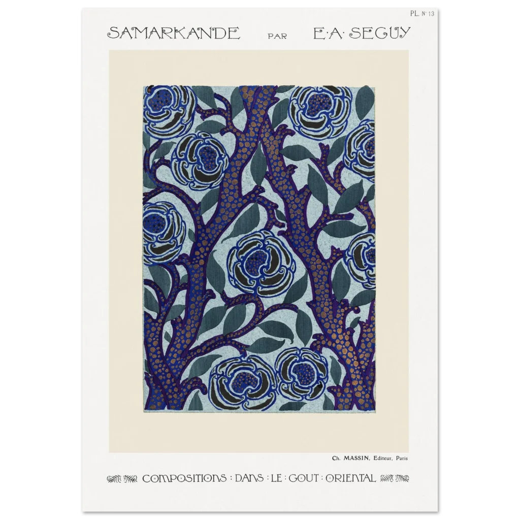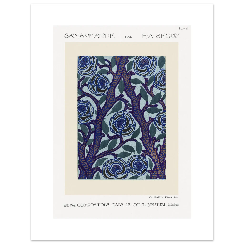 Immerse yourself in the enchanting allure of E.A. Séguy’s ‘Samarkande’ series with this exquisite Art Nouveau poster. Featuring a captivating design of stylized blue blooms intertwined with deep indigo branches dotted with golden accents, this piece brings a touch of opulent oriental elegance to any space. The rich color palette and intricate patterns create a visual feast, perfect for those who appreciate the beauty of classic art and sophisticated decor.