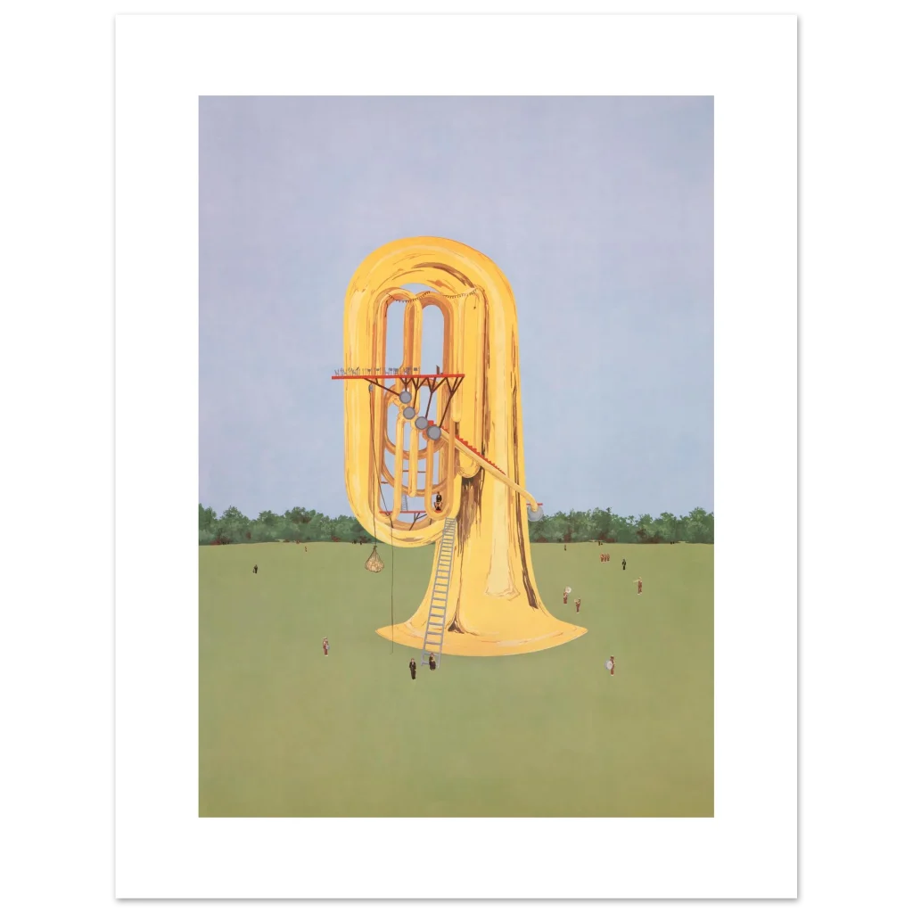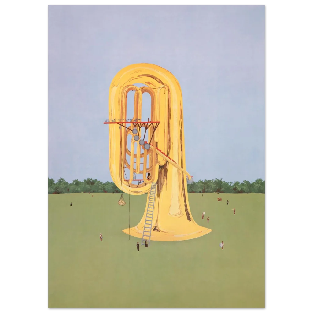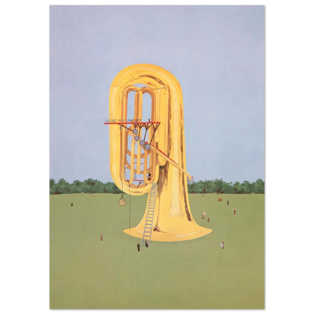 Step into a world where music transcends the ordinary with our Surreal Tuba Dreamscape poster. This captivating artwork features a monumental tuba, transformed into an architectural marvel, bustling with tiny figures creating a symphony of imagination. Its whimsical charm and subtle, inviting color palette of golden brass, soft green, and sky blue make it a unique statement piece for any art lover’s collection.