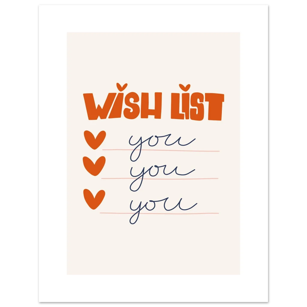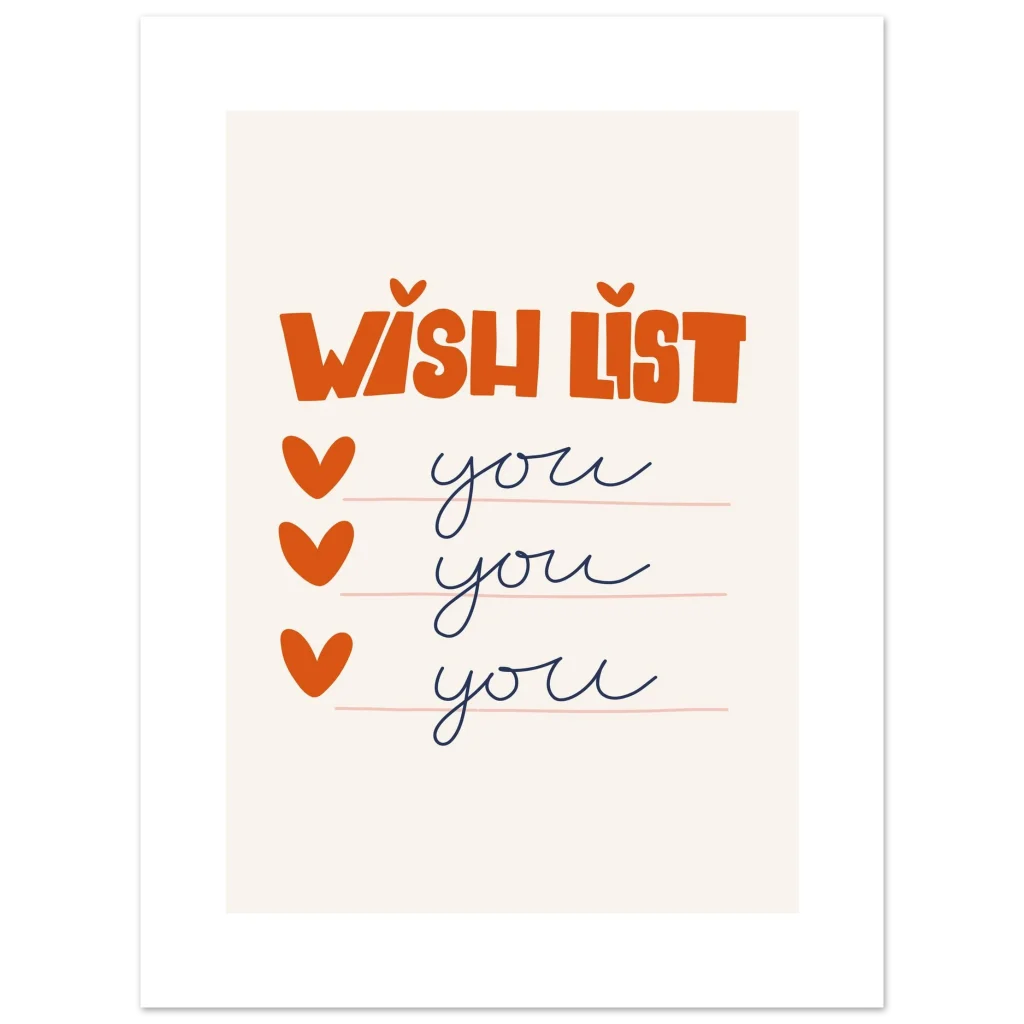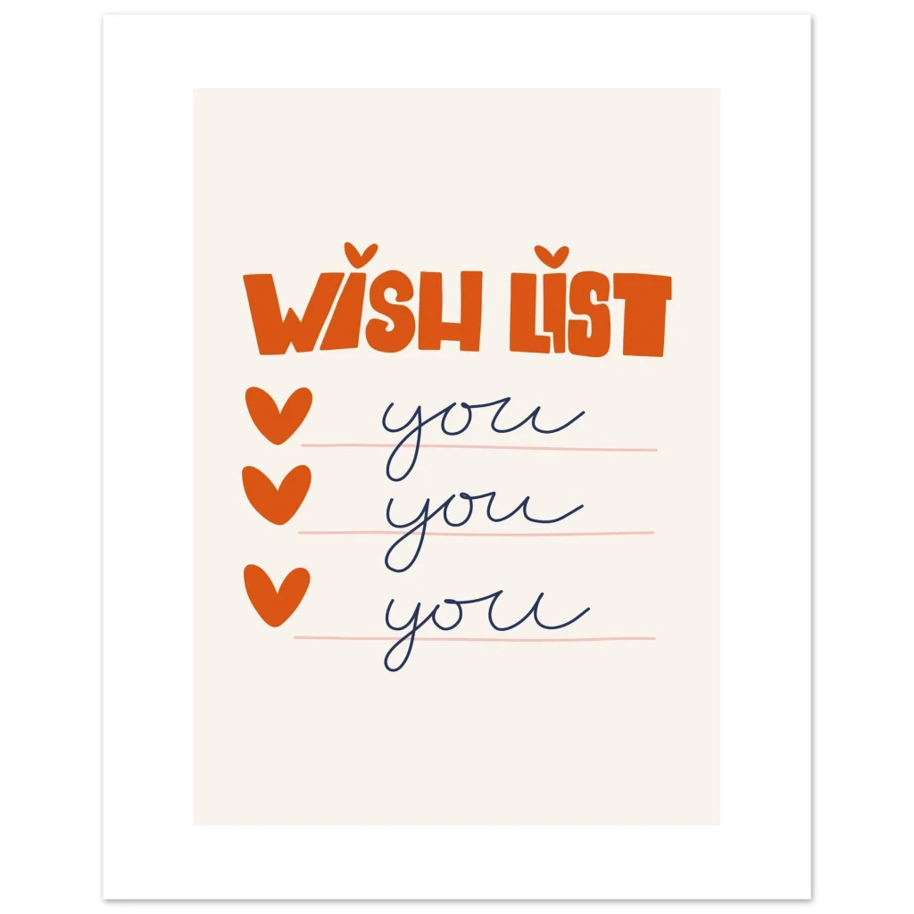 Express your affection with our charming “Wish List: You, You, You” poster, a delightful declaration of love for that special someone. Featuring a playful, hand-drawn aesthetic with warm orange typography and sweet heart checkmarks against a soft, neutral background, this piece radiates heartfelt joy and whimsical romance. It’s the perfect way to let someone know they’re at the top of your list, every single time.