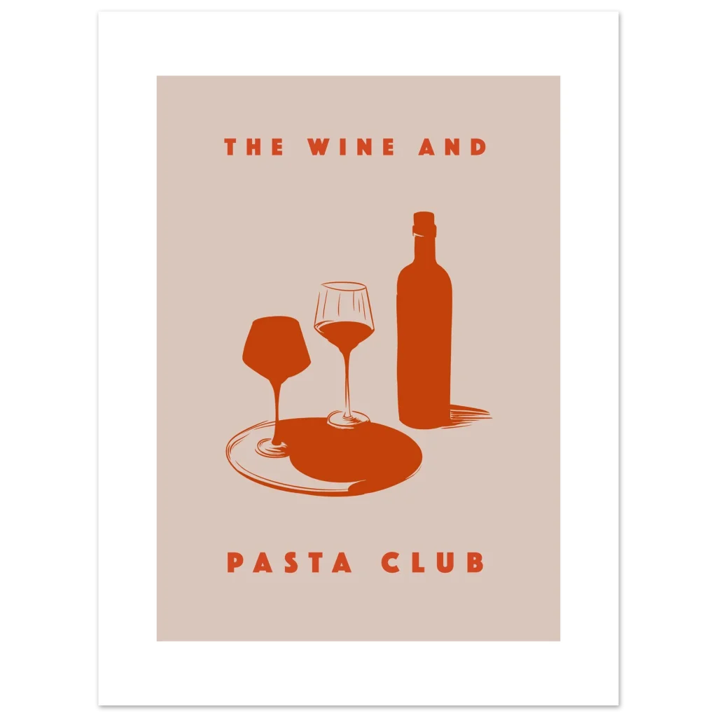 Raise a glass to the simple pleasures in life with “The Wine and Pasta Club” poster, an ode to gourmet delight and good company. This rustic chic artwork, featuring minimalist illustrations of a wine bottle, glasses, and a plate in a warm terracotta hue against a soft, muted background, brings a relaxed, inviting ambiance to any space. It’s the perfect statement piece for your dining room, kitchen, or home bar, celebrating the timeless joy of food and drink.