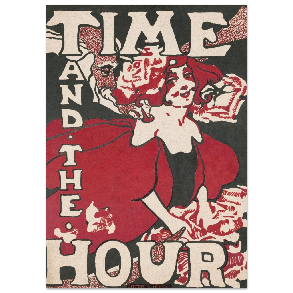 Capture the essence of classic Art Nouveau with our stunning ‘Time and the Hour’ poster. Featuring a captivating blend of deep reds, muted creams, and bold blacks, this design evokes a dramatic yet elegant mood perfect for adding a touch of vintage sophistication to any space. The intricate detailing and expressive figures, characteristic of the era, come alive on our luxurious matte paper, inviting viewers to ponder the fleeting beauty of time.