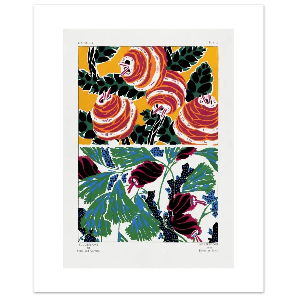 Bring a burst of vivacious color and Art Nouveau charm into your space with our Vibrant Abstract Floral Poster. Inspired by the striking patterns of E. A. Seguy, this premium matte paper poster features an eye-catching design of stylized botanicals in a rich palette of crimson, fiery orange, deep emerald, and electric blue, set against a warm yellow and crisp white background. Each detail, from the swirling petals to the dotted foliage, creates a captivating visual rhythm that will enliven any room.