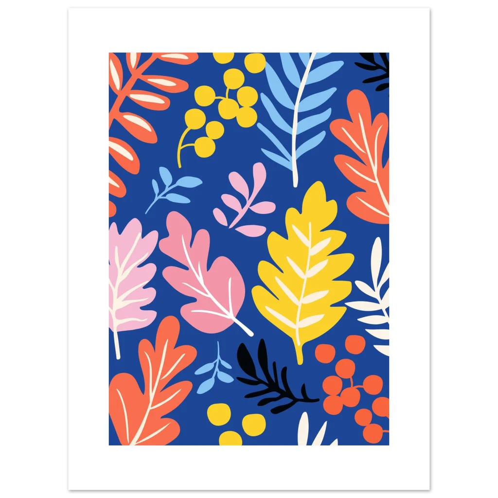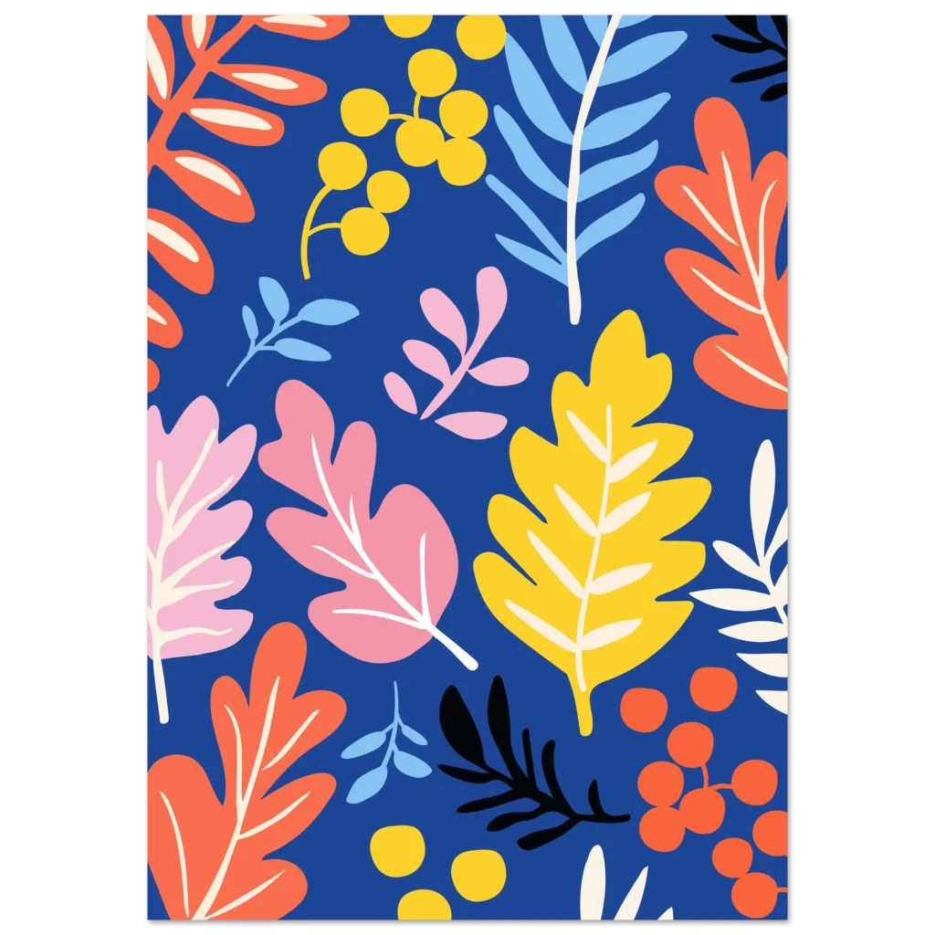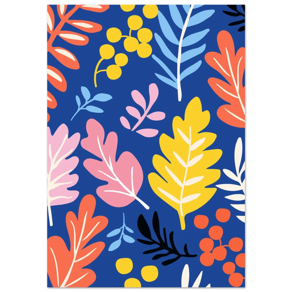 Infuse your space with a burst of joyous color and abstract charm! This vibrant poster features a playful array of stylized leaves and berries in a cheerful palette of coral, sunny yellow, soft pink, and sky blue, all set against a rich, calming indigo background. It’s a perfect piece to liven up any room, adding a modern, nature-inspired touch with an artistic flair.