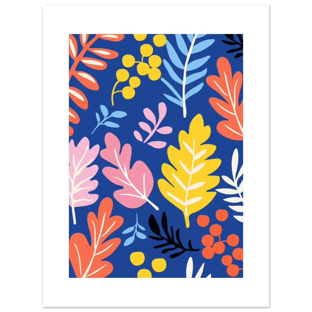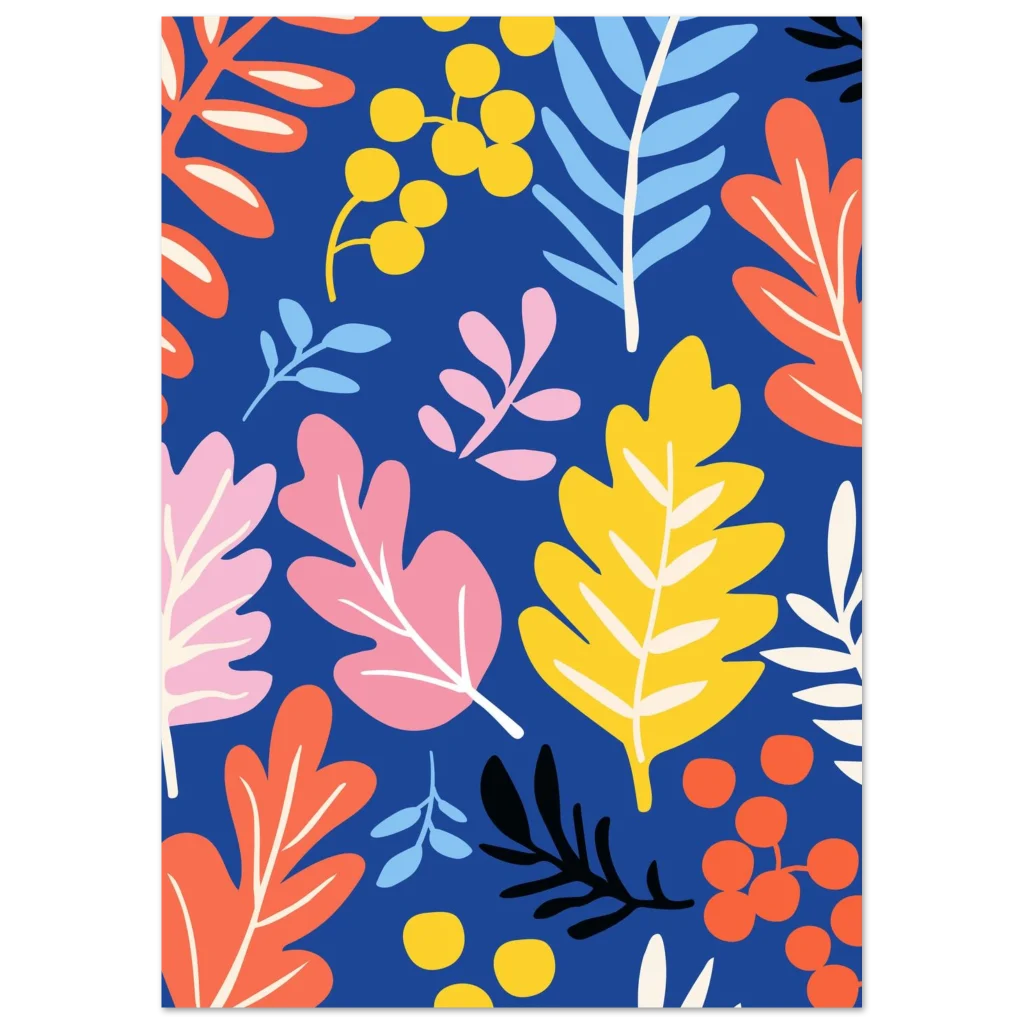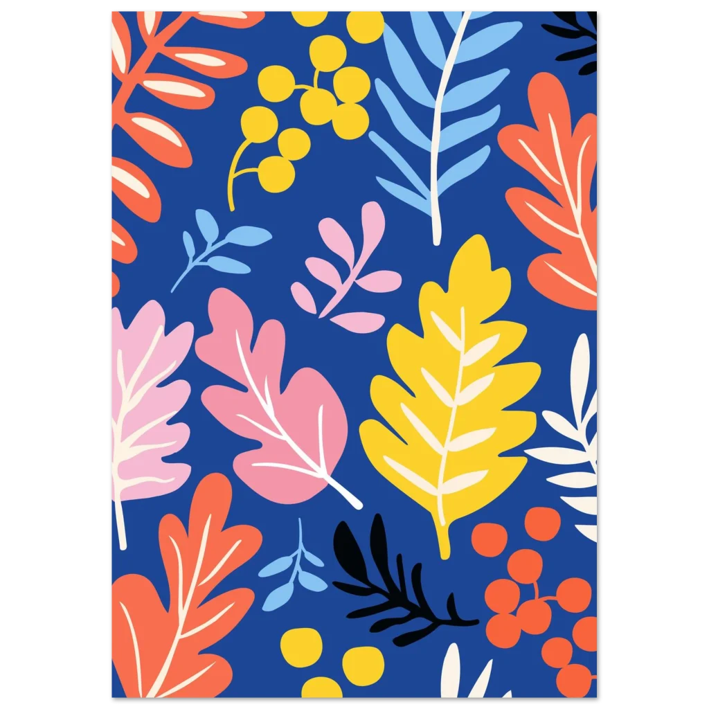 Infuse your space with a burst of joyous color and abstract charm! This vibrant poster features a playful array of stylized leaves and berries in a cheerful palette of coral, sunny yellow, soft pink, and sky blue, all set against a rich, calming indigo background. It’s a perfect piece to liven up any room, adding a modern, nature-inspired touch with an artistic flair.