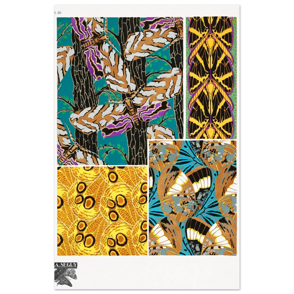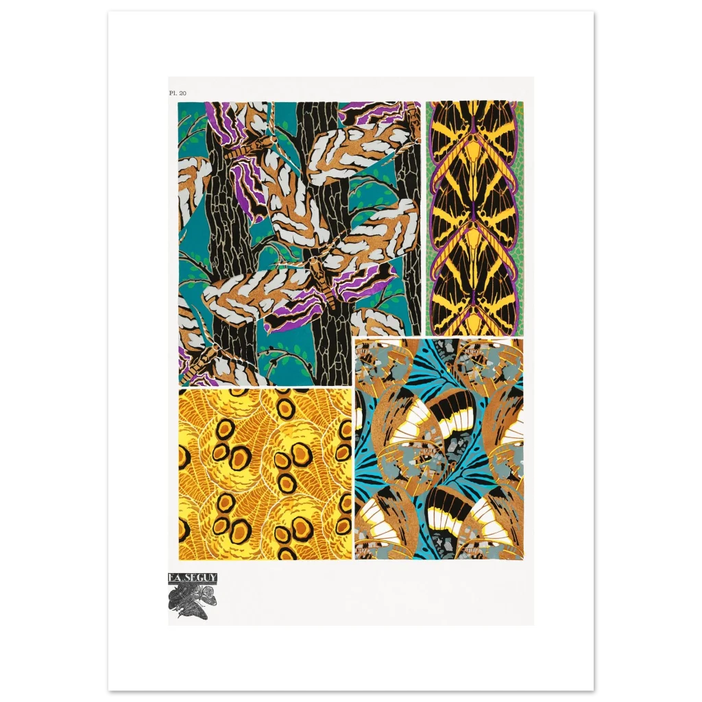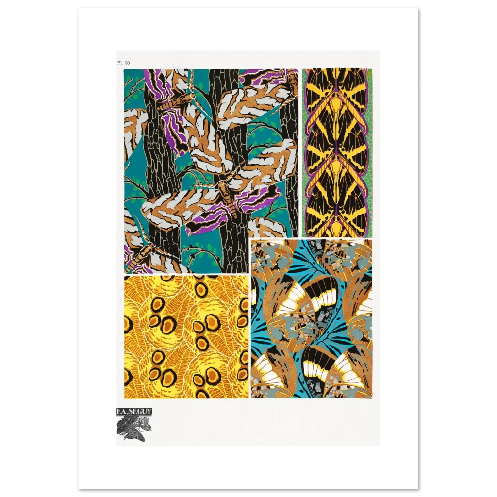Bring the captivating beauty of Art Nouveau into your space with this stunning butterfly wing pattern poster. Inspired by the intricate designs of F.A. Seguy, this print features a kaleidoscope of rich colors and organic lines, perfect for adding a touch of vintage elegance and natural wonder to any room. Its bold teal, gold, purple, and black palette creates a dramatic focal point that will enchant art lovers and nature enthusiasts alike.