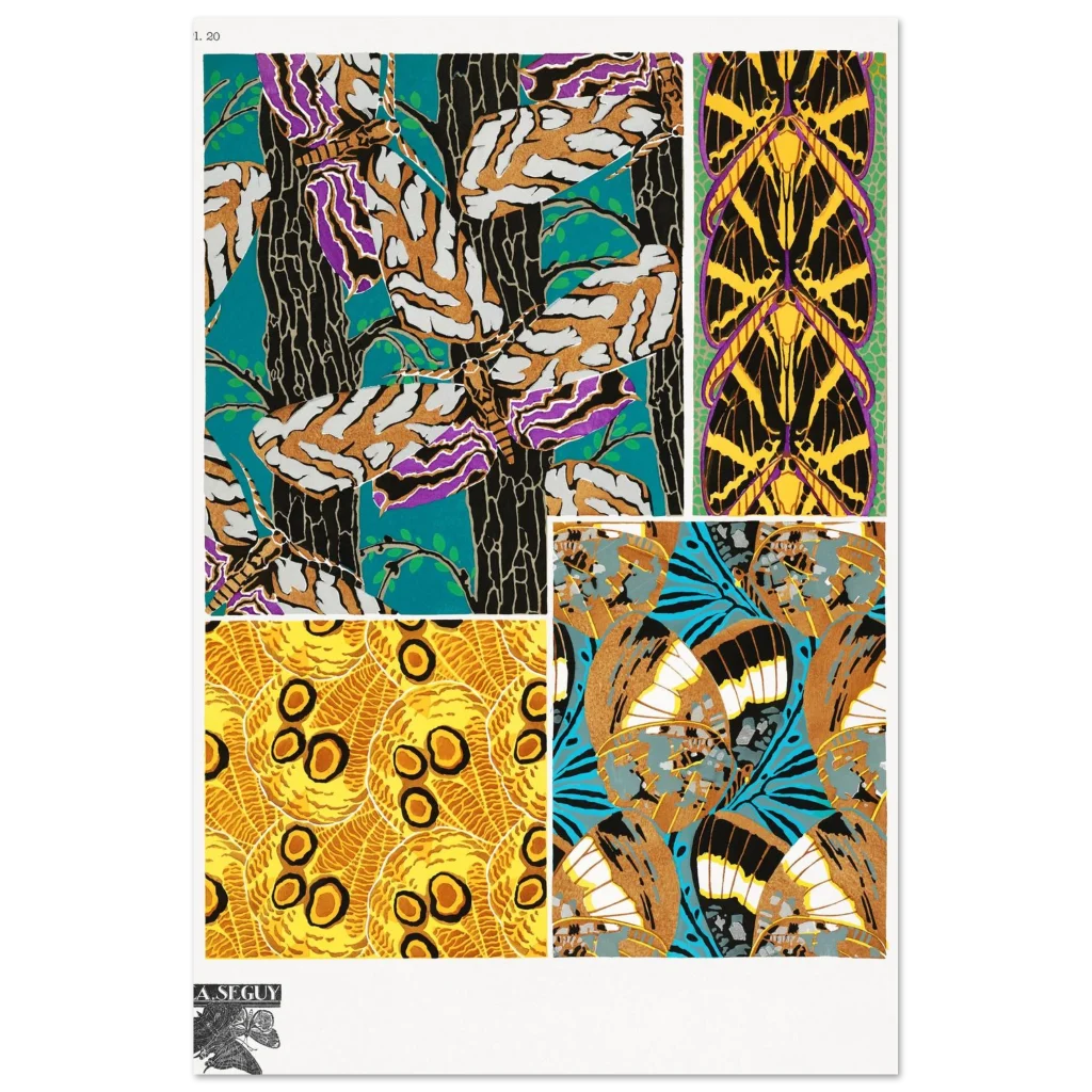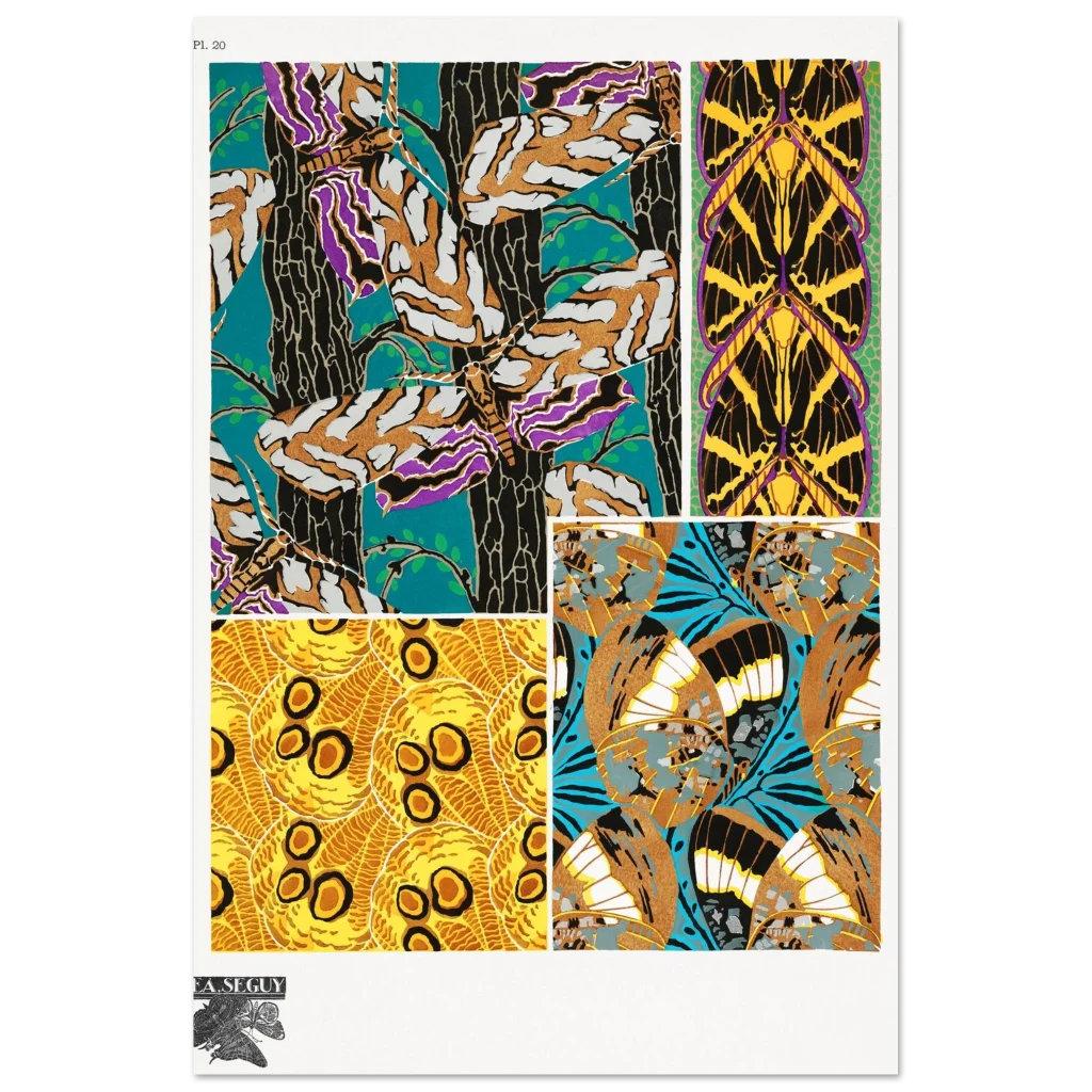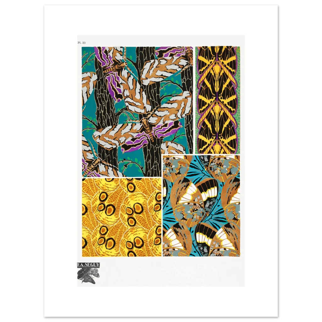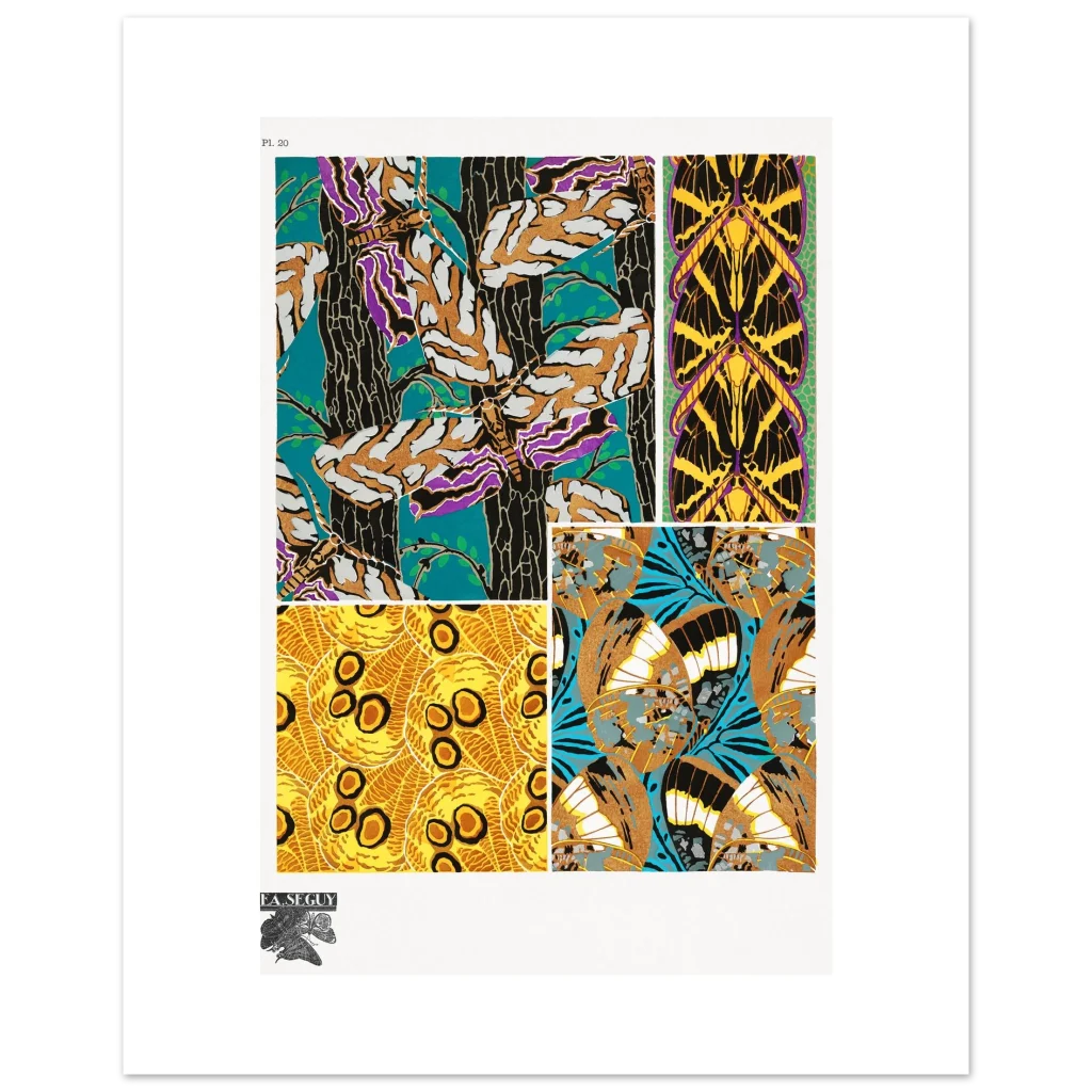 Bring the captivating beauty of Art Nouveau into your space with this stunning butterfly wing pattern poster. Inspired by the intricate designs of F.A. Seguy, this print features a kaleidoscope of rich colors and organic lines, perfect for adding a touch of vintage elegance and natural wonder to any room. Its bold teal, gold, purple, and black palette creates a dramatic focal point that will enchant art lovers and nature enthusiasts alike.